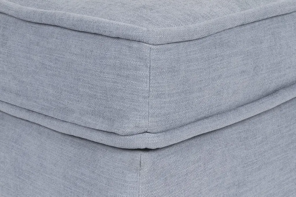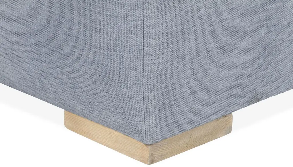 Designed by us and available only at One Kings Lane: Boasting a clean-lined silhouette, this ottoman is framed in reclaimed alder and set on block feet. Stylish on its own or as a module in a sectional, its fully upholstered body and tufted box-style cushion are covered in a durable woven fabric that mimics the look and feel of linen, while an ample fill of foam wrapped with Dacron and Trillium ensures long-lasting comfort.