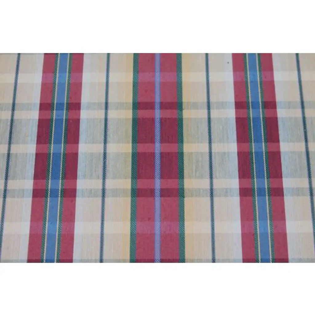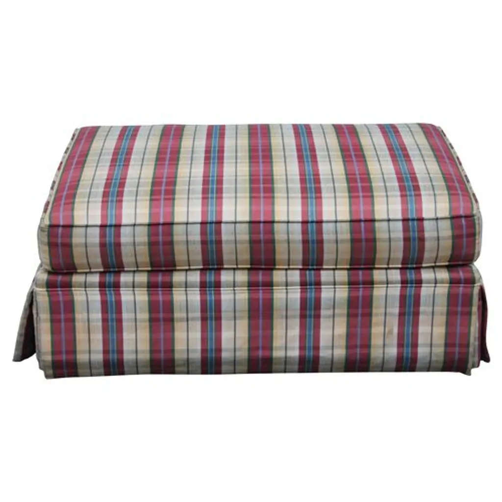 A large plaid ottoman. Upholstery is in very good condition. Colors are vibrant yellows, blues, reds, and greens.