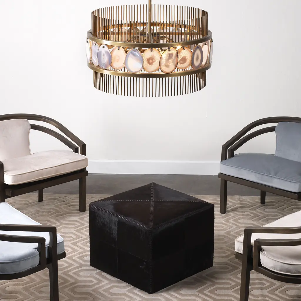 Kick up your heels on the Large Ottoman with leather stitching. Upholstered in smooth high-quality leather hide, this ottoman has a dark and moody design that is amplified with incredibly luxurious materials. The panels of this piece are stitched together with contrast leather thread to give this piece a more angular shape.