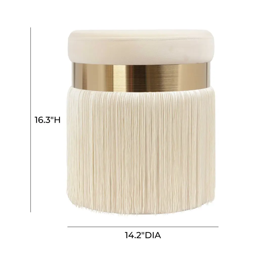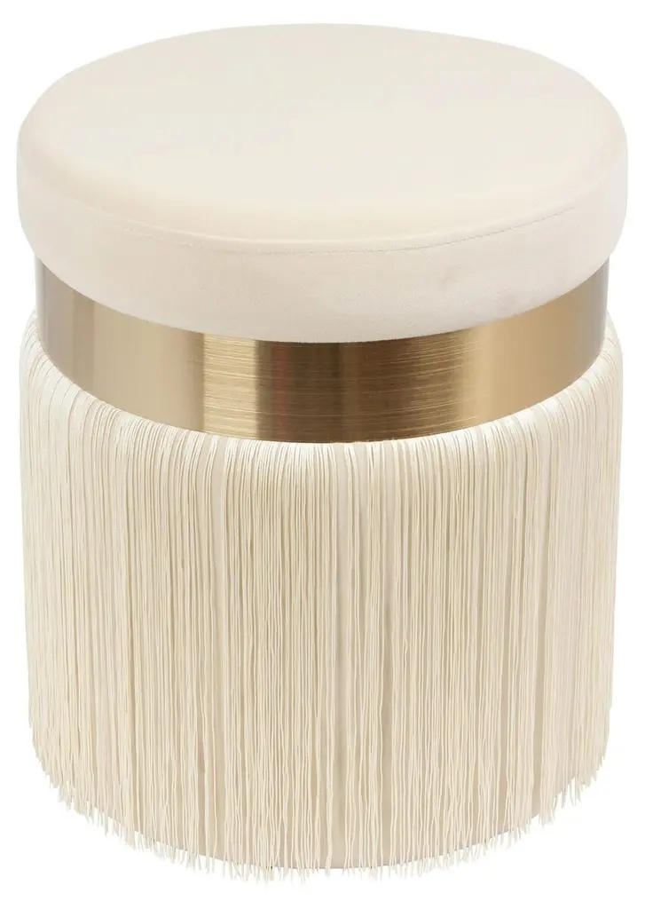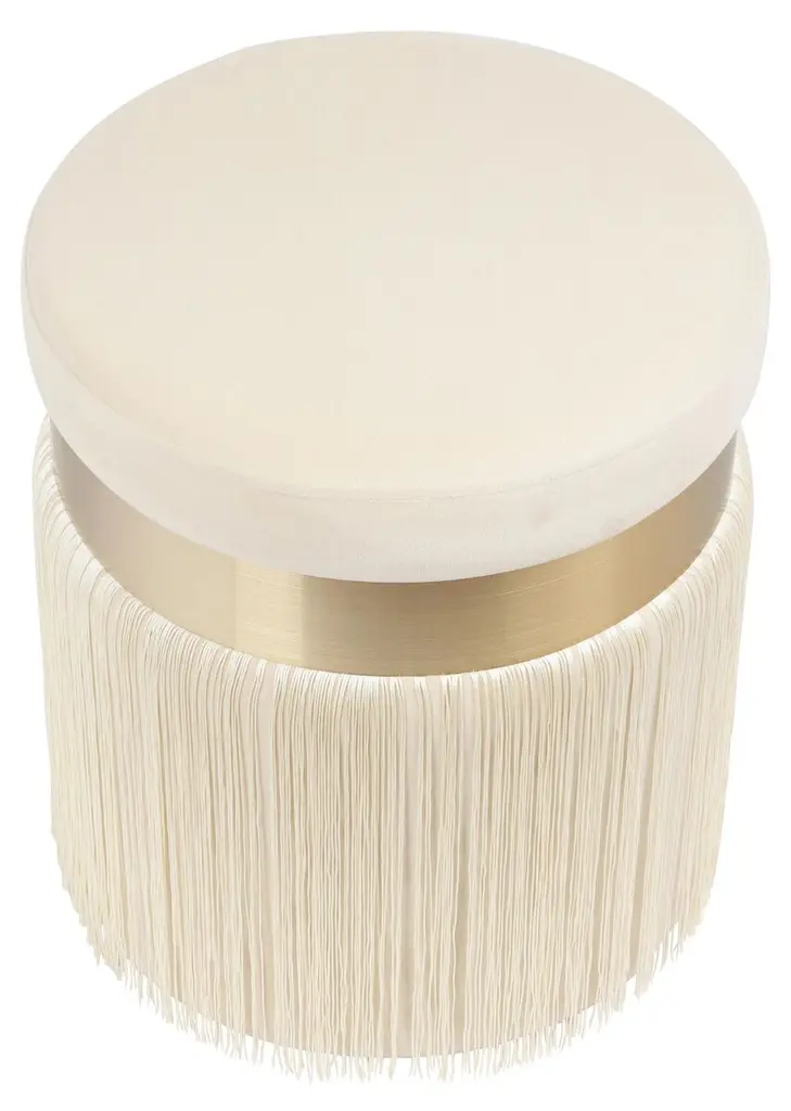 Thick fringe, velvet upholstery, and brushed-brass trim give this handcrafted ottoman Hollywood Regency chic. Whether you use it as a footstool, extra seating, or when topped with a tray, an occasional table, it will bring glamour to a room.