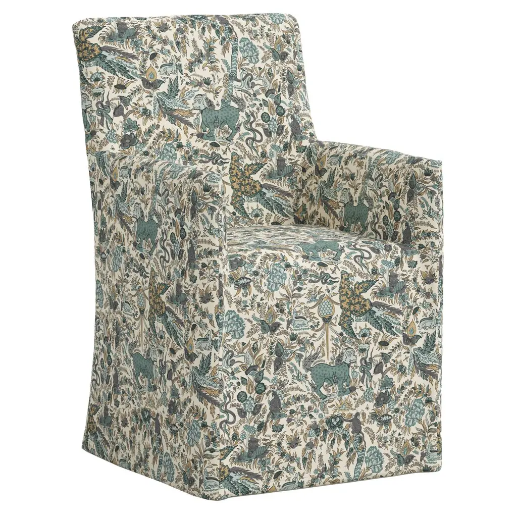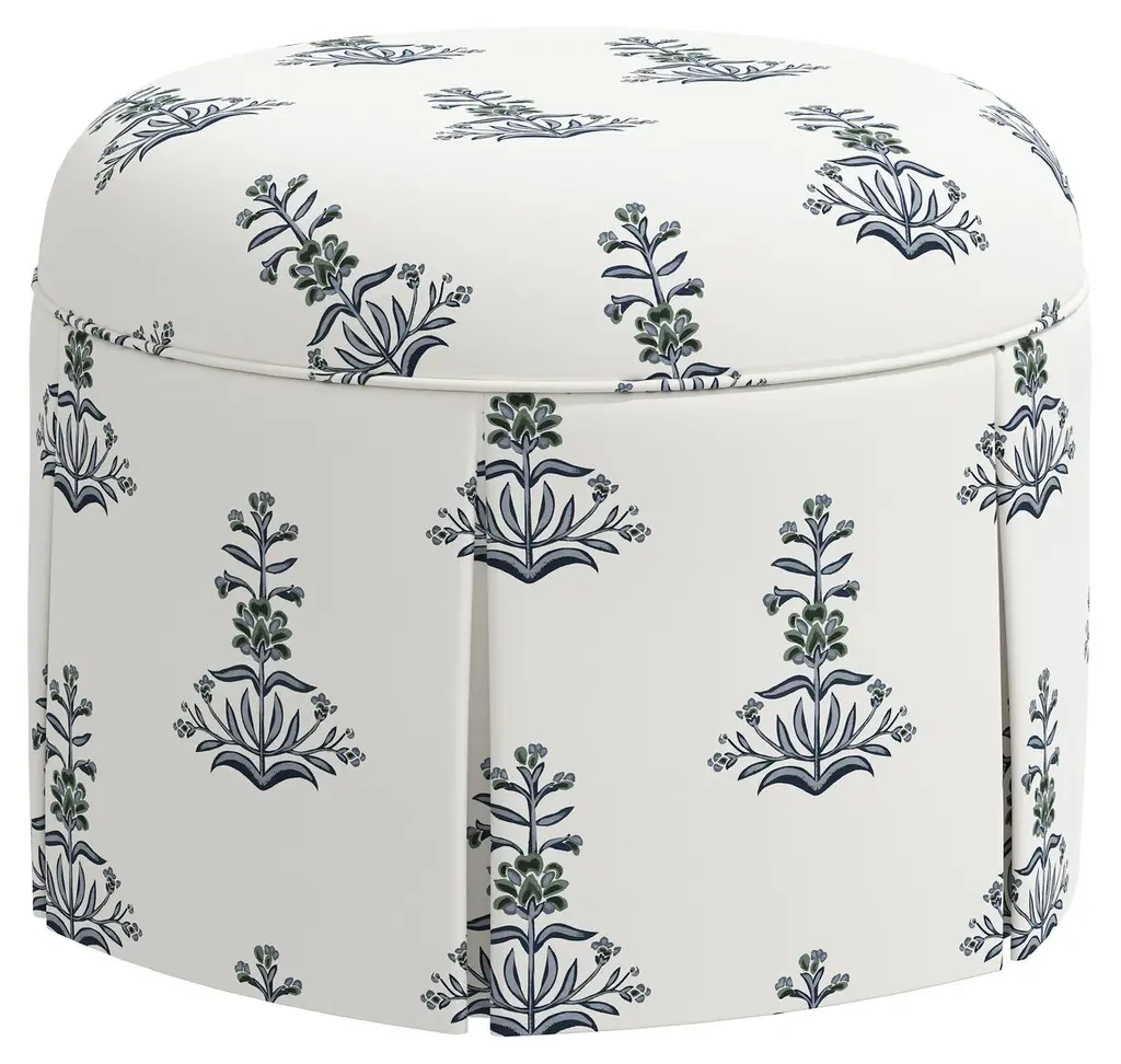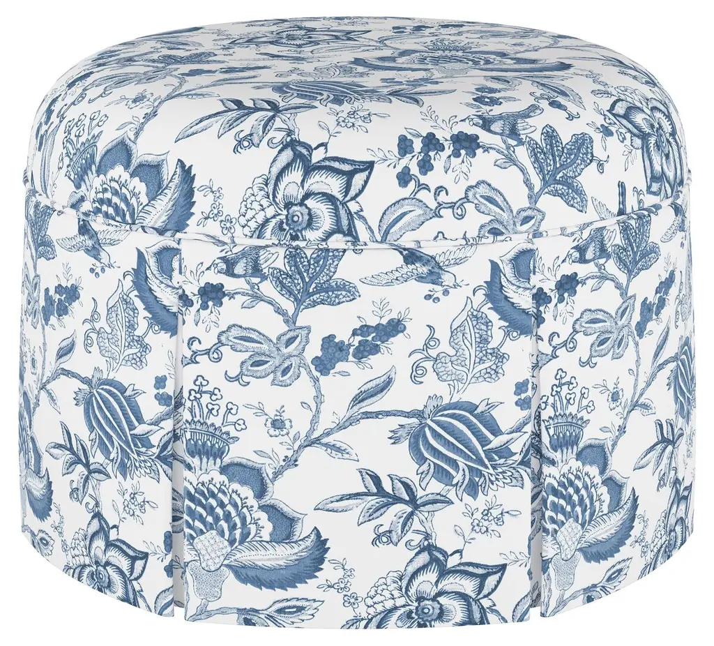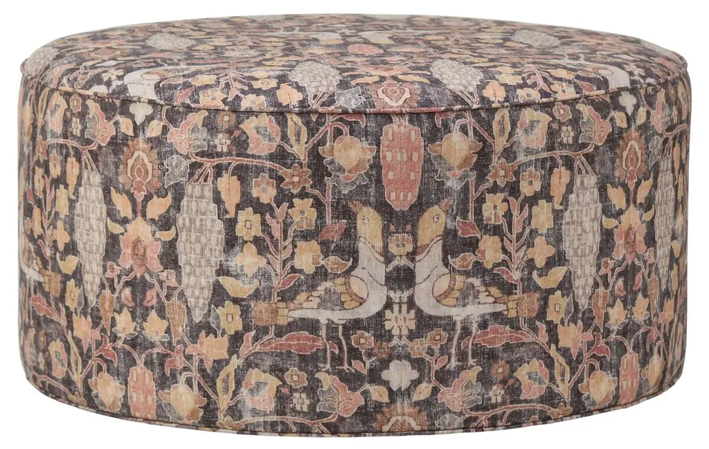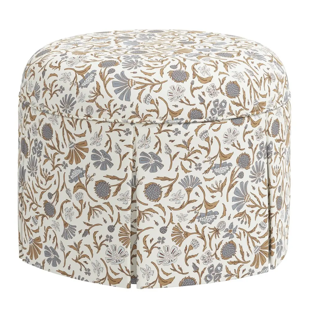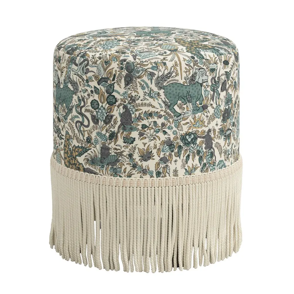 Add a charming hand upholstered skirted ottoman to deliver a bit more flair to your living area or private space. This wonderfully versatile piece of furniture makes sense for almost any area of the home. The exquisite Bali Lion upholstery print is carefully arranged and serves as a marvelous decorative detail, while the solid construction and circular shape provide a foundation for longevity. A terrific accent piece.