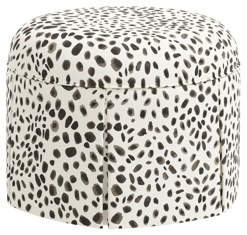 Exclusive to One Kings Lane: With its kick-pleat skirt and painterly animal print, this round ottoman makes a chic addition to just about any space. Ample padding makes it a comfortable perch; it can also serve as a footrest or, when topped with a tray, an occasional table.