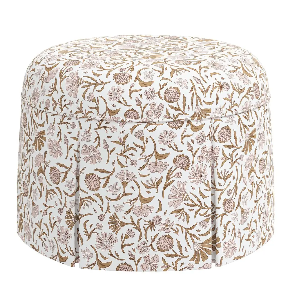 Exclusive to One Kings Lane: With its kick-pleat skirt and block-print-inspired floral print, this round ottoman is a welcome addition to just about any space. Ample padding makes it a comfortable perch; it can also serve as a footrest or, when topped with a tray, an occasional table.