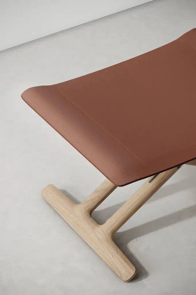 The concept of a folding chair is revisited in an elegant, timeless profile meticulously crafted in wood and saddle leather. Its design allows for ease of use for all occasions and voyages. The complementing ottoman completes the lounge set and is realized with the same long-lasting materials.PRODUCT MATERIALOak frame / Leather seat & backrest