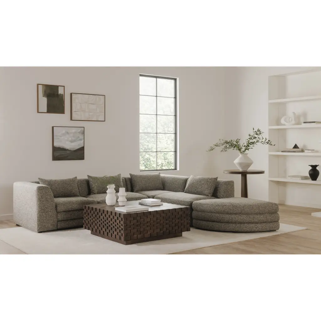 Influenced by the playful forms of the 1970s, the Lowtide curved ottoman showcases a layered appearance that promotes comfort. Its vintage influence and understated elegance are enhanced by the use of textured fabric. On its own or combined as a modular sectional, this piece adds visual interest while allowing for creative arrangement possibilities.