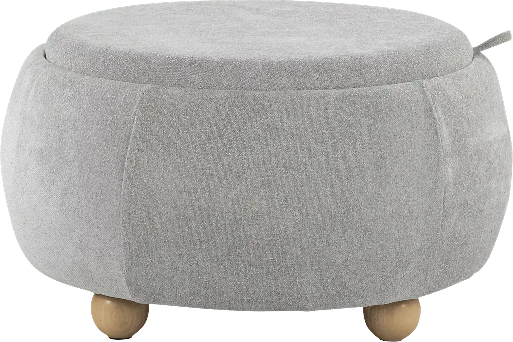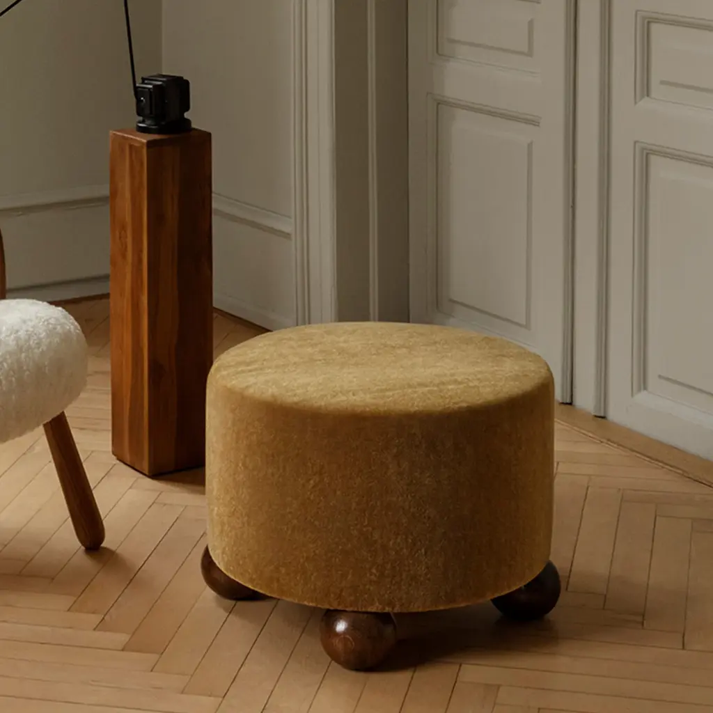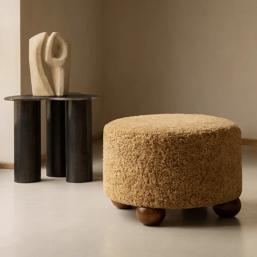 The Luupo Ottoman offers a versatile and stylish seating option with a round form resting on solid oak or walnut ball feet. It is upholstered in sheepskin or high-performance fabric. Constructed using traditional joinery methods, the frame is solid beech wood with foam cushioning. Its compact design makes it suitable as a footstool, side table, or extra seating.