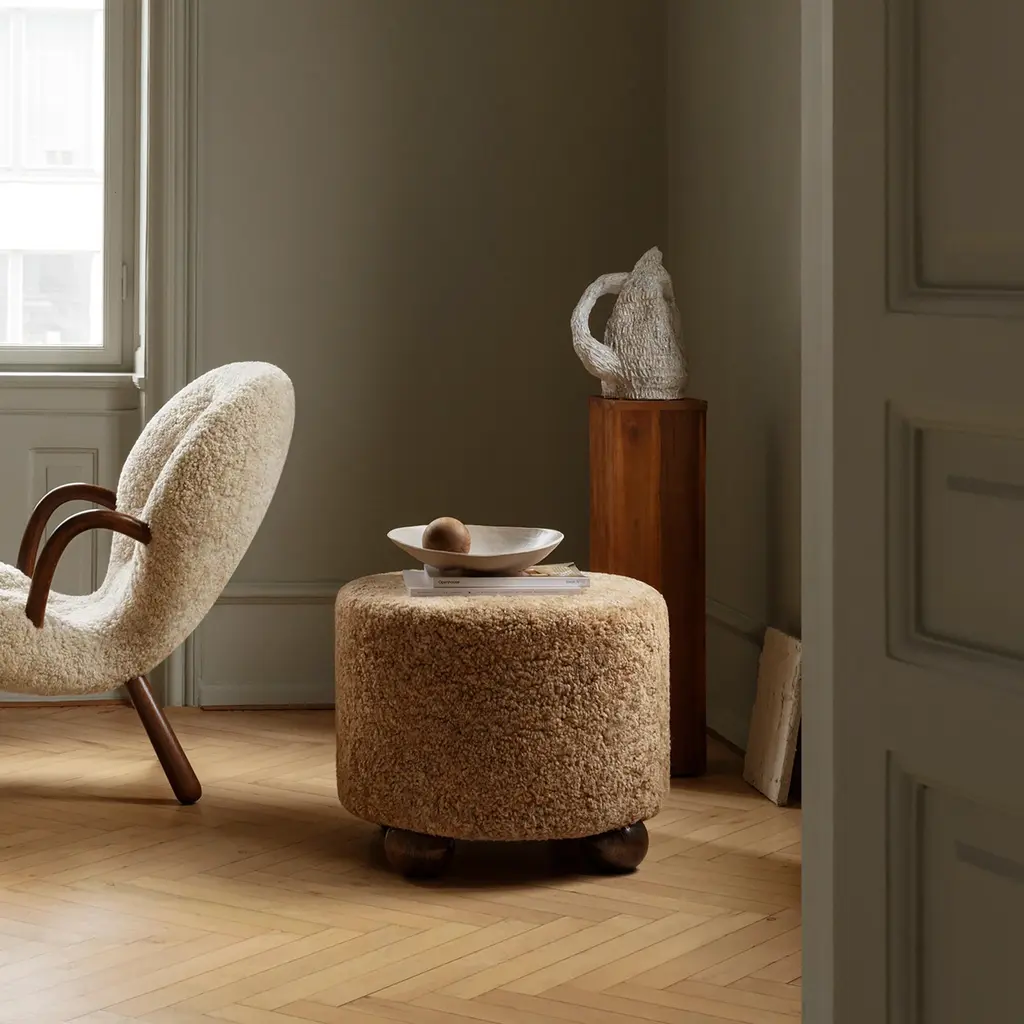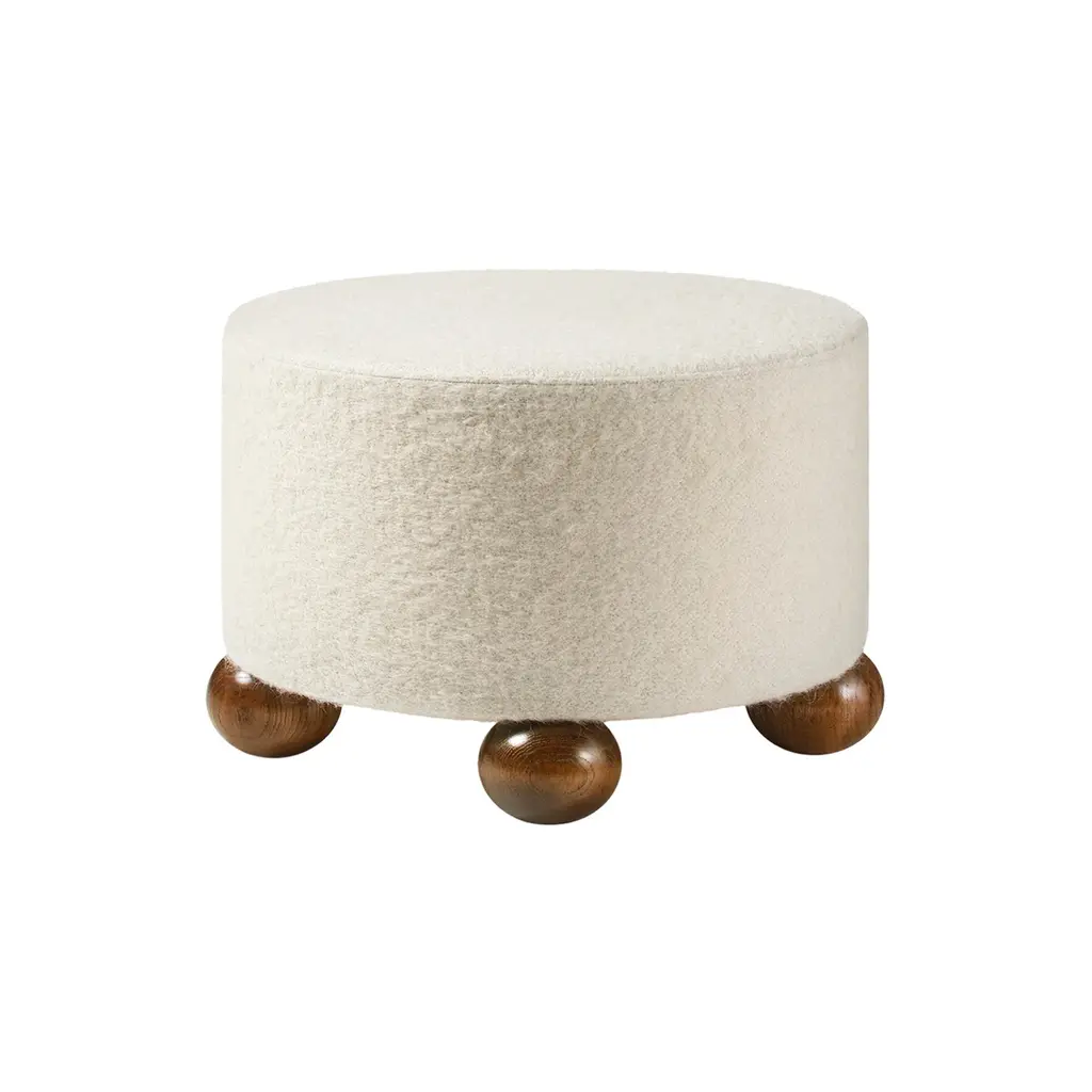 The Luupo Ottoman offers a versatile and stylish seating option with a round form resting on solid oak or walnut ball feet. It is upholstered in sheepskin or high-performance fabric. Constructed using traditional joinery methods, the frame is solid beech wood with foam cushioning. Its compact design makes it suitable as a footstool, side table, or extra seating.