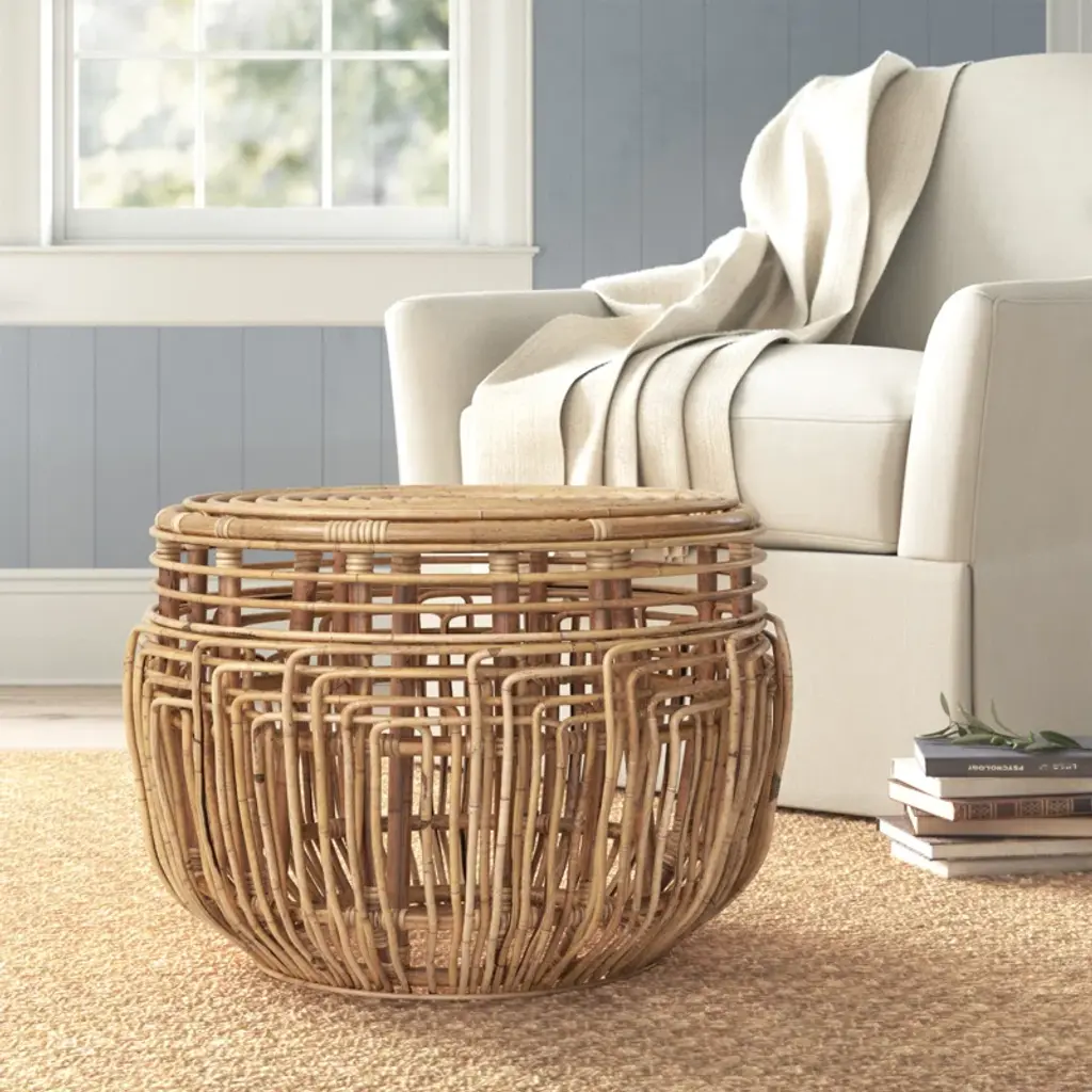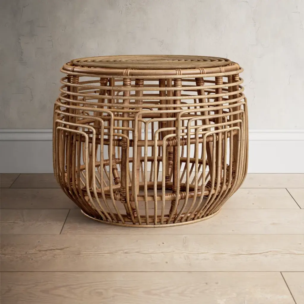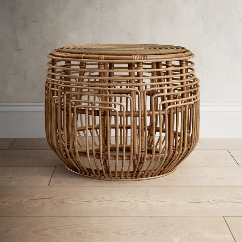 A breezy British Colonial classic is transformed for today’s modern tropical décor in this fabulous Manda Ottoman. Easily doubling as an end table in coastal-chic interiors, Manda's honey brown wash rattan brings rich visual depth to its ancient drum-inspired silhouette.