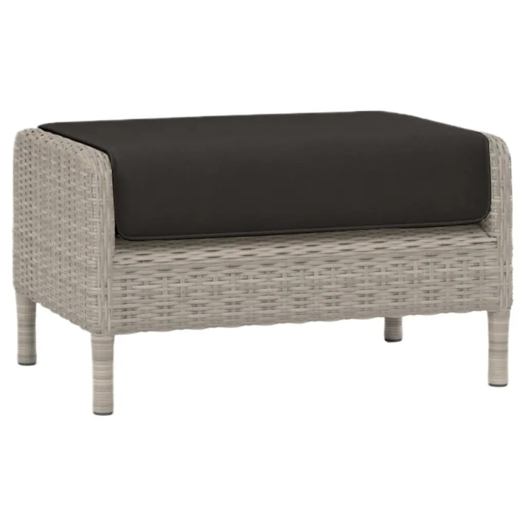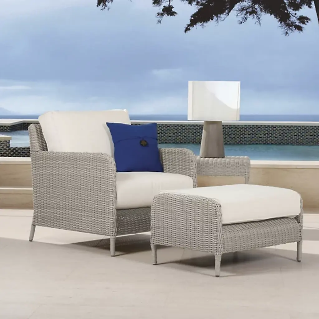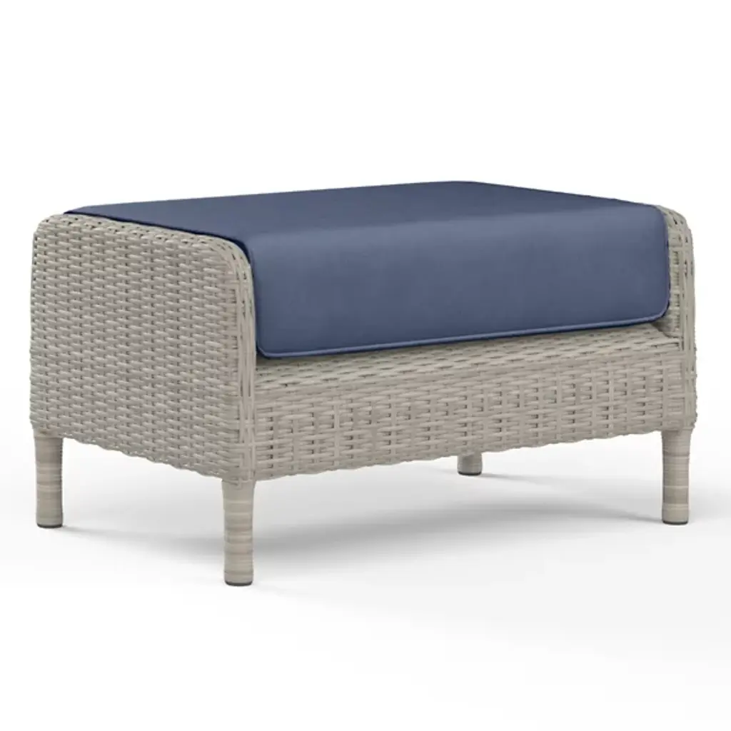 The Manhattan Outdoor Ottoman from Sunset West introduces curved geometries that soften traditional outdoor seating arrangements. Its post legs lift the woven frame off the ground, creating airiness beneath the gently rounded form. The ottoman's curved edges contrast with more angular furniture pieces, adding organic flow to rigid geometric layouts. Wrapped in textured wicker weaving, the piece serves both as additional seating and as a complement to lounge chairs. The design balances structural integrity with graceful curves that invite relaxation.
