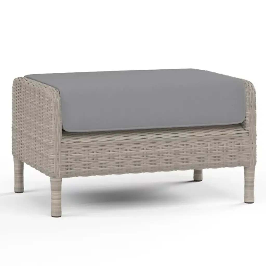 The Manhattan Outdoor Ottoman from Sunset West introduces curved geometries that soften traditional outdoor seating arrangements. Its post legs lift the woven frame off the ground, creating airiness beneath the gently rounded form. The ottoman's curved edges contrast with more angular furniture pieces, adding organic flow to rigid geometric layouts. Wrapped in textured wicker weaving, the piece serves both as additional seating and as a complement to lounge chairs. The design balances structural integrity with graceful curves that invite relaxation.