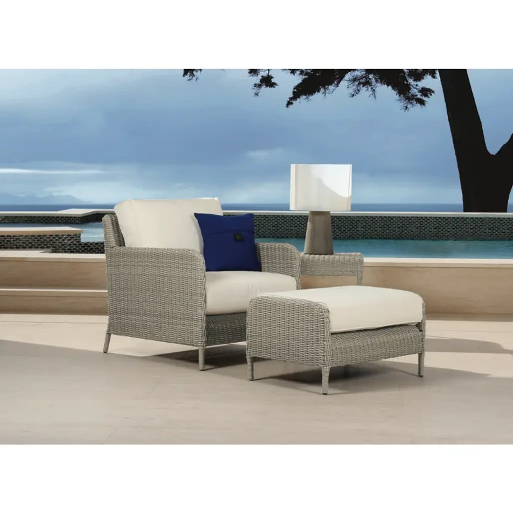 "The Manhattan Ottoman from Sunset West incorporates organic curves and sleek lines for a transitional take on outdoor living. Featuring sleek post legs, its elegantly curved frame is expertly wrapped in all-weather premium resin wicker in Dove Grey. - Fully welded powder-coated aluminum frame - Wrapped in virgin PE Resin Wicker in Dove Grey - Sunset West Progressive Springing System Technology - Weather resistant, high-resiliency foam cushions - Stocked in Premium Sunbrella fabric in Linen Canvas - Non-marking plastic glides - Commercial Quality Construction - Custom Cushions available in approx. 4 weeks. Manhattan is a part of the Driftwood color story, and coordinates well with Laguna, Coastal Teak, and other items from the Bazaar."