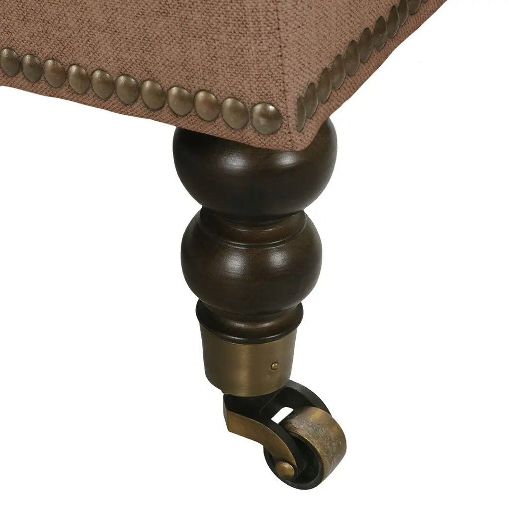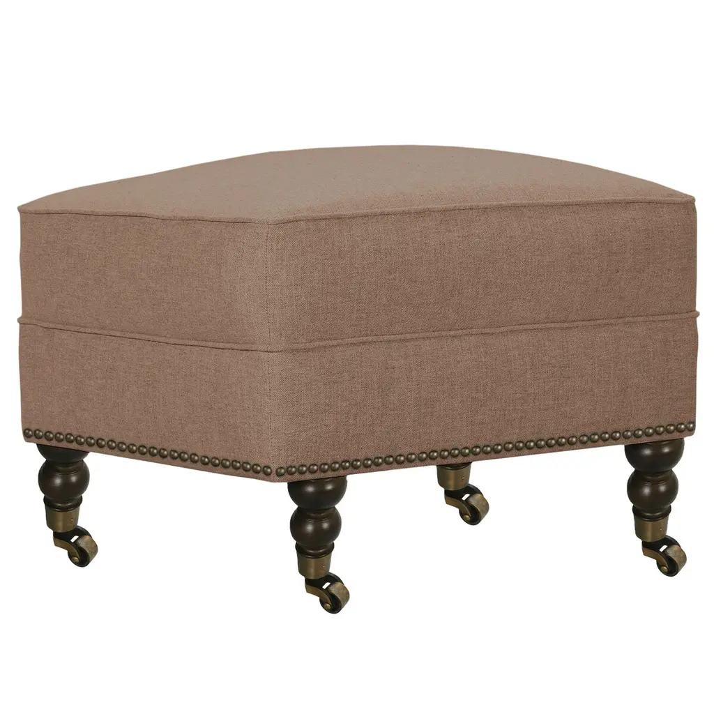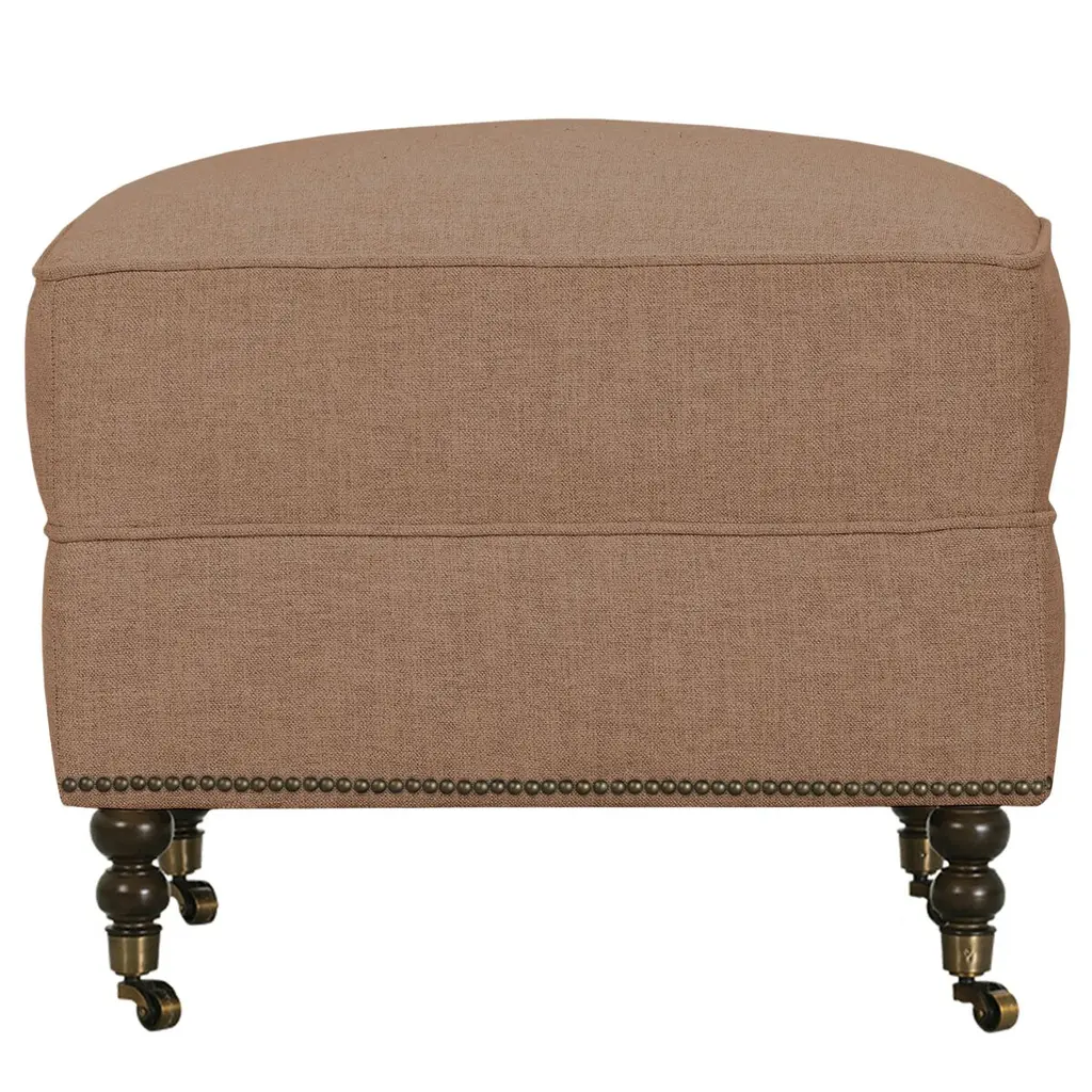 Exclusive to One Kings Lane: Combining timeless elegance with exceptional comfort, the Margot Linen-Blend Ottoman is a statement of sophisticated style. Upholstered in a refined linen-blend fabric, the ottoman features brass nail-head trim and beautifully turned legs, exuding classic charm. With plush feather-and-down cushioning, the Margot offers supreme comfort, making it perfect for relaxing or as an additional seating option. Also of note:• Brass casters complement the nail-head detailing, allowing for easy mobility without scratching floors.• Crafted with a kiln-dried hardwood frame, ensuring durability and strength for years of use.