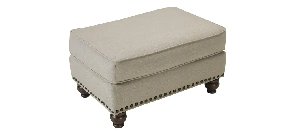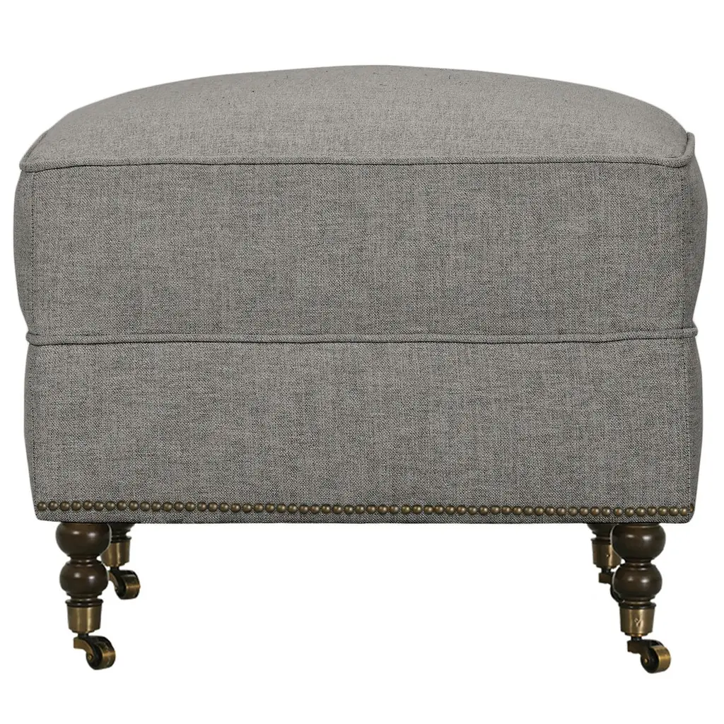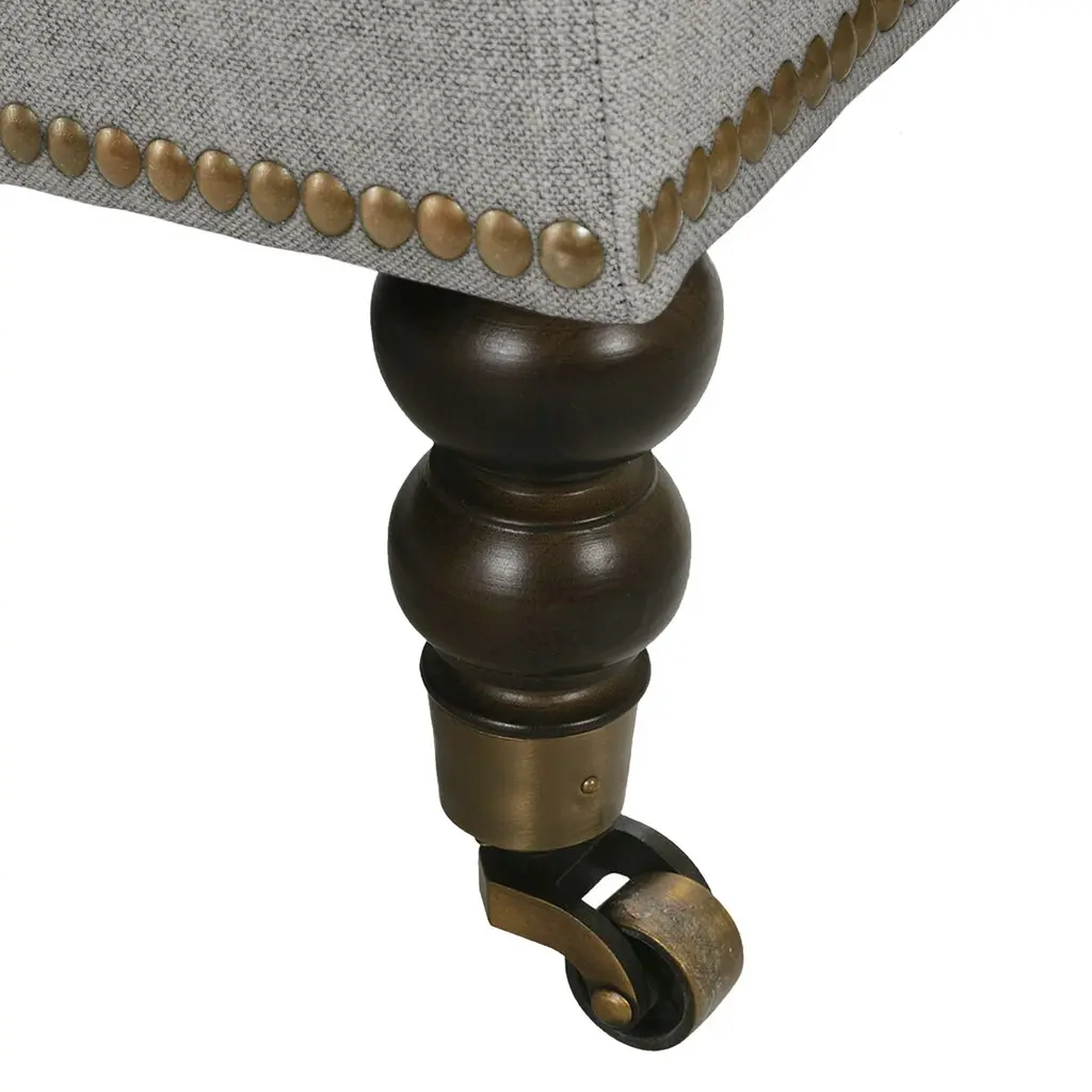 Exclusive to One Kings Lane: Combining timeless elegance with exceptional comfort, the Margot Linen-Blend Ottoman is a statement of sophisticated style. Upholstered in a refined linen-blend fabric, the ottoman features brass nail-head trim and beautifully turned legs, exuding classic charm. With plush feather-and-down cushioning, the Margot offers supreme comfort, making it perfect for relaxing or as an additional seating option. Also of note:• Brass casters complement the nail-head detailing, allowing for easy mobility without scratching floors.• Crafted with a kiln-dried hardwood frame, ensuring durability and strength for years of use.