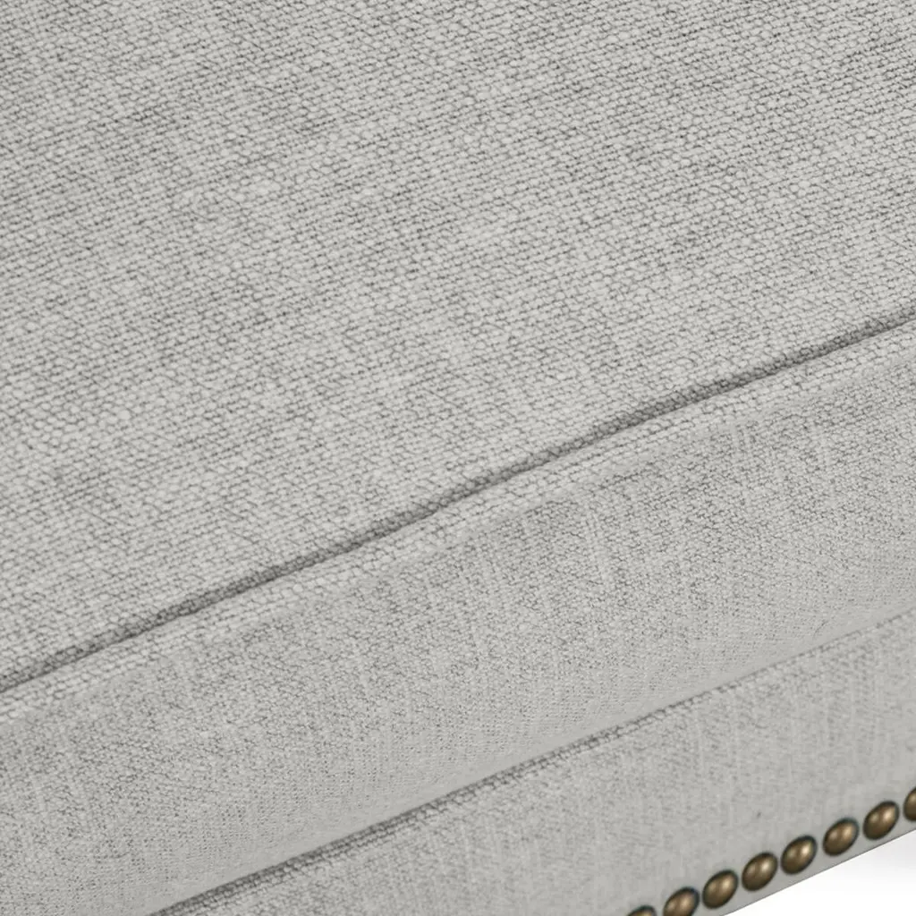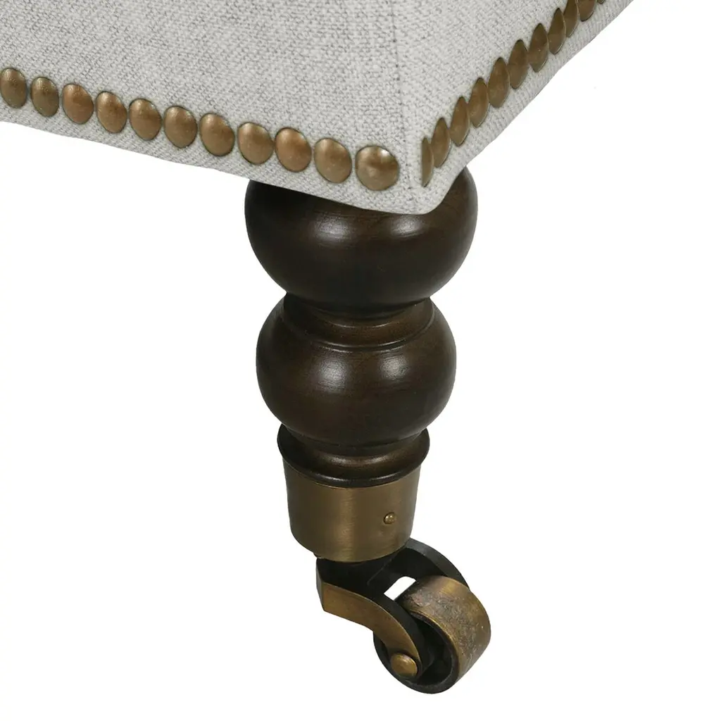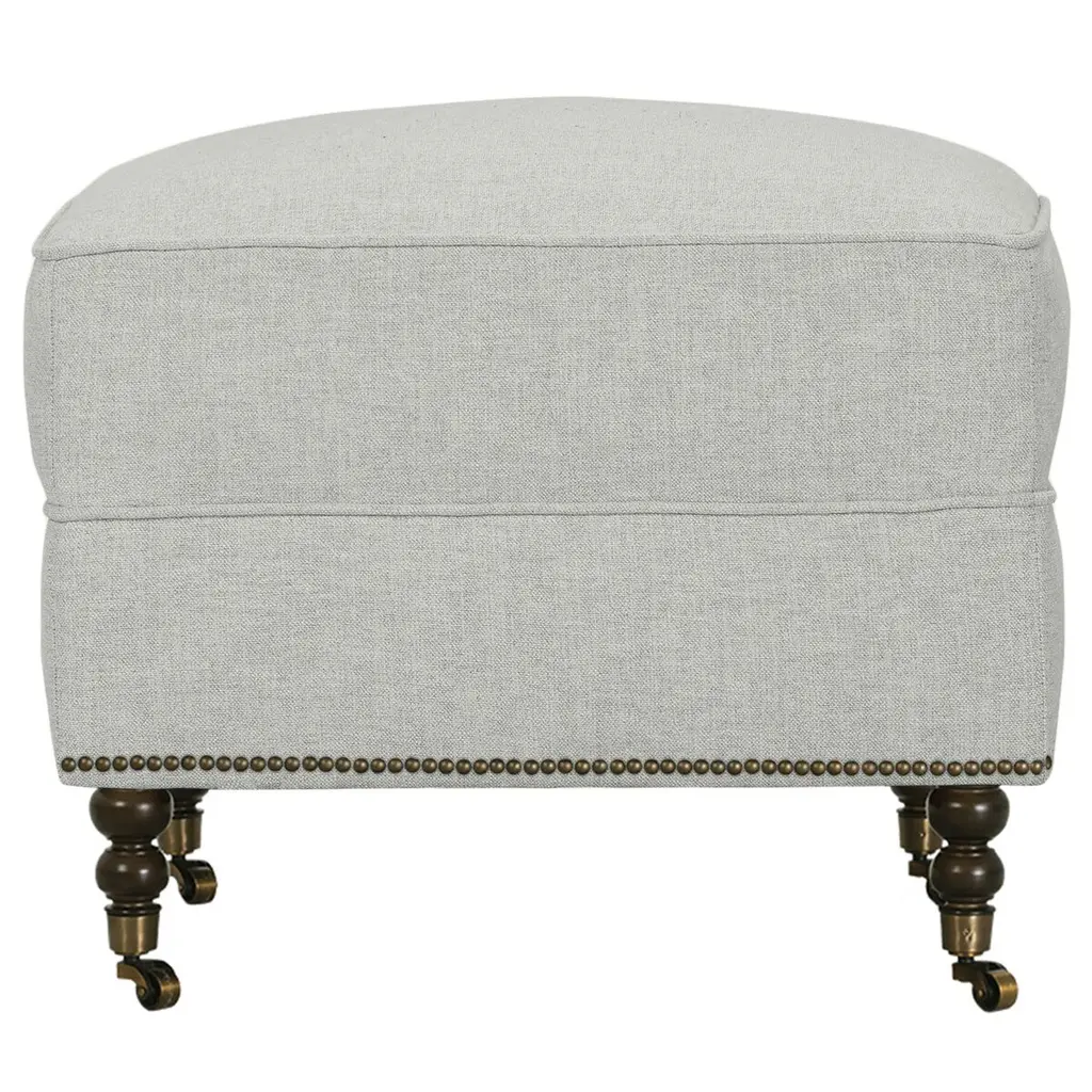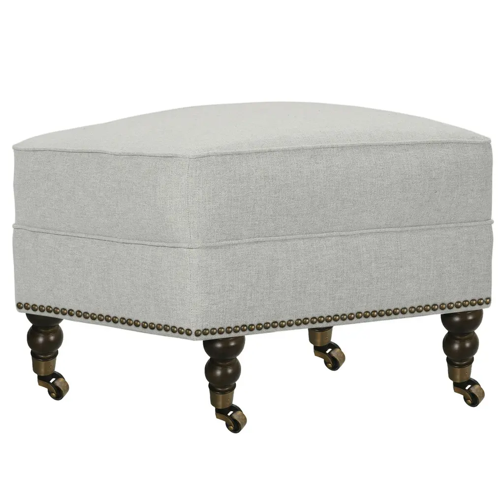 Exclusive to One Kings Lane: Combining timeless elegance with exceptional comfort, the Margot Linen-Blend Ottoman is a statement of sophisticated style. Upholstered in a refined linen-blend fabric, the ottoman features brass nail-head trim and beautifully turned legs, exuding classic charm. With plush feather-and-down cushioning, the Margot offers supreme comfort, making it perfect for relaxing or as an additional seating option. Also of note:• Brass casters complement the nail-head detailing, allowing for easy mobility without scratching floors.• Crafted with a kiln-dried hardwood frame, ensuring durability and strength for years of use.