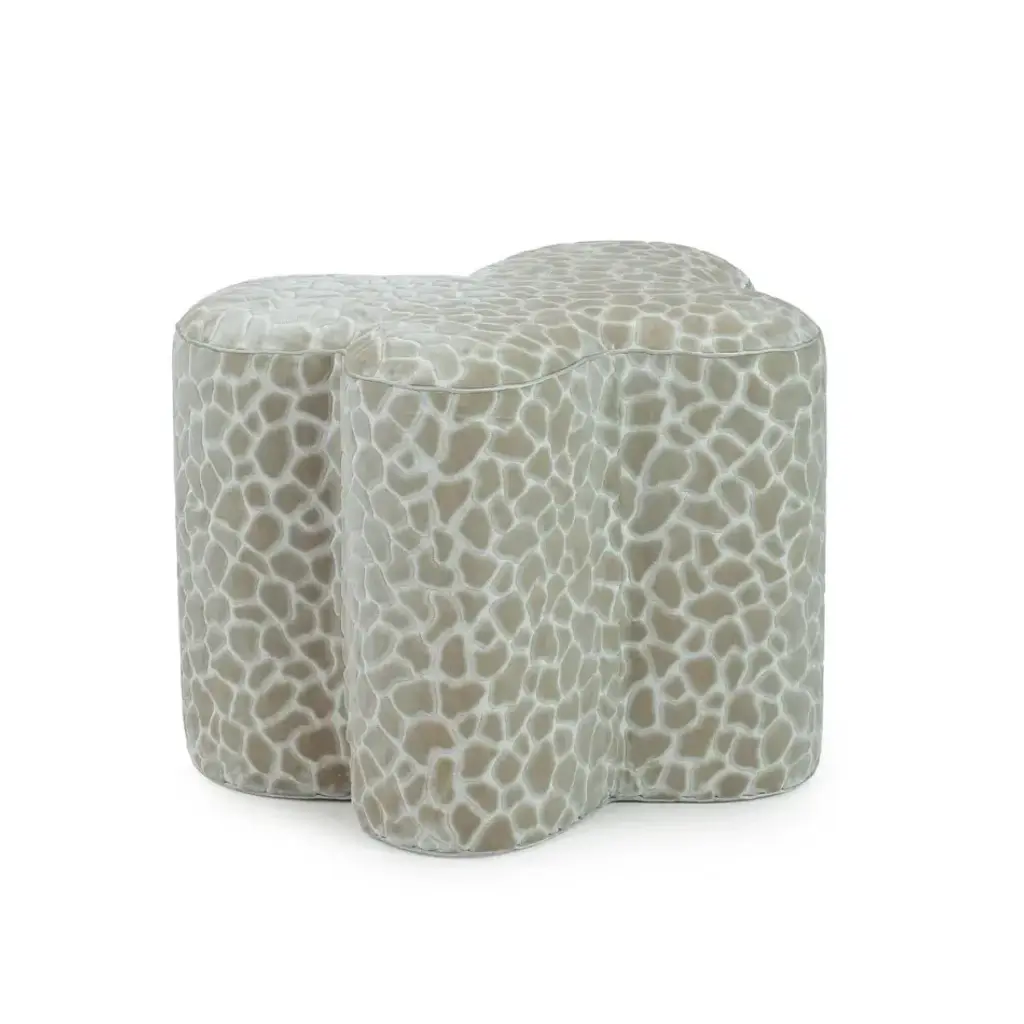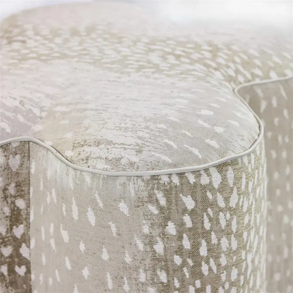 The Mariposa Small Ottoman is a butterfly-shaped statement piece crafted from acacia wood. Shown in Doe a Deer 2236 fabric, the ottoman features a tight seat with a welt trim in Gimlet String 1120 on the top and bottom edges. This stylish piece comes equipped with adjustable glides.
