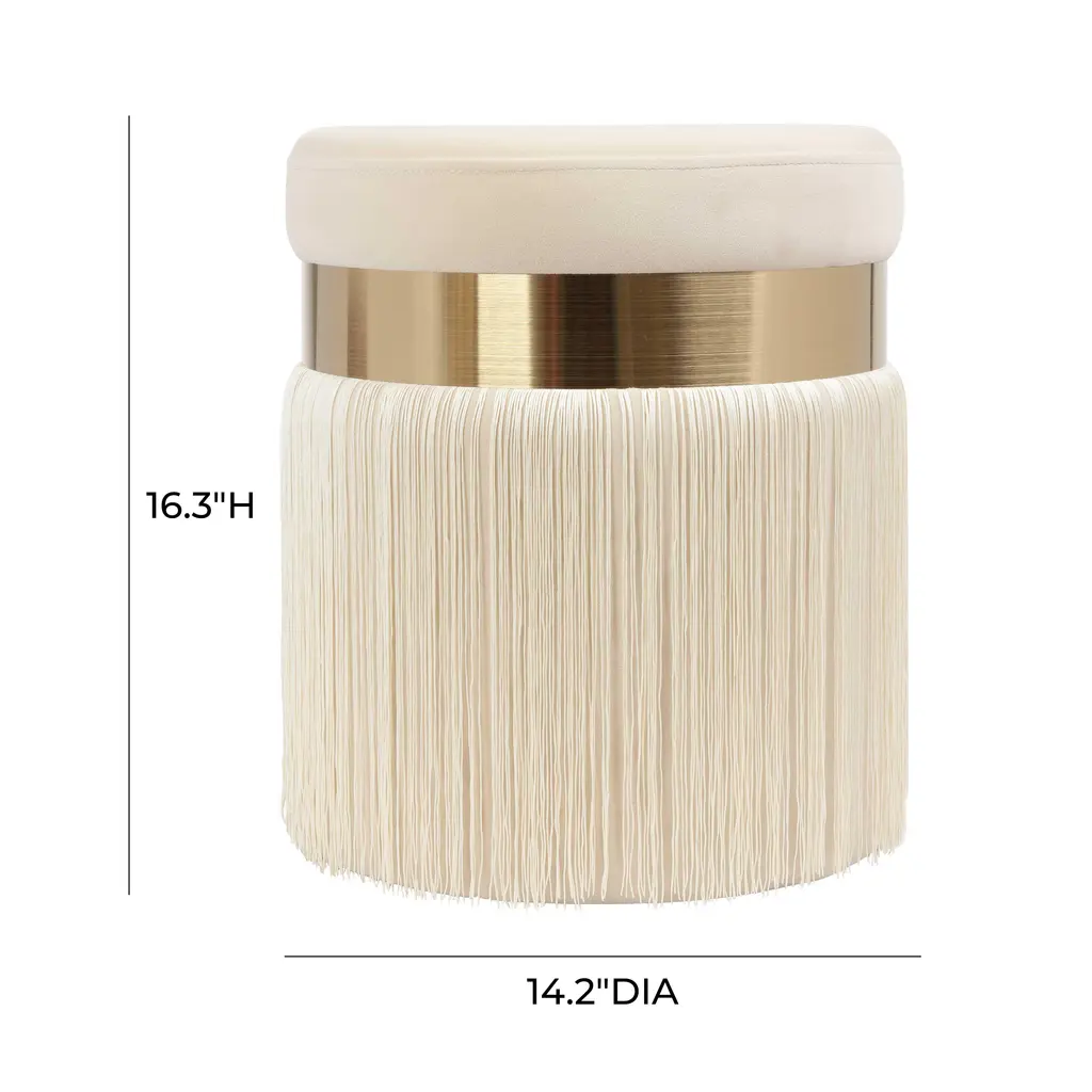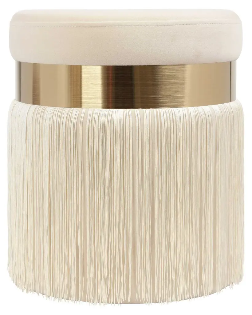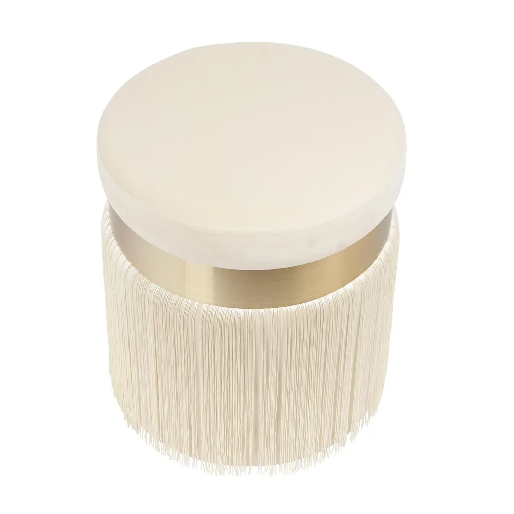 In true grandmillennial style, the Melody ottoman takes the granny chic look to a whole new level. We love how soft velvet, brushed brass and a luxurious fringe pair together. Available in black, blush and cream.