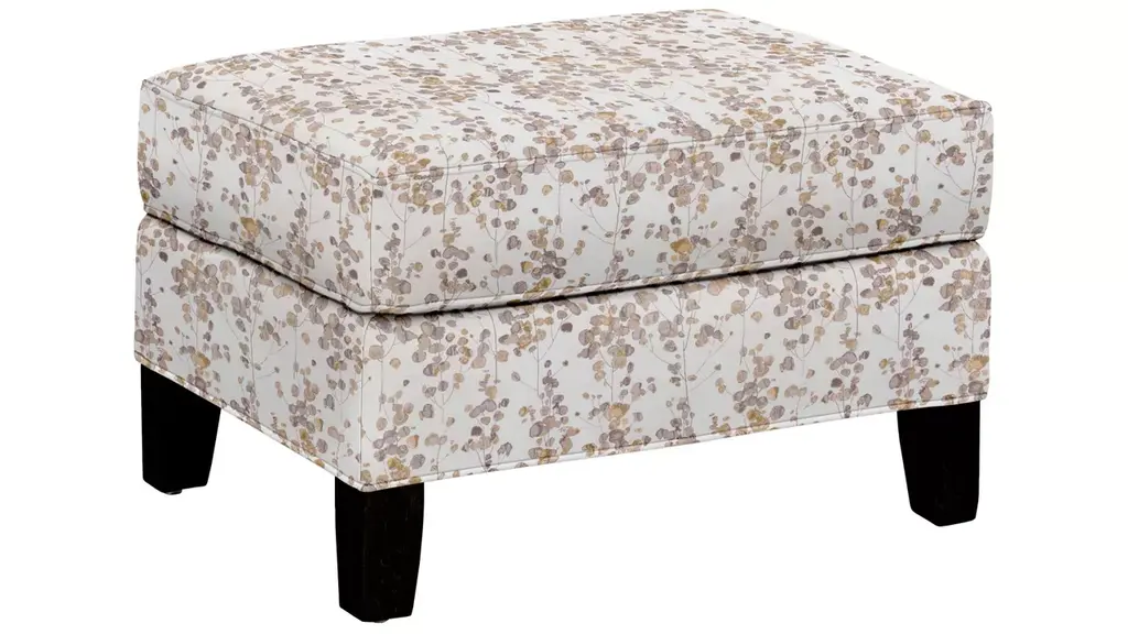 This square shaped Merry ottoman is as smart looking as it is functional, and it is manufactured in Illinois. Hand upholstered in rich fabric it is custom made and thoughtfully appointed, featuring decorative wooden block legs for a superior touch of class. In addition to its obvious good looks, the sturdy construction of this ottoman is second to none. The delightful piece blends in well with any overall design, regardless of whether your style is upscale and dressy or simple and chic.