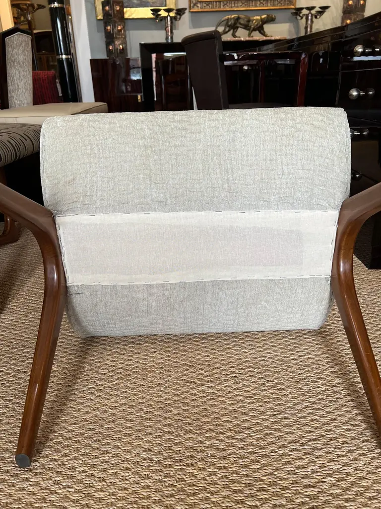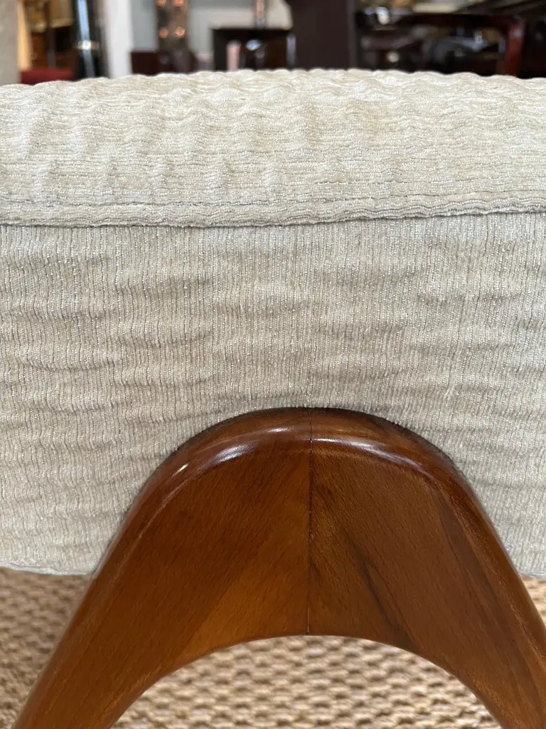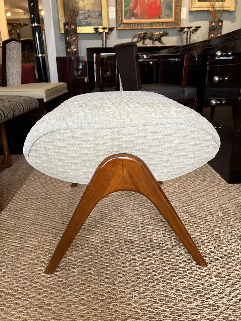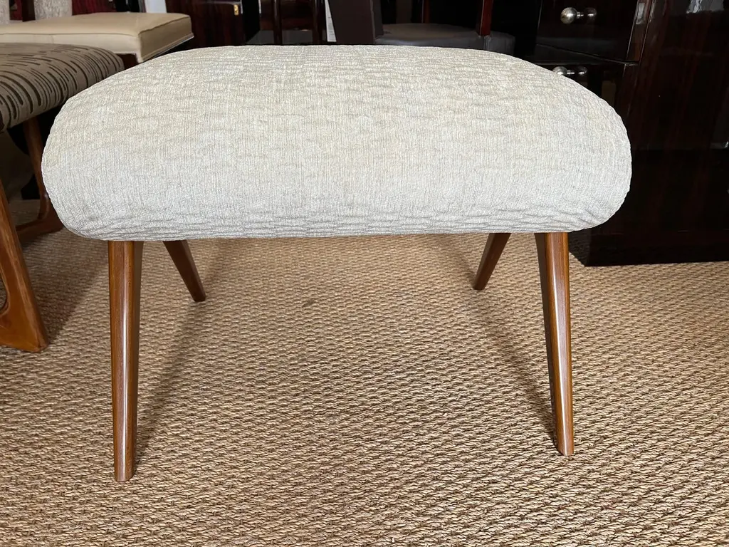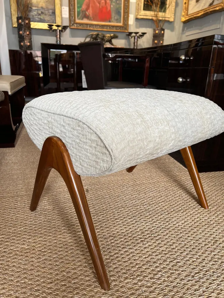 This is a very comfortable ottoman from Italy. The seat has been reupholstered with light fabric. It rests on two connected legs on each side. Italy, c. 1950s25"w x 20"d x 18"hThe condition is very good. Restored.
