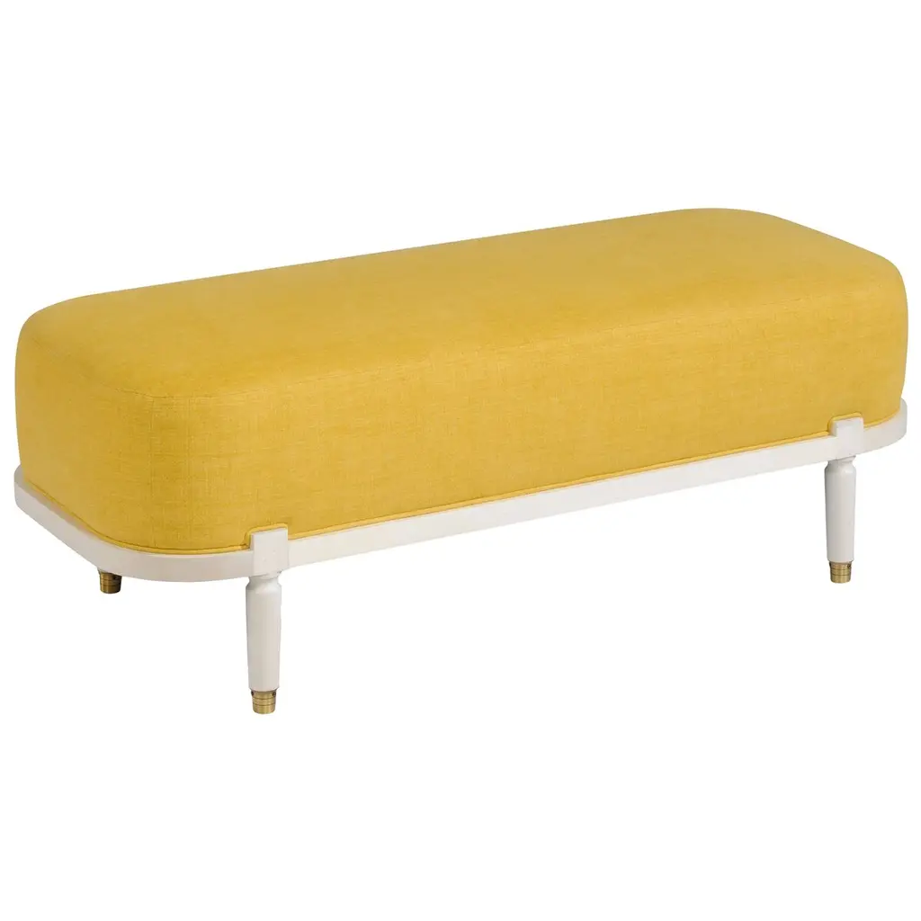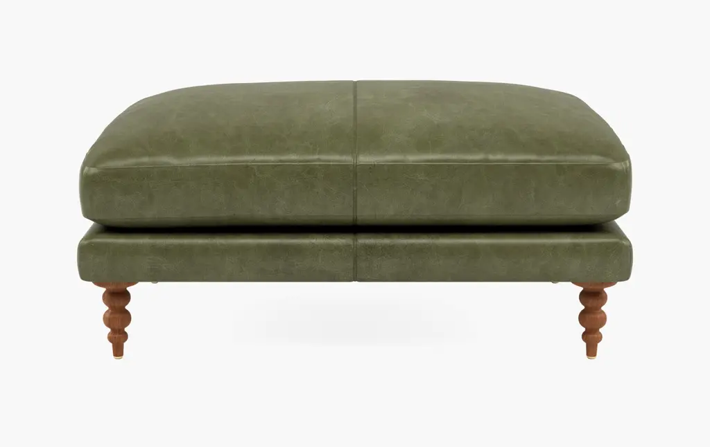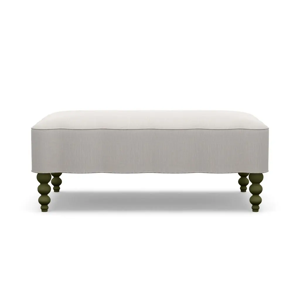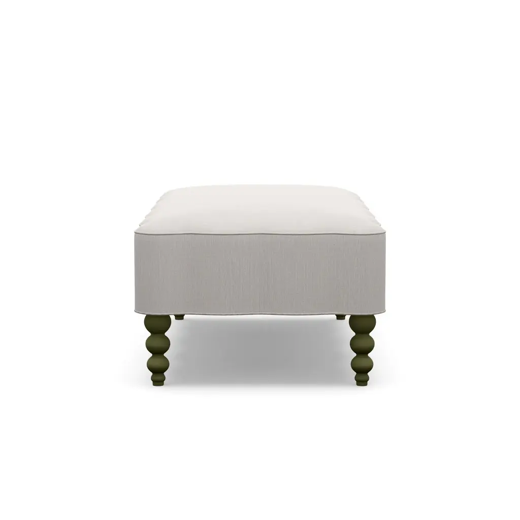Looking for an upholstery collection with a nod to our vintage style and quality that will last for years to come? Look no further than our Mirasol Scalloped Ottoman. The feminine silhouette is made even more special by the scallop detail on all four sides. Each piece is meticulously hand-crafted to order in the U.S.A. using kiln-dried hardwood frames and the highest quality materials. And all that's offered in style and quality is matched in comfort. This is sure to become the best seat in the house! This piece features Crypton performance fabric, making it completely kid and pet friendly for life's little messes. Gorgeous turned wood legs are painted to finish in a solid Olive Green for a fun pop of color. Body Fabric Content: 100% Polyester Spot clean only with a water-free dry cleaning solvent. Pretest a small, inconspicuous area before proceeding. Overall cleaning by a professional furniture cleaning service only is recommended. Assembly Required? No Looking for fabric swatches? Please email swatches@chairish.com for availability. This piece is customizeable. For information on modifications, COM, and more, please reach out to custom@chairish.com