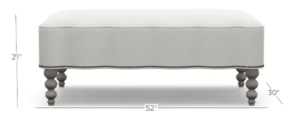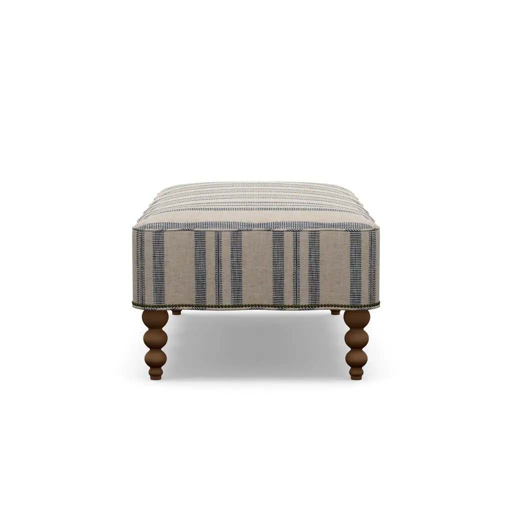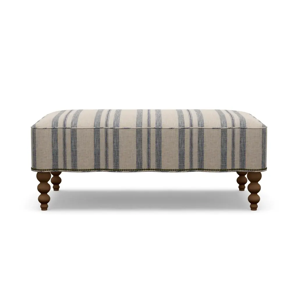 Looking for an upholstery collection with a nod to our vintage style and quality that will last for years to come? Look no further than our Mirasol Scalloped Ottoman. The feminine silhouette is made even more special by the scallop detail on all four sides. Each piece is meticulously hand-crafted to order in the U.S.A. using kiln-dried hardwood frames and the highest quality materials. And all that's offered in style and quality is matched in comfort. This is sure to become the best seat in the house! This piece features a global inspired indigo stripe and Antique Brass nailheads that run along the bottom seam. Gorgeous turned wood legs are finished in a Walnut stain. Body Fabric Content: 100% Polyester Spot clean only with a water-free dry cleaning solvent. Pretest a small, inconspicuous area before proceeding. Overall cleaning by a professional furniture cleaning service only is recommended. Assembly Required? No Looking for fabric swatches? Please email swatches@chairish.com for availability. This piece is customizeable. For information on modifications, COM, and more, please reach out to custom@chairish.com