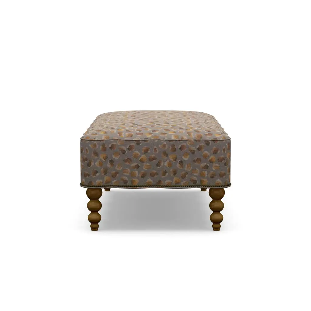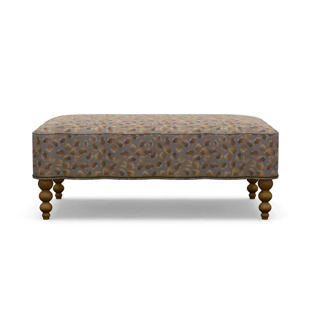 Looking for an upholstery collection with a nod to our vintage style and quality that will last for years to come? Look no further than our Mirasol Scalloped Ottoman. The feminine silhouette is made even more special by the scallop detail on all four sides. Each piece is meticulously hand-crafted to order in the U.S.A. using kiln-dried hardwood frames and the highest quality materials. And all that's offered in style and quality is matched in comfort. This is sure to become the best seat in the house! This piece features a stunningly simple abstract autumnal print and Antique Brass nailheads that run along the bottom seam. Gorgeous turned wood legs are finished in a Big Sur stain. Body Fabric Content: 100% Polyester Spot clean only with a water-free dry cleaning solvent. Pretest a small, inconspicuous area before proceeding. Overall cleaning by a professional furniture cleaning service only is recommended. Assembly Required? No Looking for fabric swatches? Please email swatches@chairish.com for availability. This piece is customizeable. For information on modifications, COM, and more, please reach out to custom@chairish.com