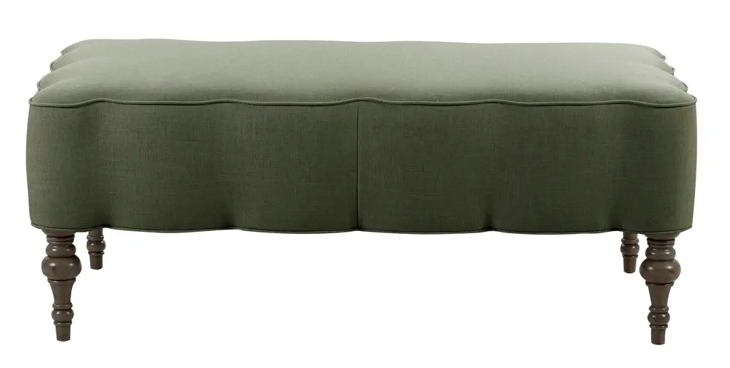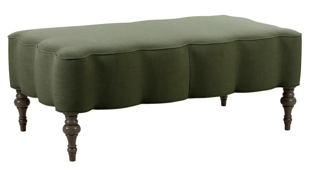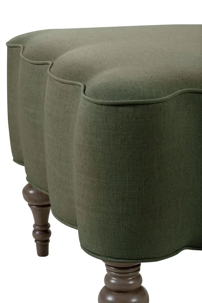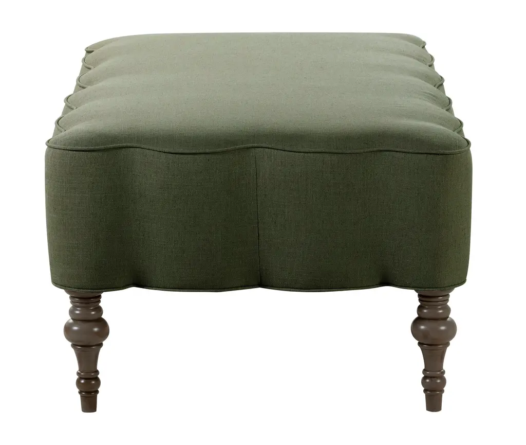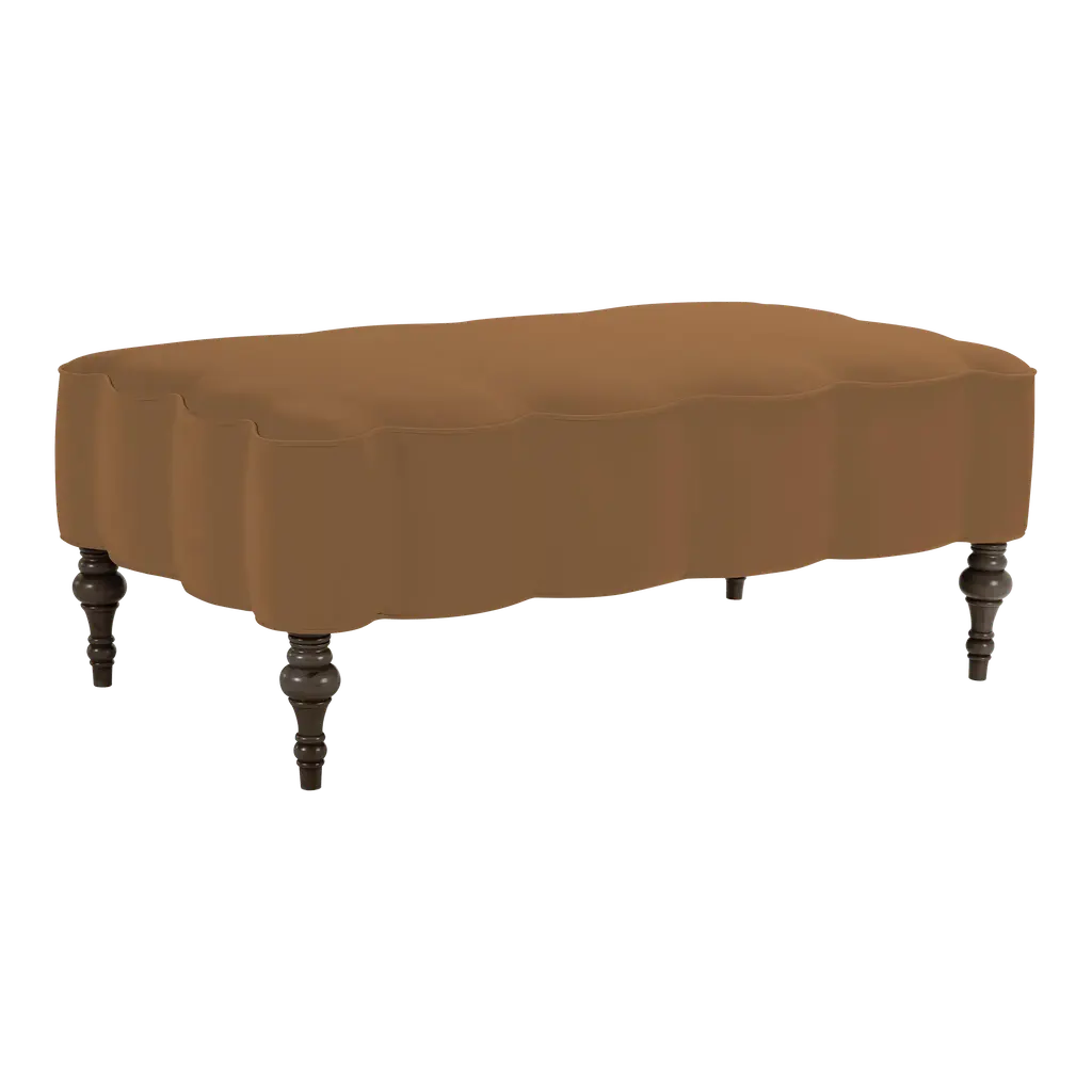 Looking for an upholstery collection with a nod to our vintage style and quality that will last for years to come? Look no further than our Mirasol Scalloped Ottoman. The feminine silhouette is made even more special by the scallop detail on all four sides. Each piece is meticulously hand-crafted to order in the U.S.A. using kiln-dried hardwood frames and the highest quality materials. And all that's offered in style and quality is matched in comfort. This is sure to become the best seat in the house! Spot clean only with a water-free dry cleaning solvent. Pretest a small, inconspicuous area before proceeding. Overall cleaning by a professional furniture cleaning service only is recommended. Looking for fabric swatches? Please email swatches@chairish.com for availability. This piece is customizeable. For information on modifications, COM, and more, please reach out to custom@chairish.com