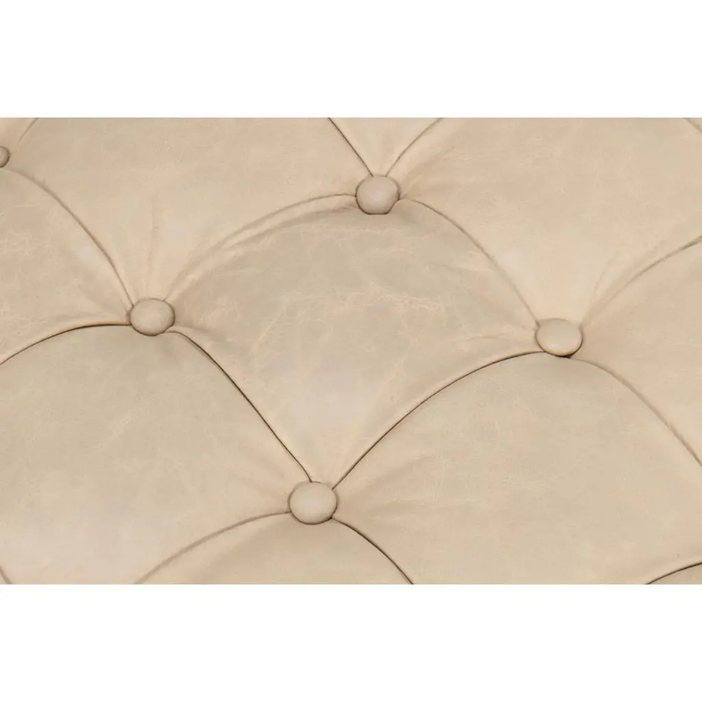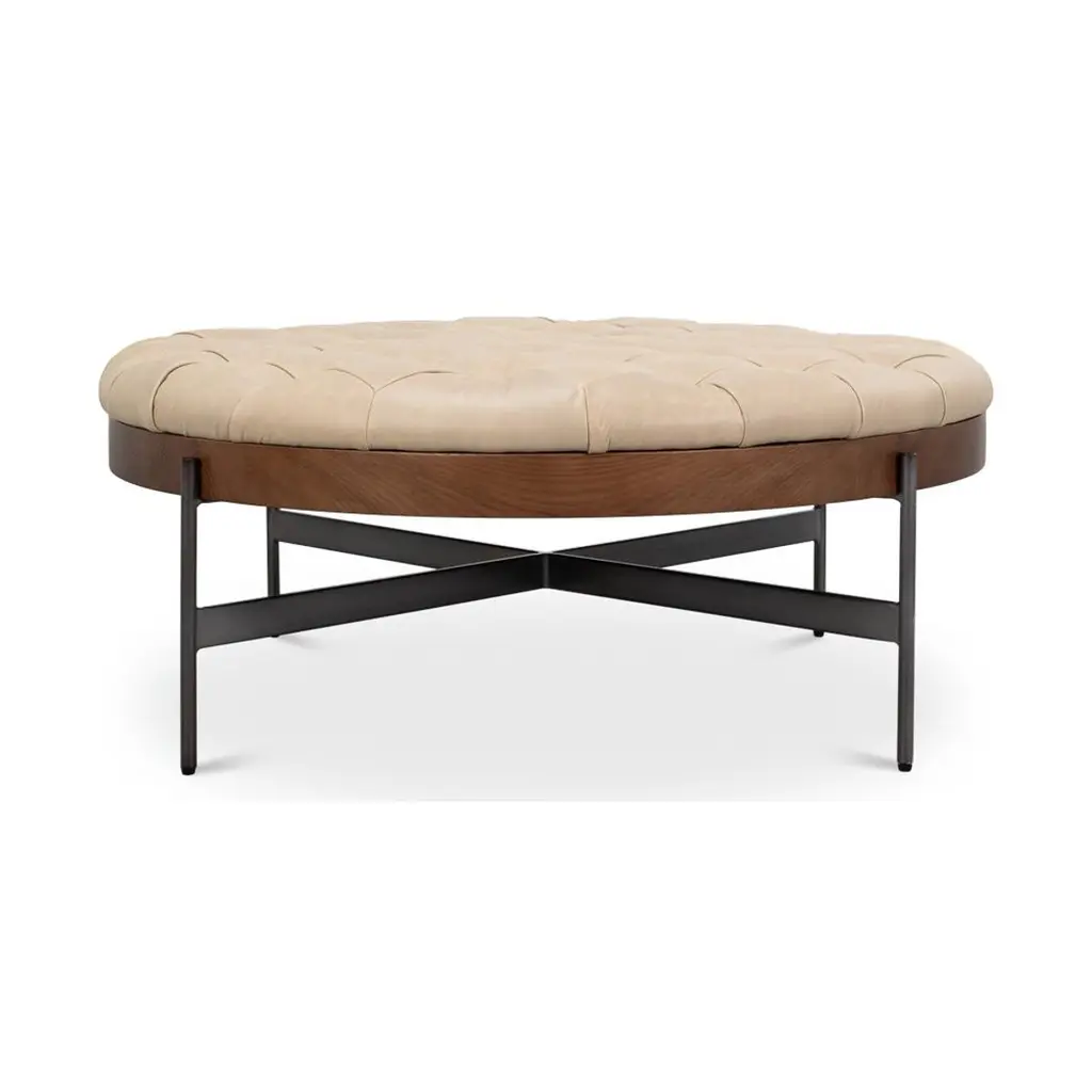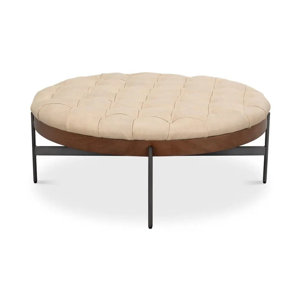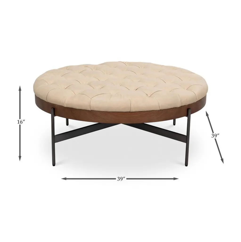 A harmonious blend of luxury and timeless design. Featuring a button tufted top crafted from premium Cappuccino White top-grain leather, it offers both comfort and style. The elegantly finished wood base and trim add warmth, while the sleek metal legs provide contemporary sophistication and stability.This versatile ottoman functions as a coffee table, extra seating, or a statement accent piece, making it ideal for living rooms or lounges. With its combination of modern materials and mid-century charm, the ottoman effortlessly elevates any interior space.Dimensions: 39" W x 39" D x 16" H