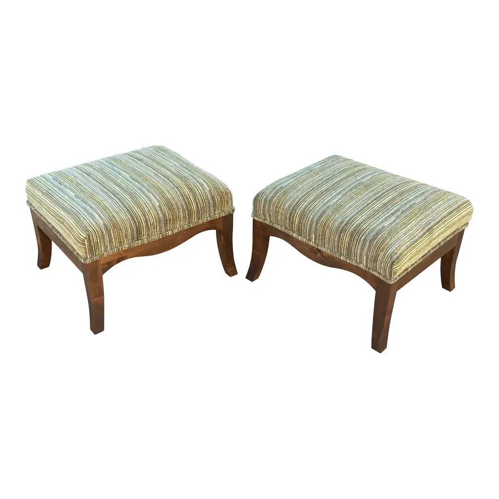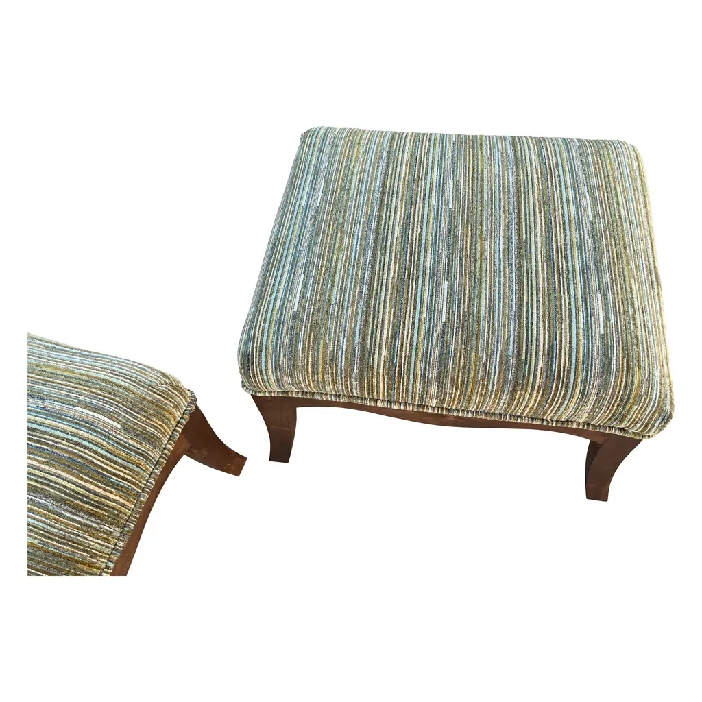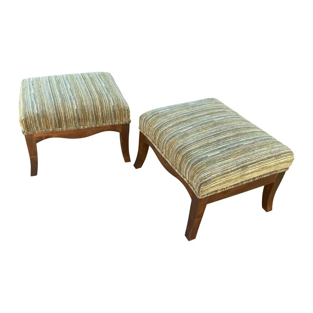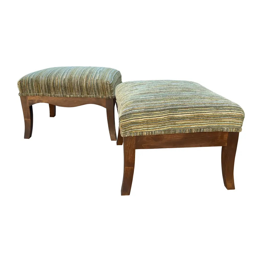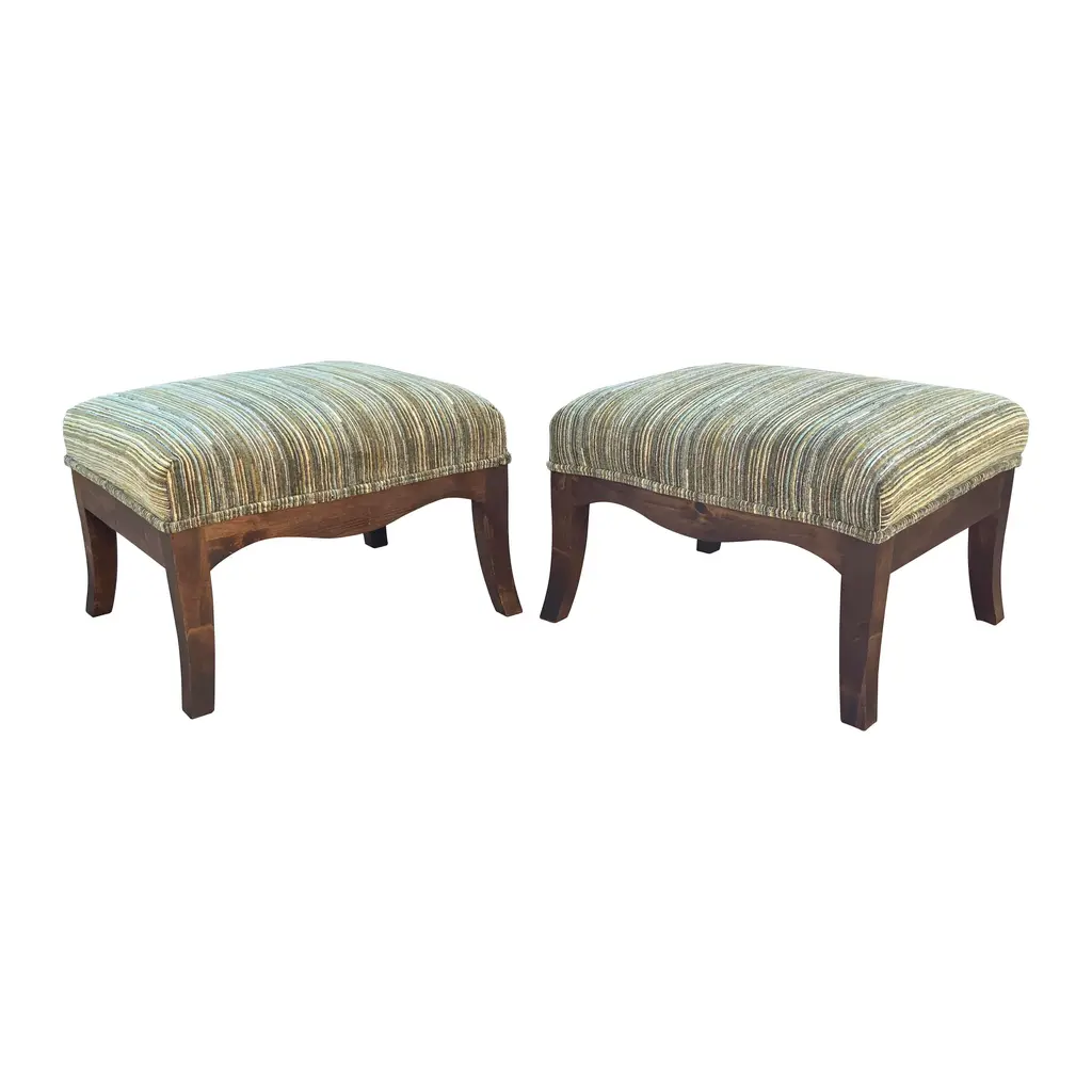 Modern pair of ottomans. The set is done in a modern multi colored chenille. The finish is walnut. The frames are made of alder..