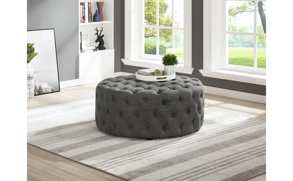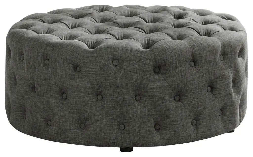 Modern Tufted Fabric Ottoman, Round, Gray Linen