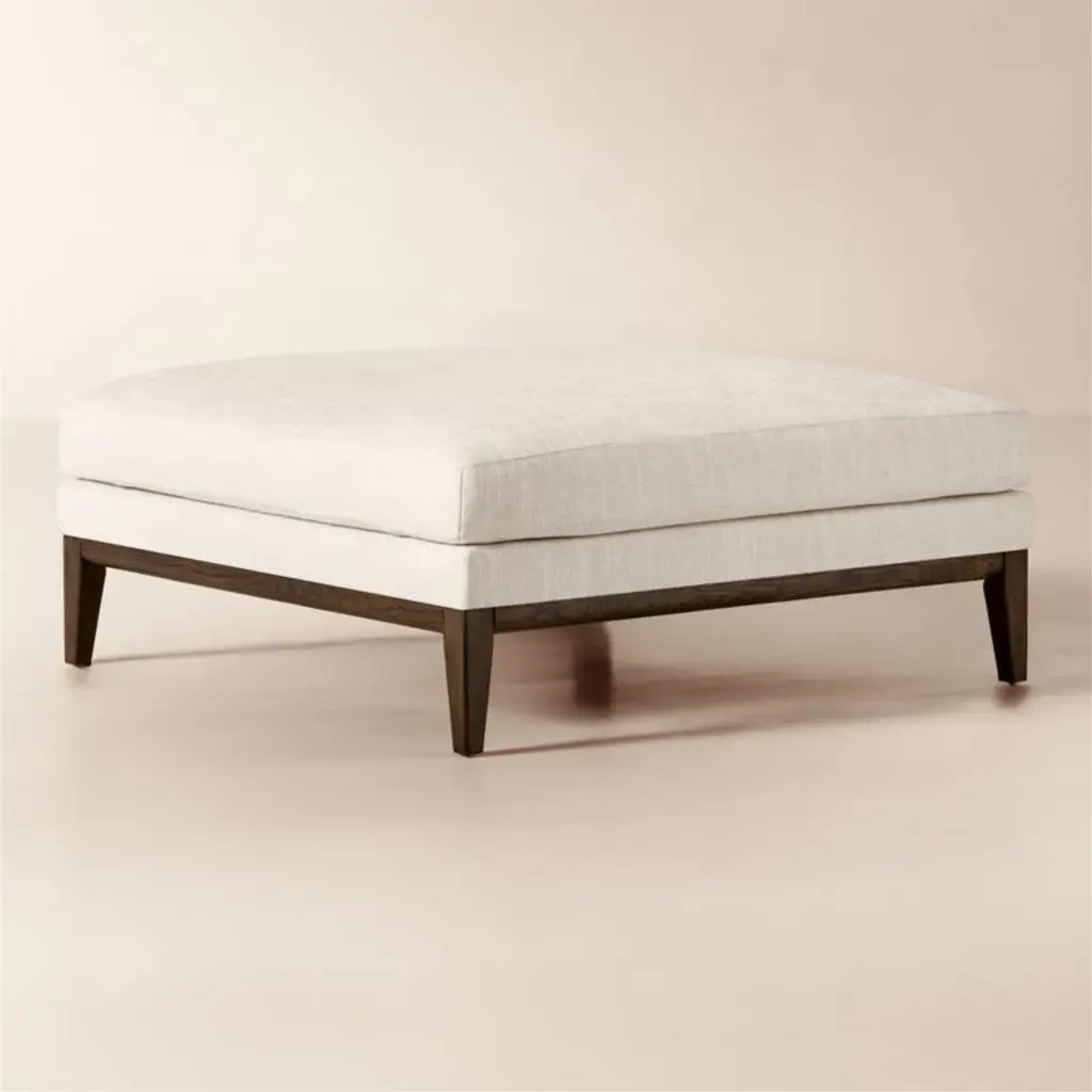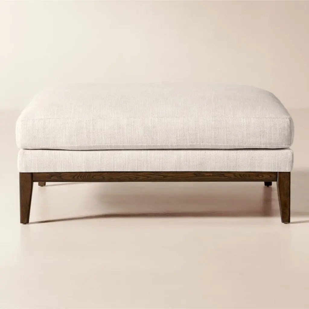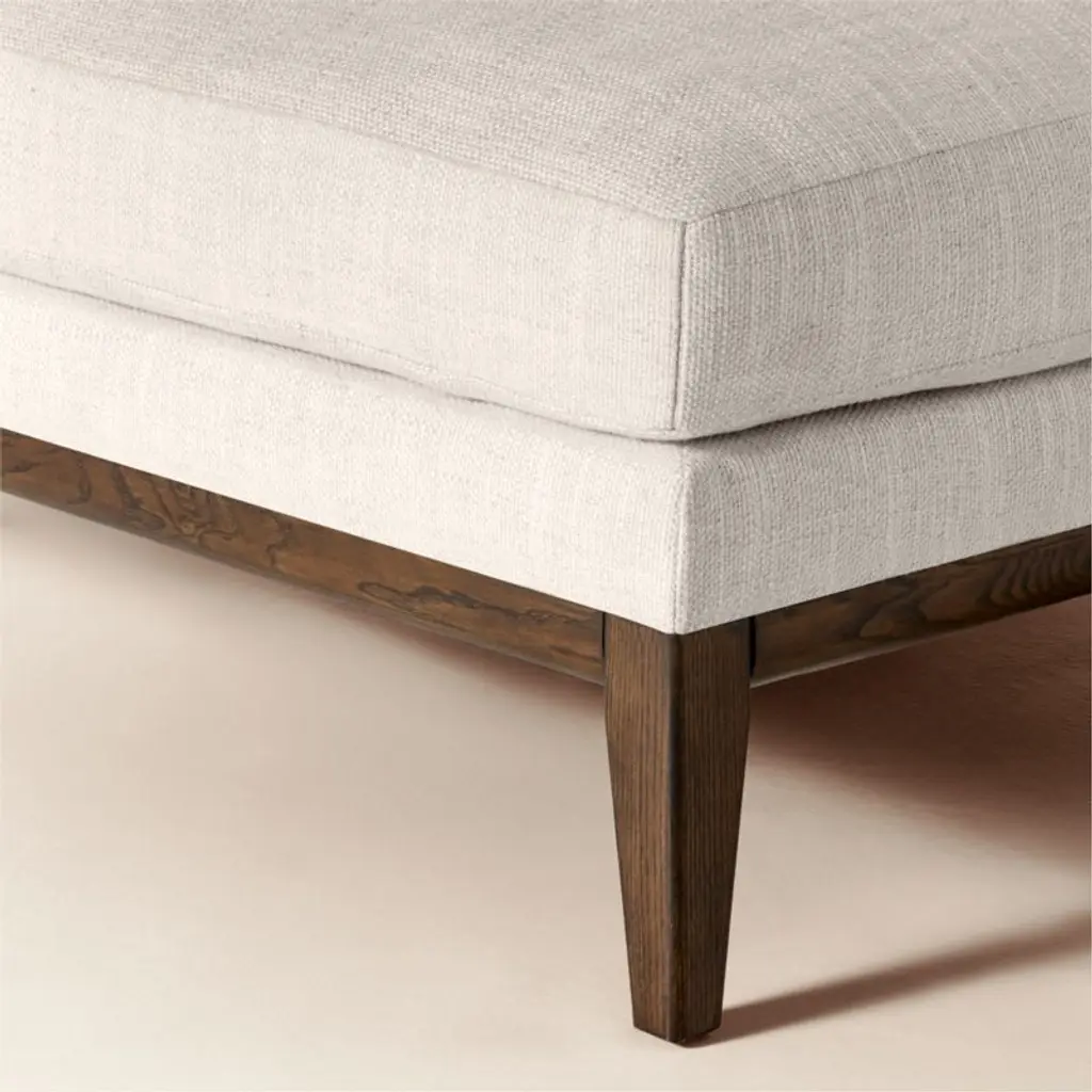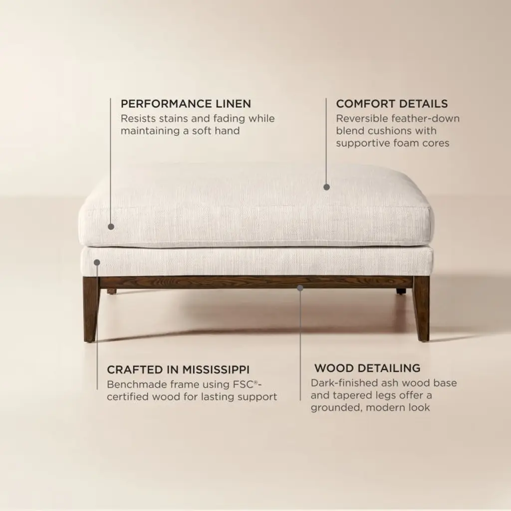 Assembled in Mississippi, modern ottoman by Melbourne-based design studio VUUE is made for lounging. Tapered legs, a deep cushion and a bullnose ash wood base all speak to the ottoman's casual style. Upholstered in a linen-blend fabric with a performance finish. Float the ottoman on its own or add coordinating Mona sectional pieces to create a spacious sofa. CB2 exclusive.