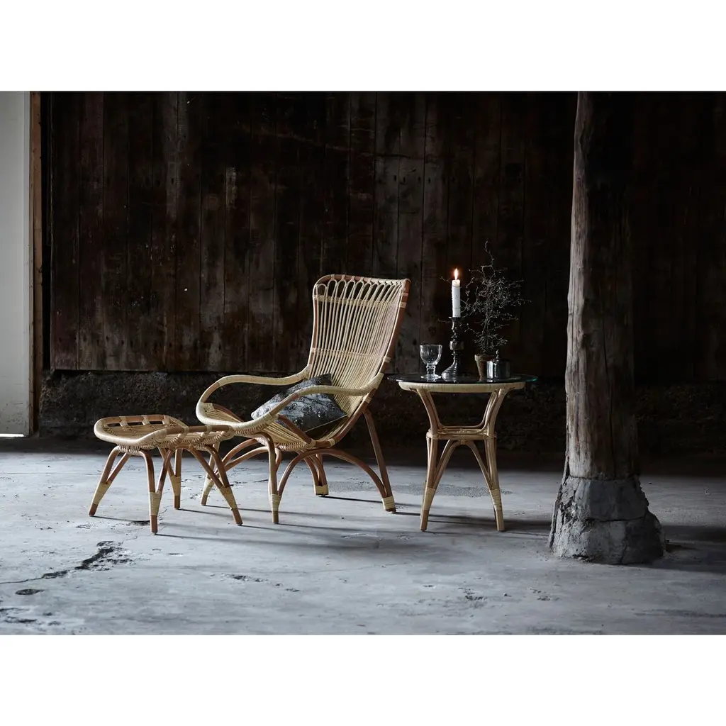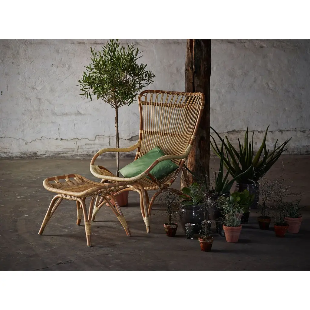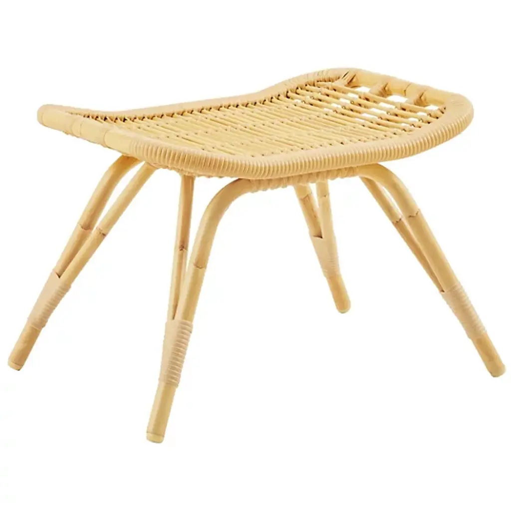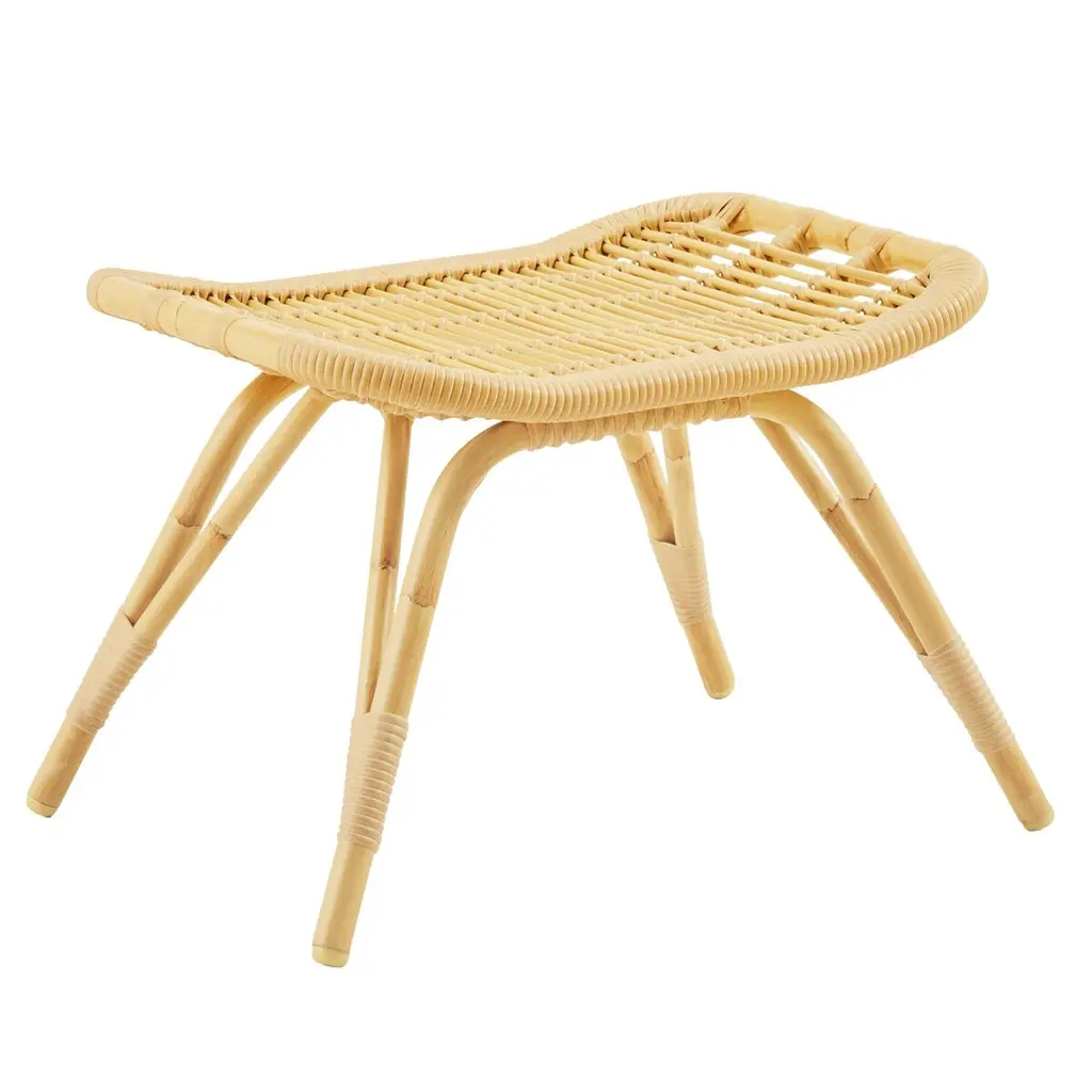 The perfect companion to a favorite lounge chair, this ottoman, inspired by designs of the 1950s and '60s, is made of durable rattan with woven reinforcements and a curvy silhouette. Suitable for indoor use only.