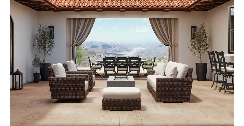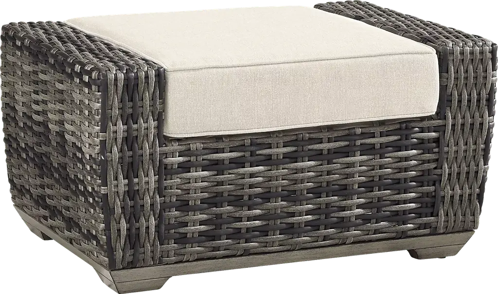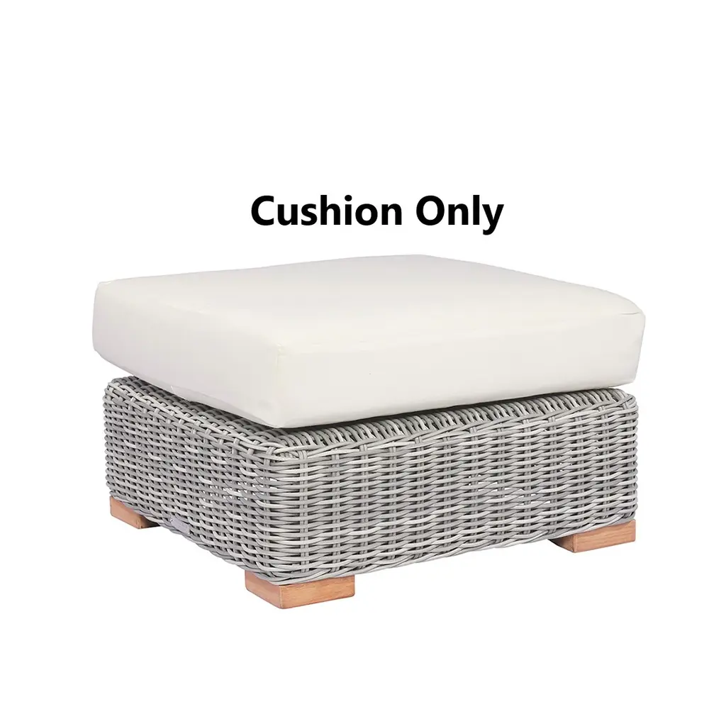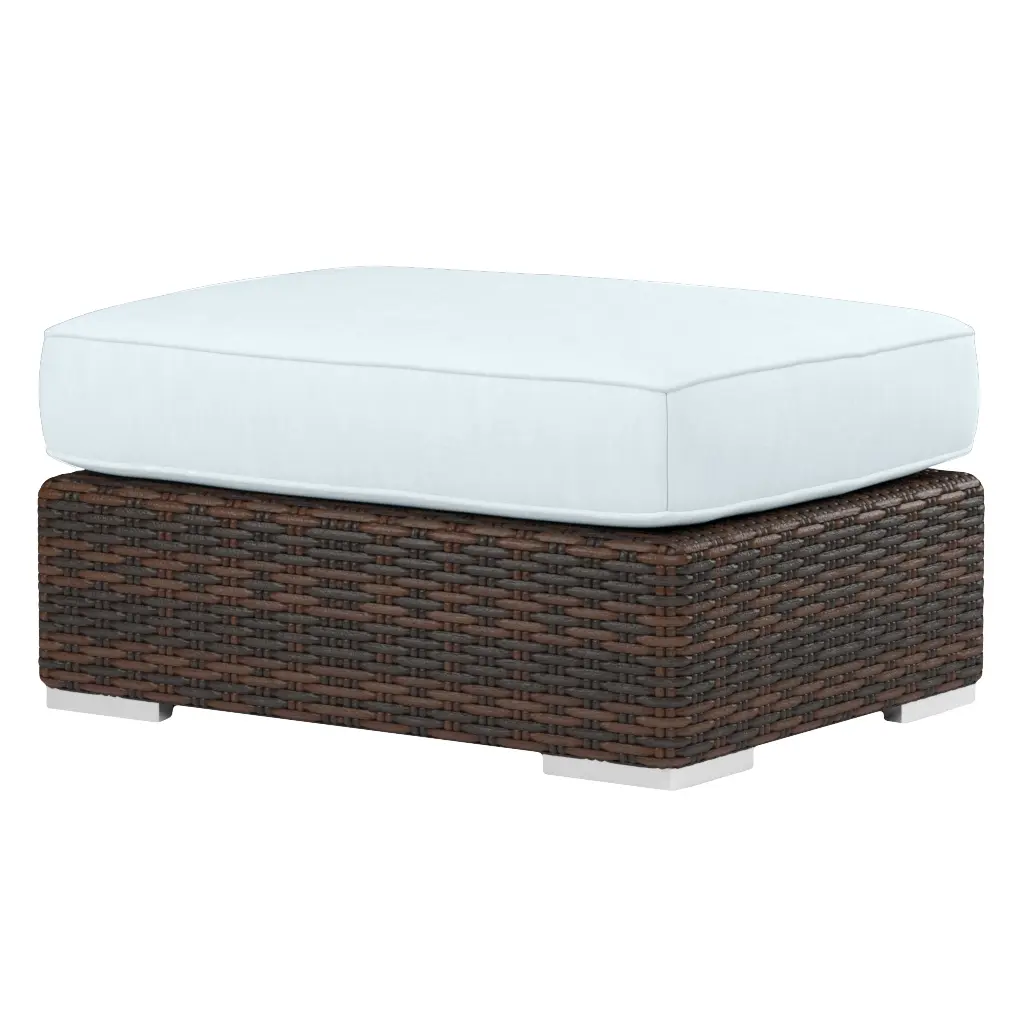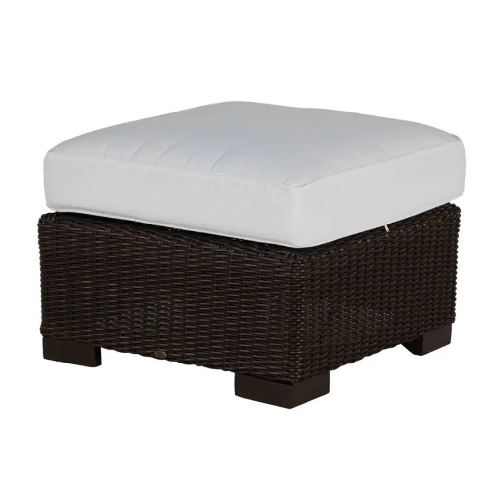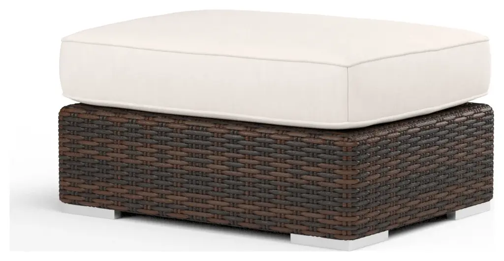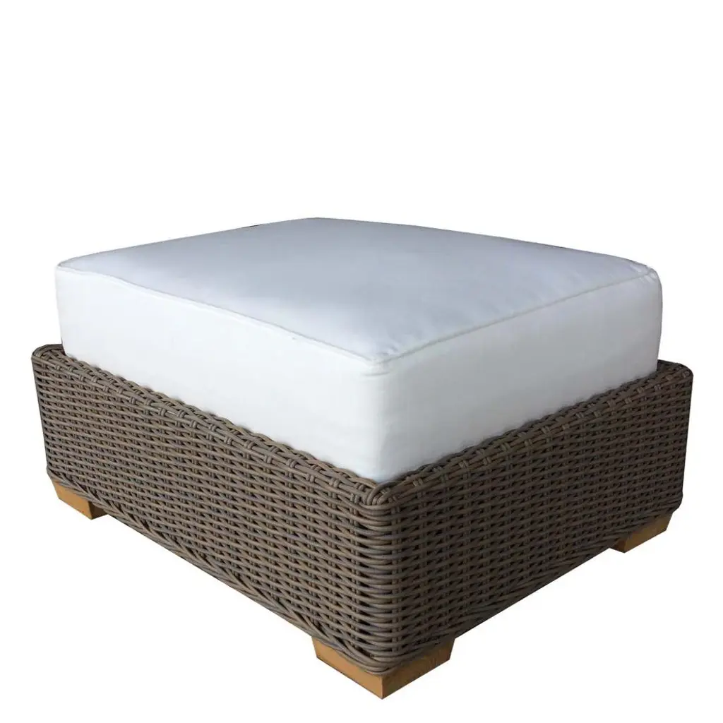 Inspired by the coastal town of its namesake, The Montecito Ottoman offers purely sophisticated outdoor living. Expertly wrapped in a rich Cognac multi-colored weave, Montecito mimics natural materials with low maintenance in durable virgin resin wicker. Absolute comfort is provided with its generously sized frame and plush cushion. Pairs well with the Montecito Club Chair or Sofa and Sectional.Fully welded powder-coated aluminum frameWrapped in virgin PE Resin Wicker in CognacSunset West Progressive Springing System TechnologyWeather resistant, high-resiliency foam cushionsStocked in Premium Sunbrella fabric in Canvas FlaxNon-marking plastic glidesCommercial Quality ConstructionCustom Cushions available in approx. 4 weeks.Montecito is part of the Cognac color story, and coordinates well with Monterey and pieces from the Bazaar.