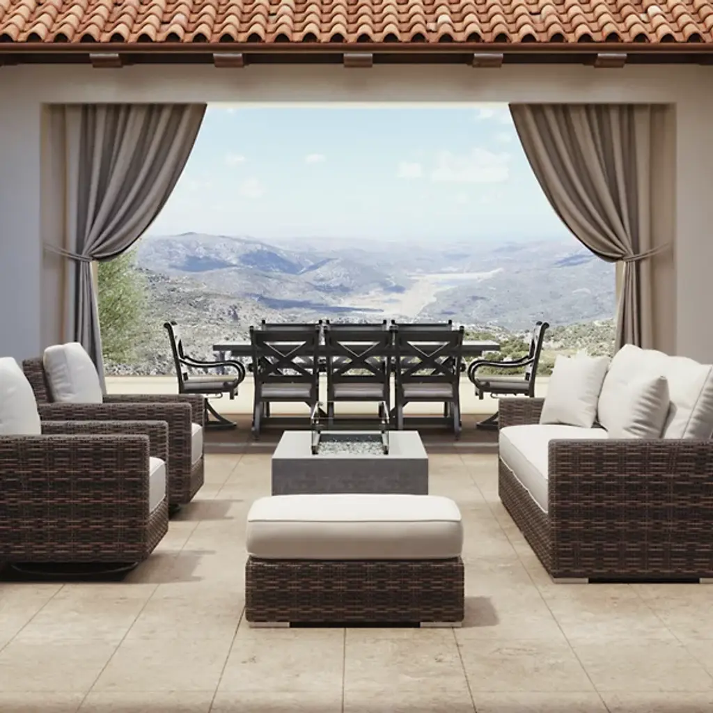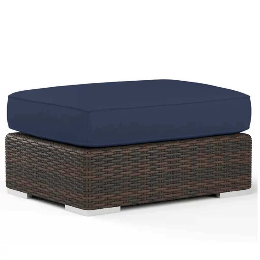 The Montecito Outdoor Ottoman from Sunset West brings the collection's signature multi-tonal weaving into a compact form perfect for extending seating arrangements. Its rich cognac tones create depth through varied strand colors that blend together naturally. The ottoman's generous cushioning transforms it into additional seating when needed, while its low profile allows it to slip beneath other furniture when not in use. The textured exterior adds tactile interest to any outdoor setting through its carefully crafted woven pattern.