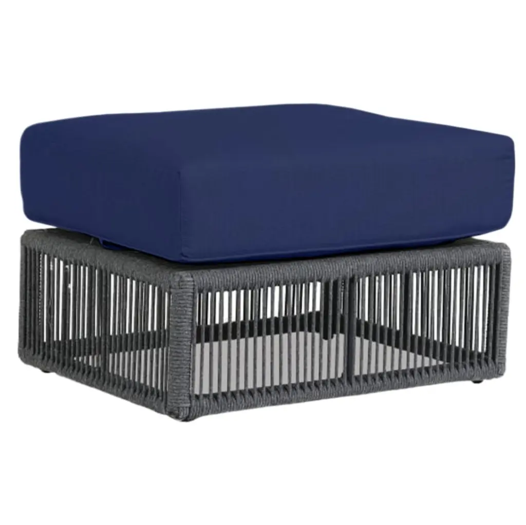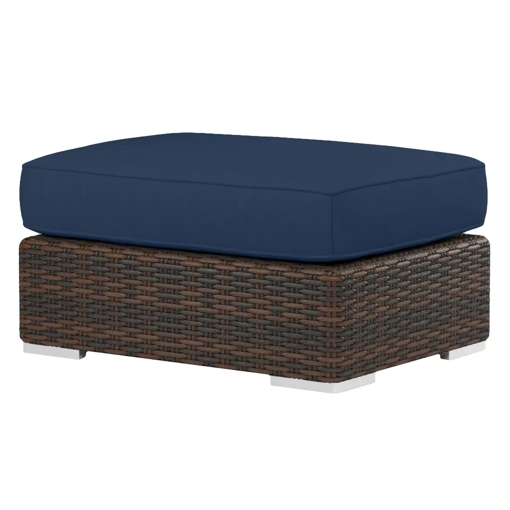 The Montecito Outdoor Ottoman from Sunset West brings the collection's signature multi-tonal weaving into a compact form perfect for extending seating arrangements. Its rich cognac tones create depth through varied strand colors that blend together naturally. The ottoman's generous cushioning transforms it into additional seating when needed, while its low profile allows it to slip beneath other furniture when not in use. The textured exterior adds tactile interest to any outdoor setting through its carefully crafted woven pattern.