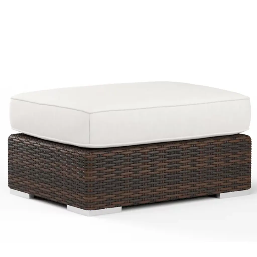 The Montecito Outdoor Ottoman from Sunset West brings the collection's signature multi-tonal weaving into a compact form perfect for extending seating arrangements. Its rich cognac tones create depth through varied strand colors that blend together naturally. The ottoman's generous cushioning transforms it into additional seating when needed, while its low profile allows it to slip beneath other furniture when not in use. The textured exterior adds tactile interest to any outdoor setting through its carefully crafted woven pattern.