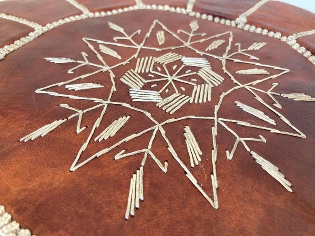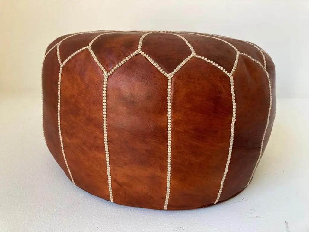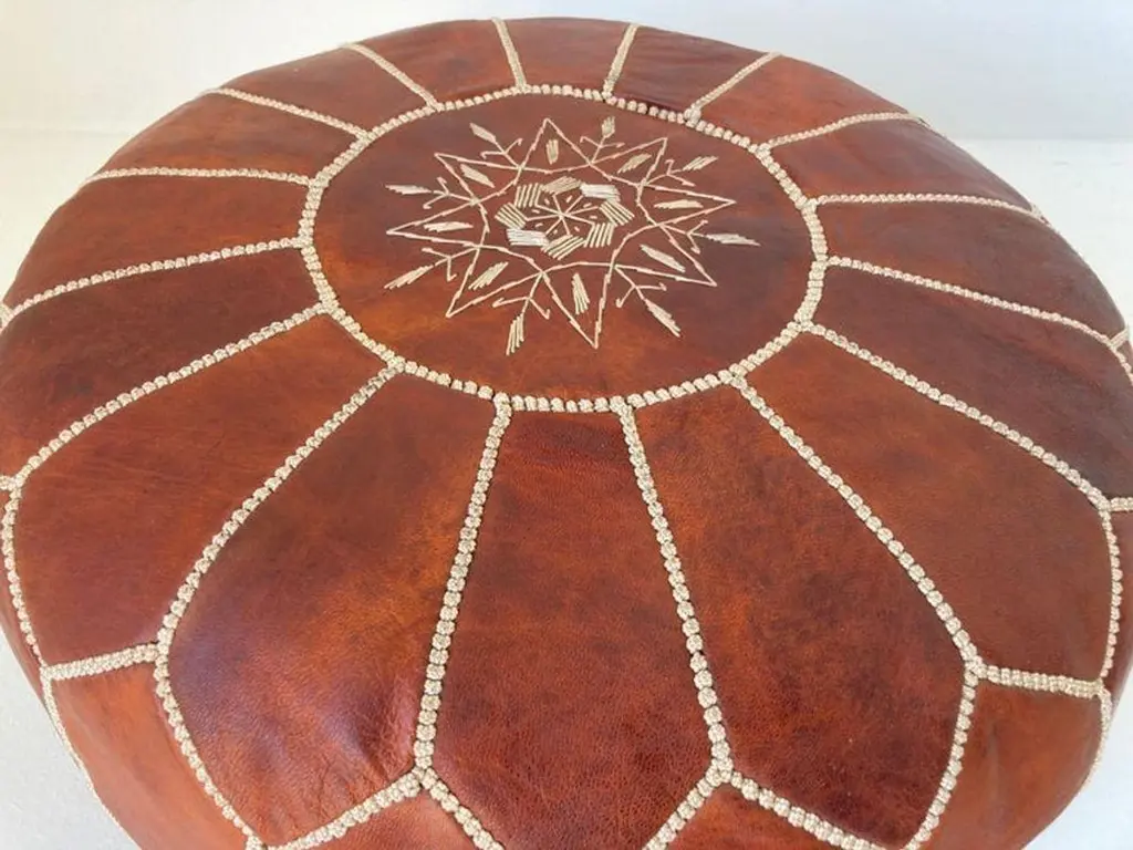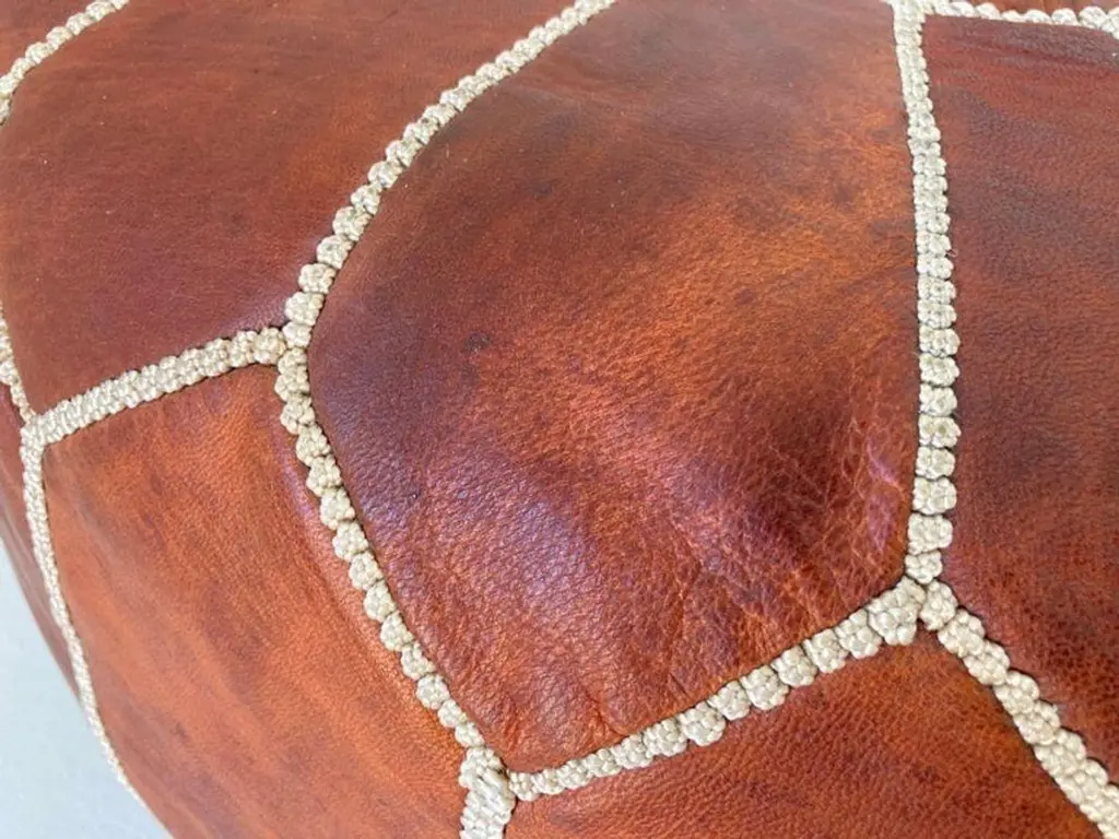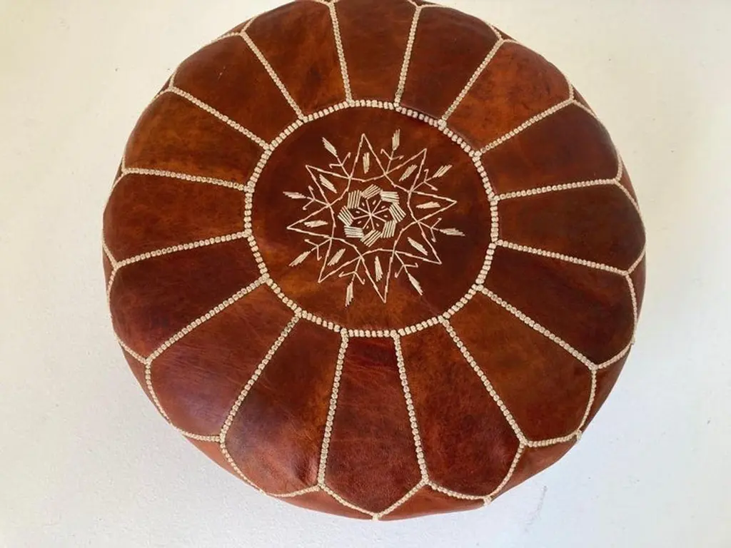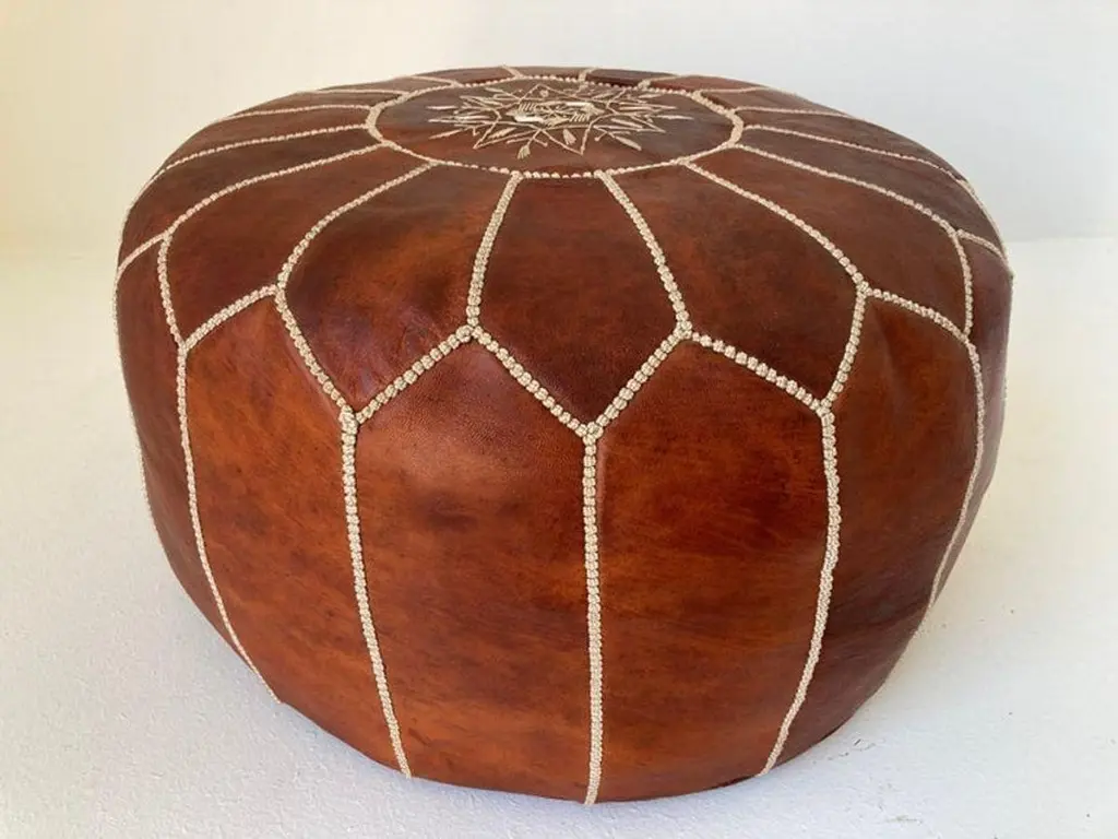 Moroccan handcrafted brown camel leather ottoman, with embroideries.Could be used a foot stool, or side table or ottoman.The Moroccan leather poufs are hand-tooled and embroidered with white tread.Very nice handmade vintage Moroccan tan camel color leather pouf from Fez.Great to use for your Bohemian room, kids room or in any low seating. Dimensions:Height: 12 in (30.48 cm)Diameter: 20 in (50.8 cm)Seat Height: 12 in (30.48 cm) Style:Bohemian (In the Style Of) Materials and Techniques:Leather, Embroidered, Hand-Crafted Place of Origin:Morocco Period:Late 20th Century