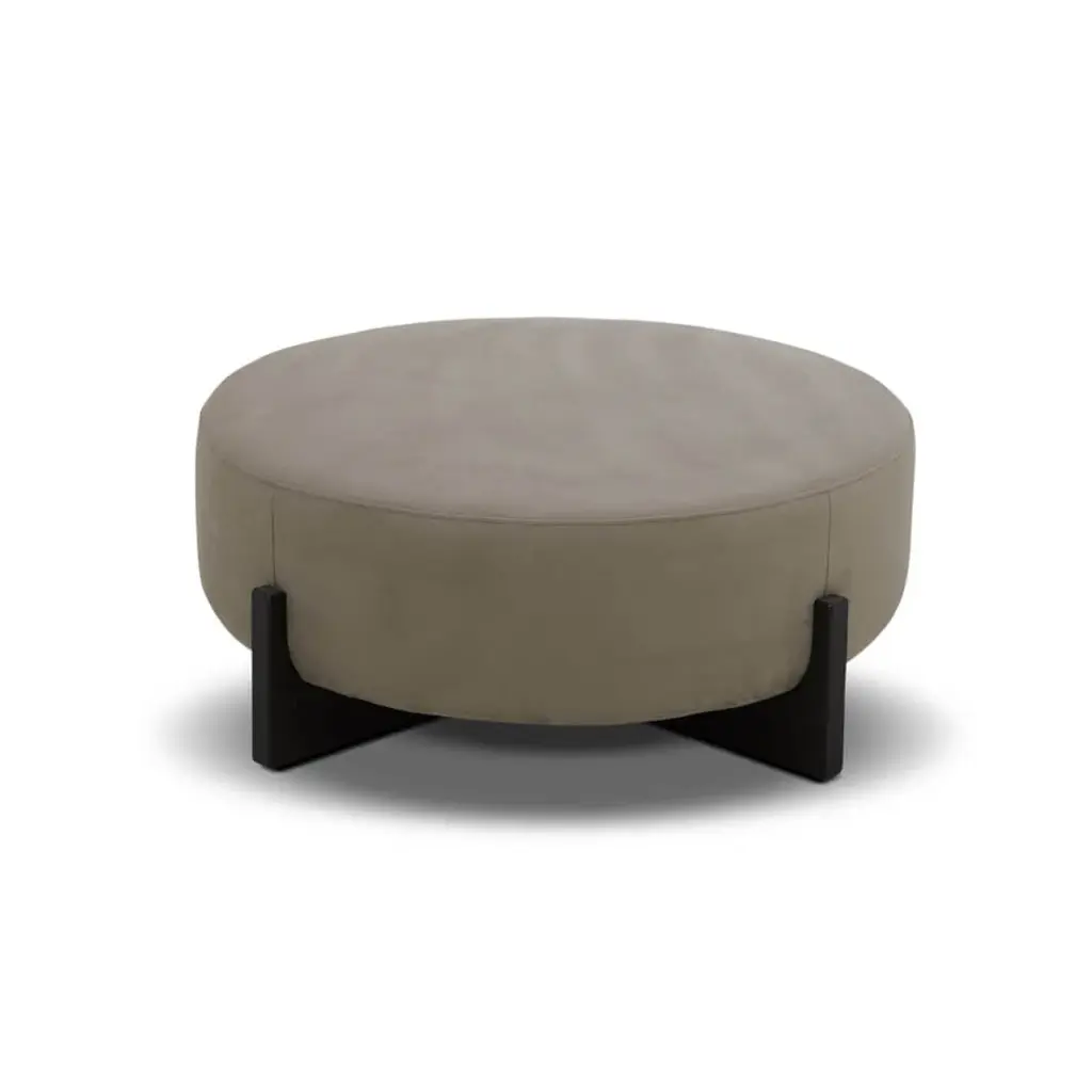 The Morrison ottoman features a circular design, upholstered in a soothing neutral fabric, and is supported by four sharp-squared wooden legs. The perfect accent for your living room area.