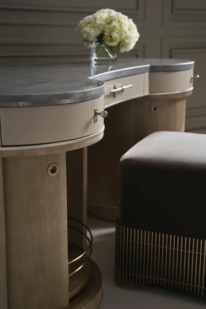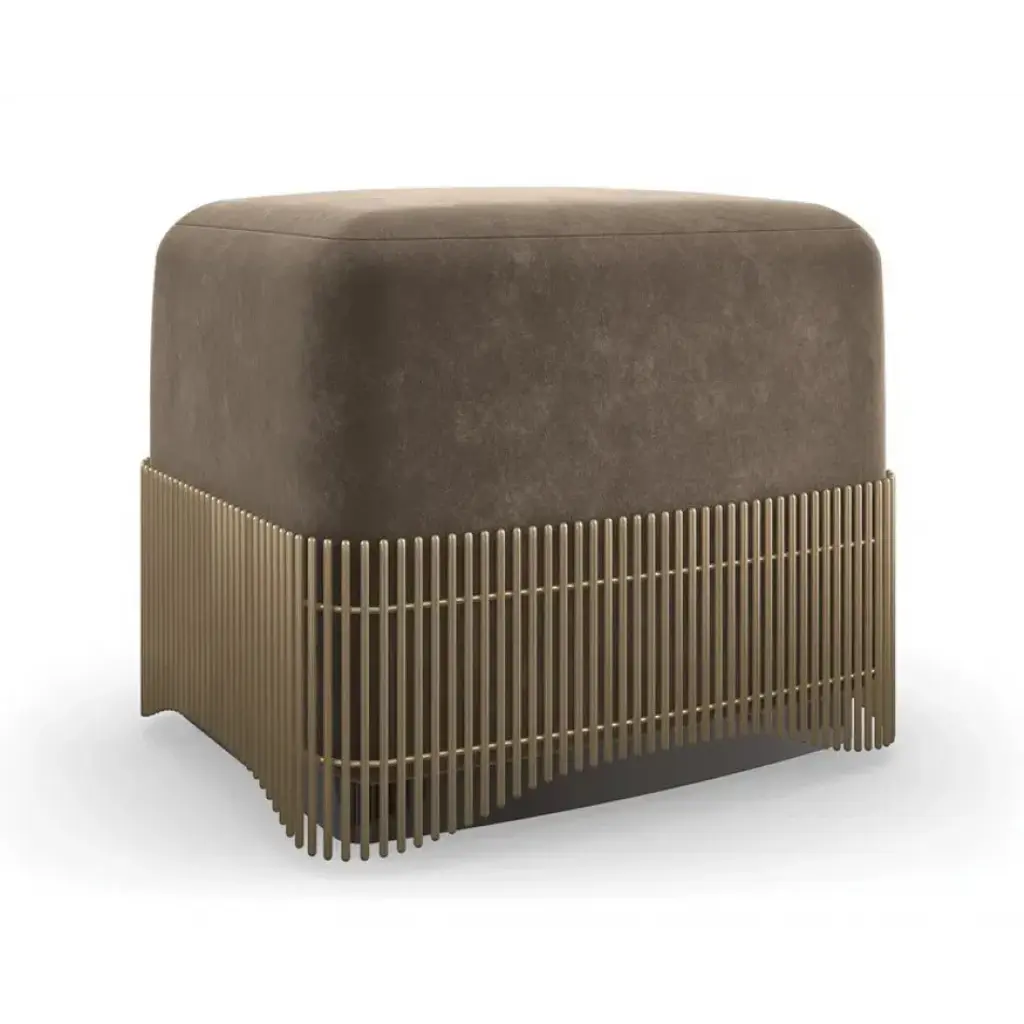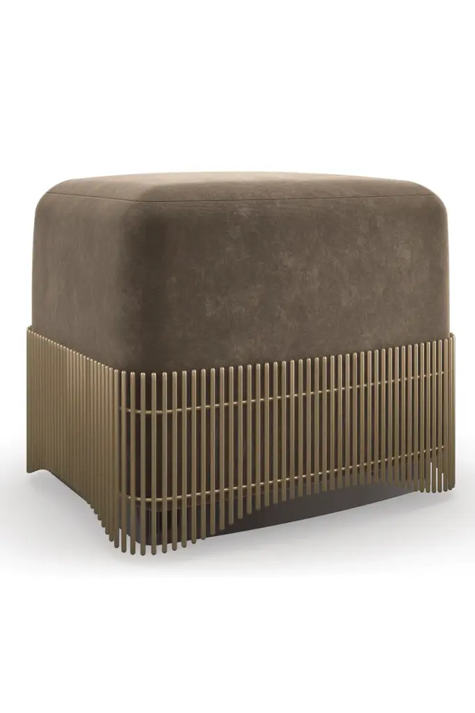 Luxury in a small package, this petite ottoman introduces a sense of rhythm and fluidity to living and bedroom interiors. Moss-green mohair is warmly complemented by a uniquely designed, metal rod skirt in Brushed Gold, introducing a gentle wave pattern that gives just a glimpse of its wood plinth base. Hidden casters make it easy to move from room to room. Well-scaled for vanities and dressing areas, or style in pairs to create a luxe landing at the end of a bed.