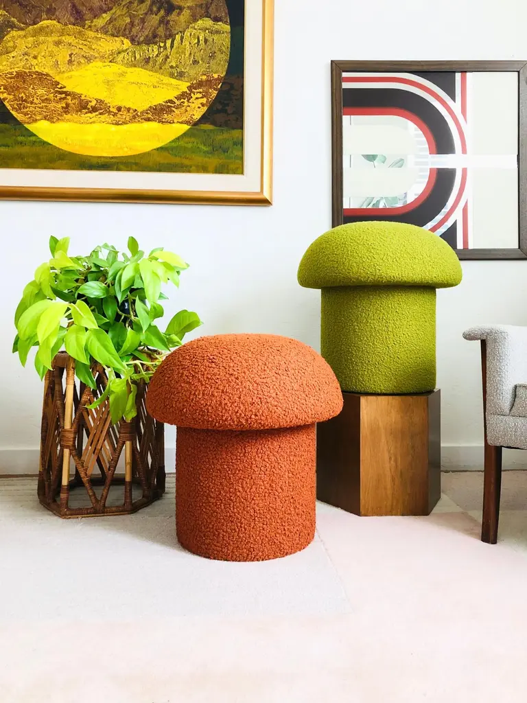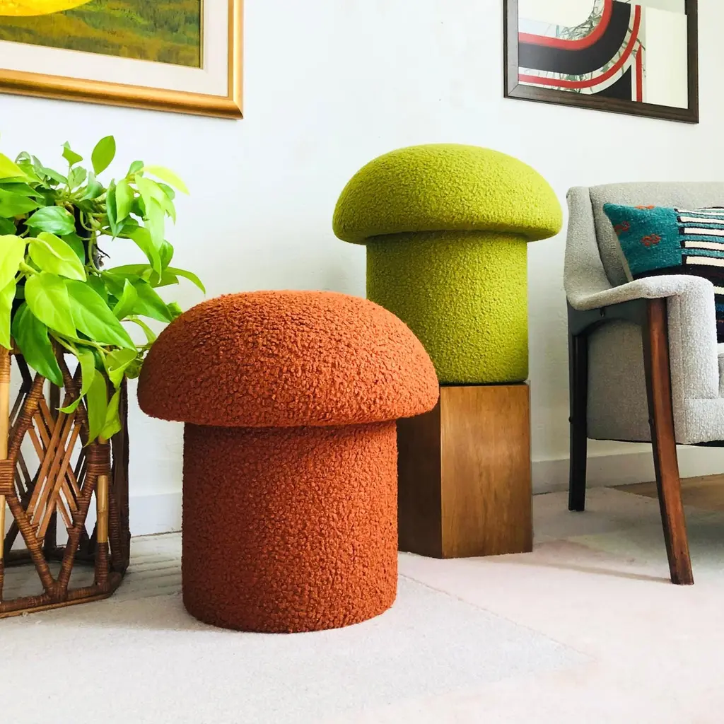 A handmade mushroom shaped stool, upholstered in "Pistachio" curly boucle fabric. Pistachio is a yellow-green color. Perfect for using as a footstool or extra occasional seating. A comfortable cushioned seat and sculptural accent piece.PLEASE NOTE: Color variations may occur due to different monitor settings. Colors shown on screen may be a close match, but please do not rely on them to be an exact match. Please feel free to send a message with your address to request a fabric sample prior to purchasing if you need to verify the color.