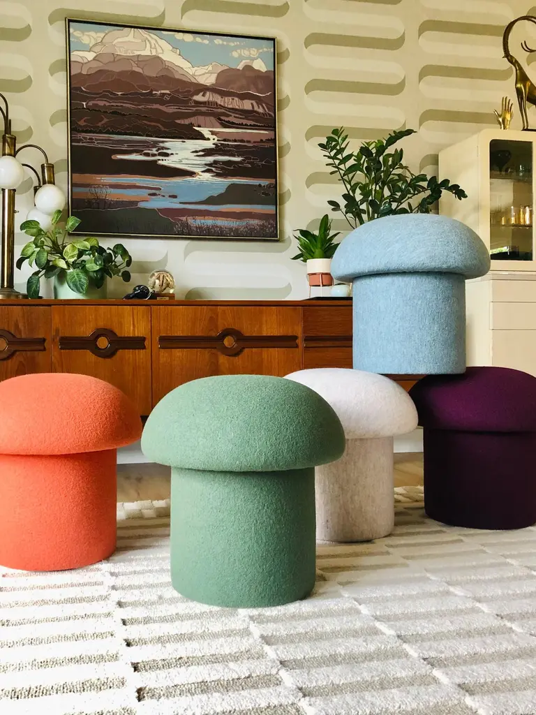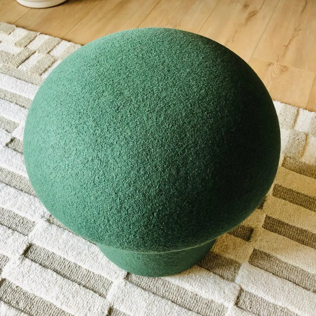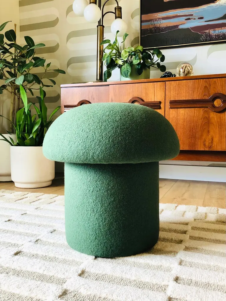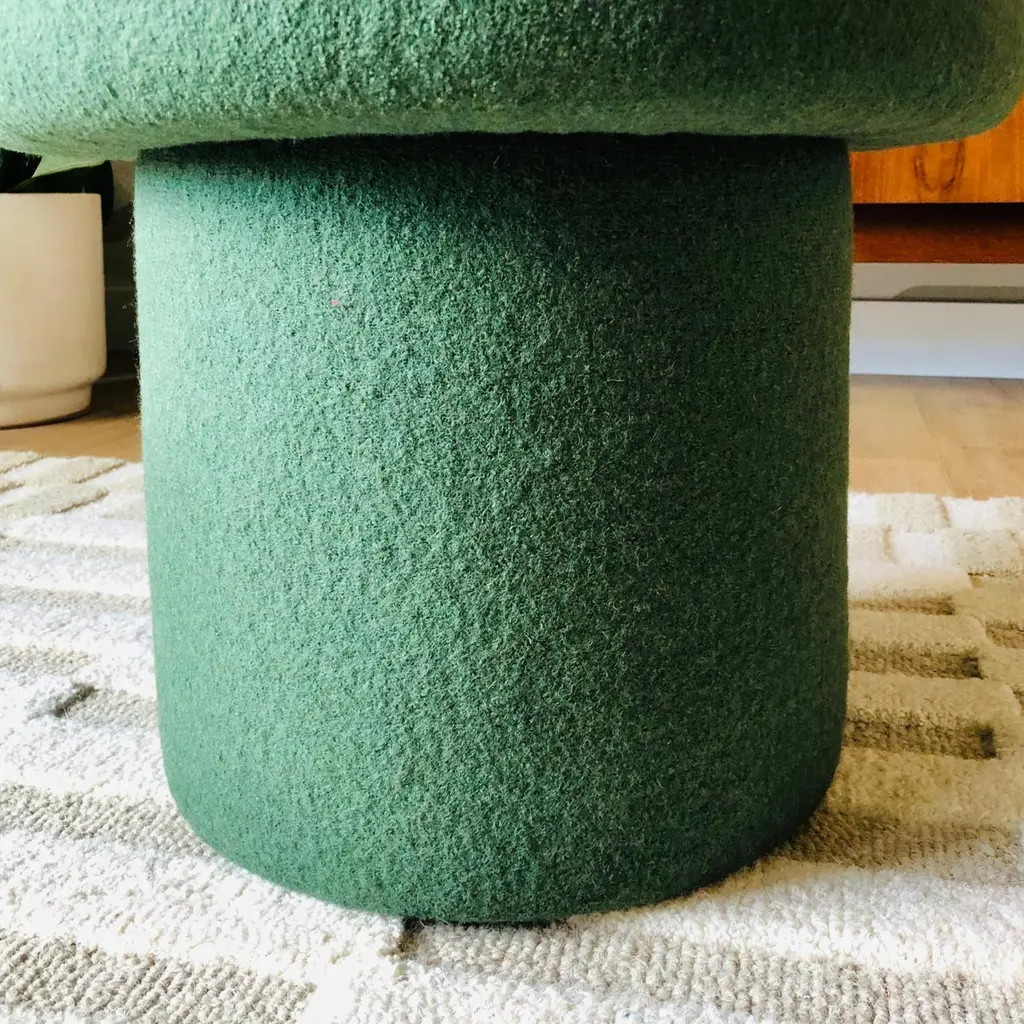 A handmade mushroom shaped ottoman, upholstered in "Moss" green wool fabric. Perfect for using as a footstool or extra occasional seating. A comfortable cushioned seat and sculptural accent piece. Earth friendly OEKO-TEX 100% boiled wool fabric.PLEASE NOTE:Color variations may occur due to different monitor settings. Colors shown on screen may be a close match, but please do not rely on them to be an exact match. Please feel free to send a message with your address to request a fabric sample prior to purchasing if you need to verify the color.