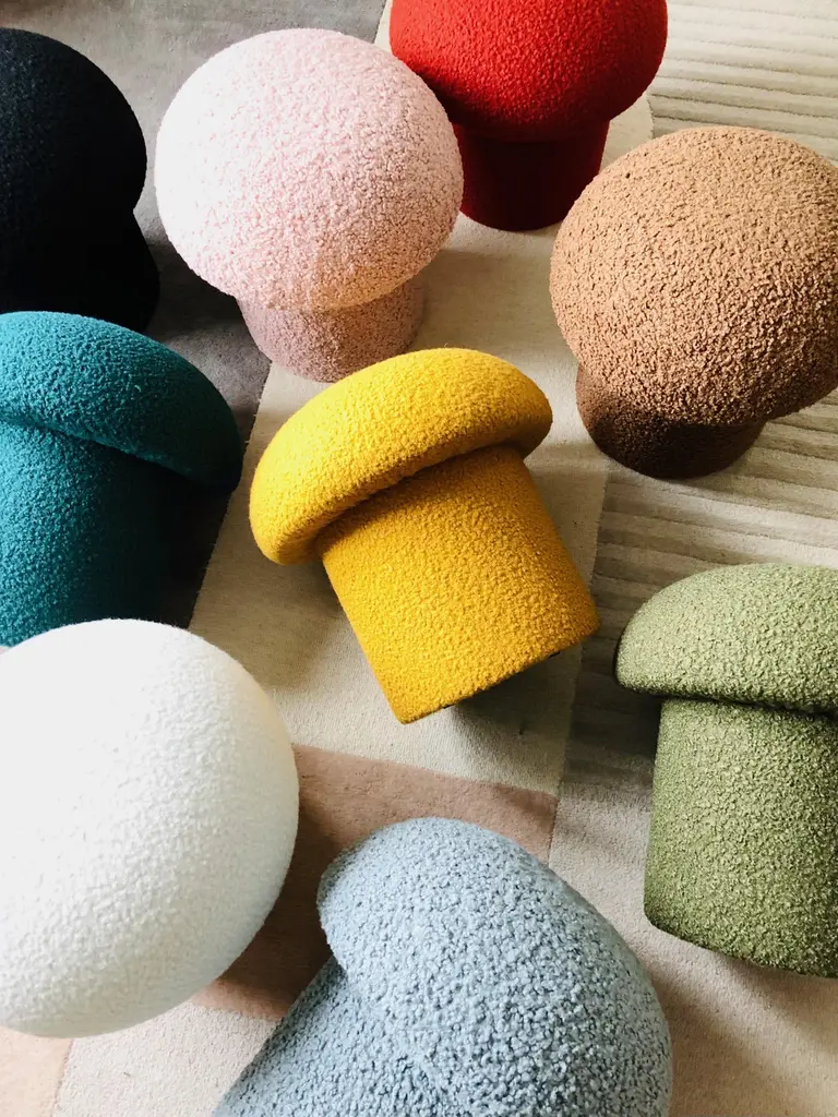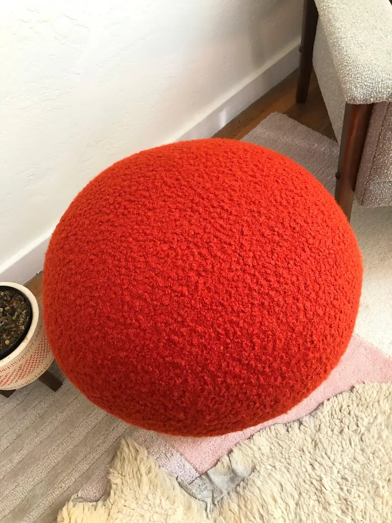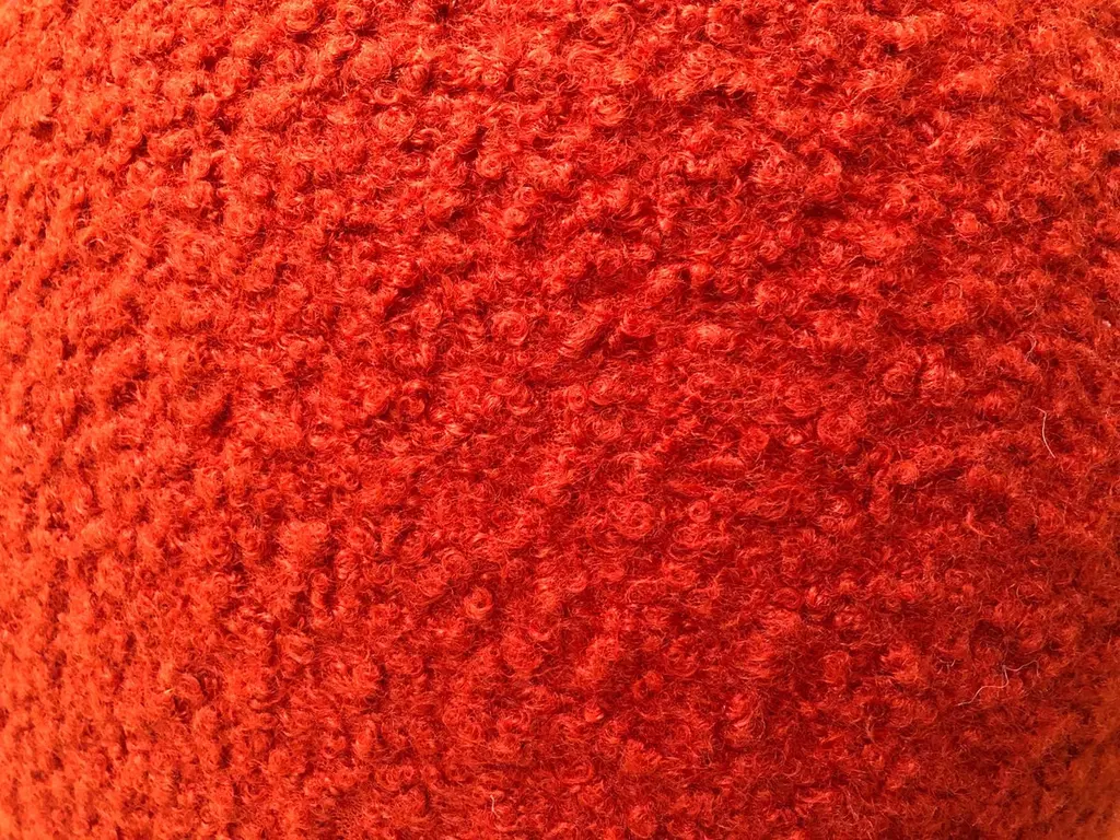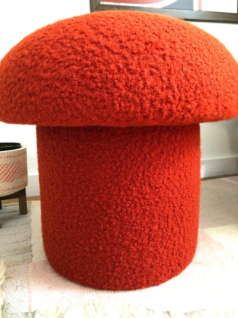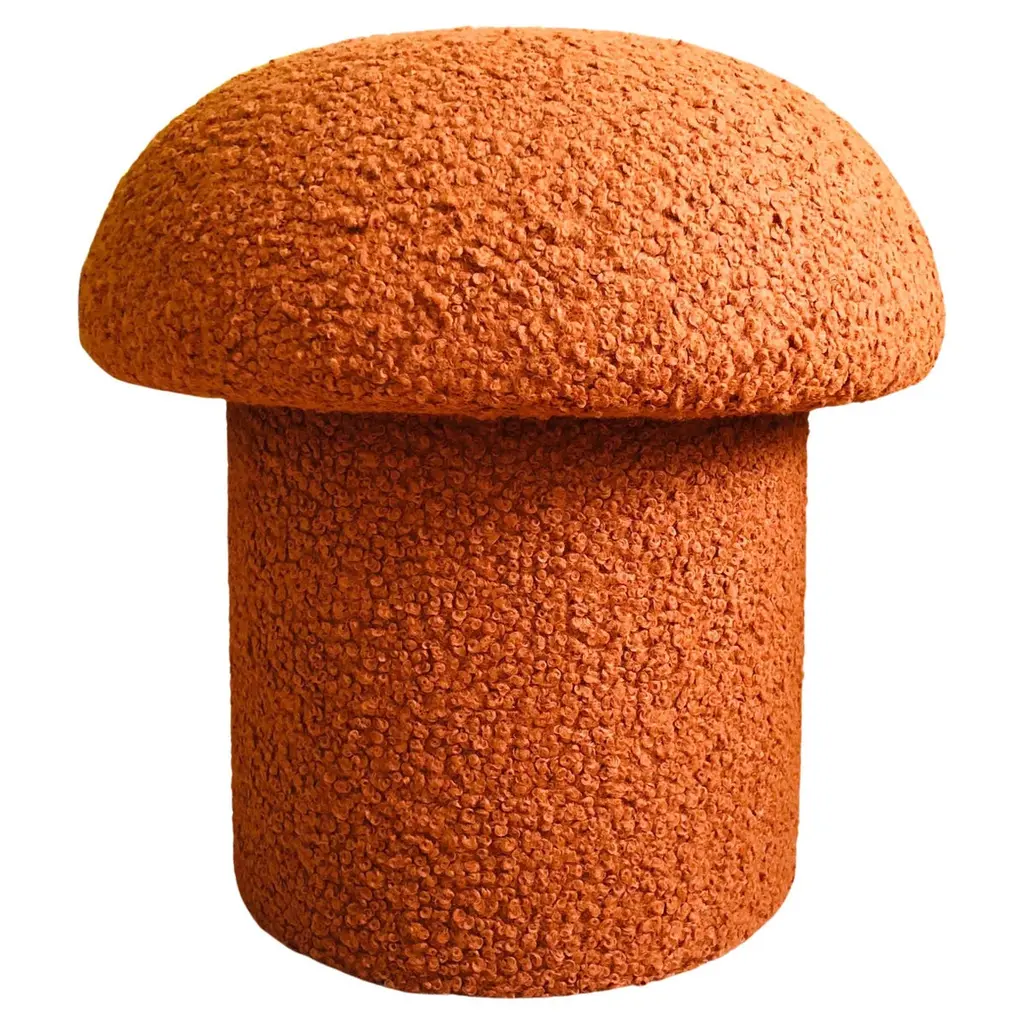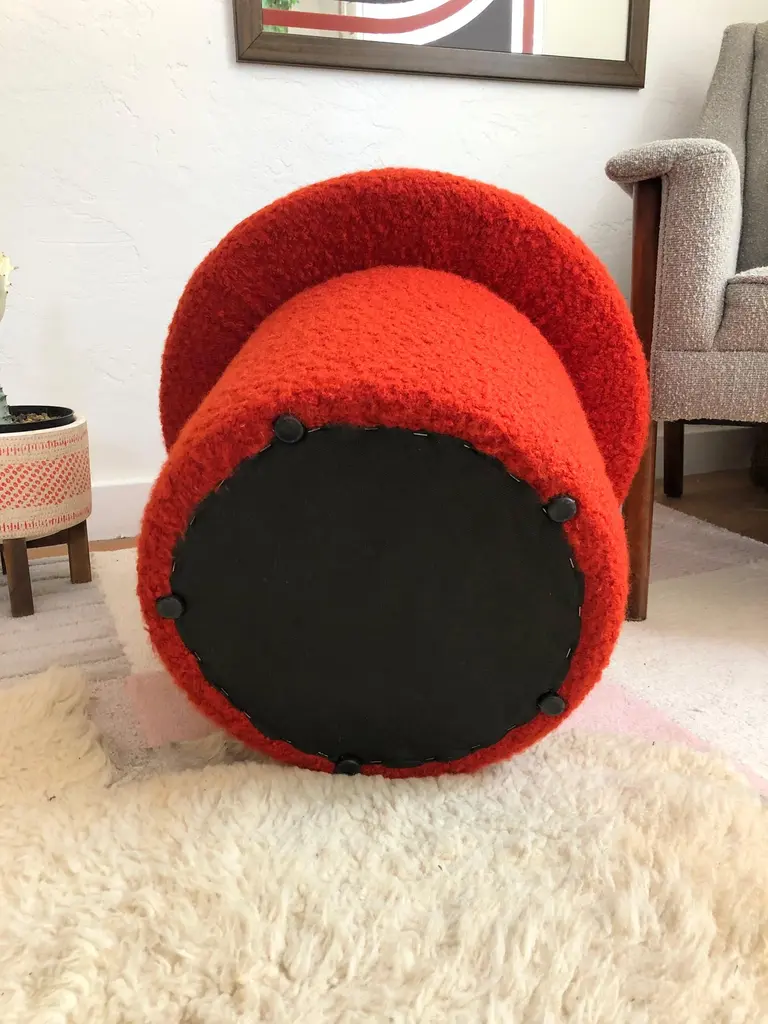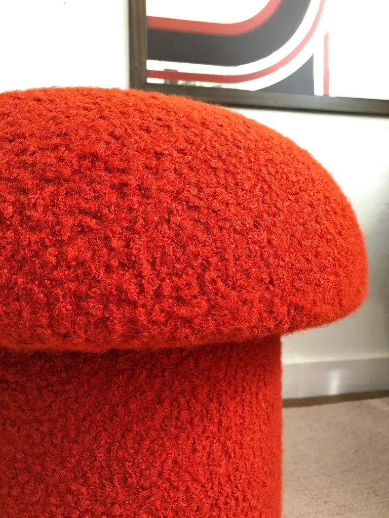 A handmade mushroom shaped ottoman, upholstered in a red-orange colored curly boucle fabric. Perfect for using as a footstool or extra occasional seating. A comfortable cushioned seat and sculptural accent piece.Mushroom ottomans are made to order, customizations are not possible.PLEASE NOTE:Color variations may occur due to different monitor settings. Colors shown on screen may be a close match, but please do not rely on them to be an exact match. Please feel free to send a message with your address to request a fabric sample prior to purchasing if you need to verify the color.