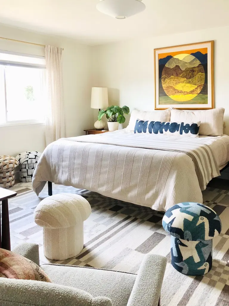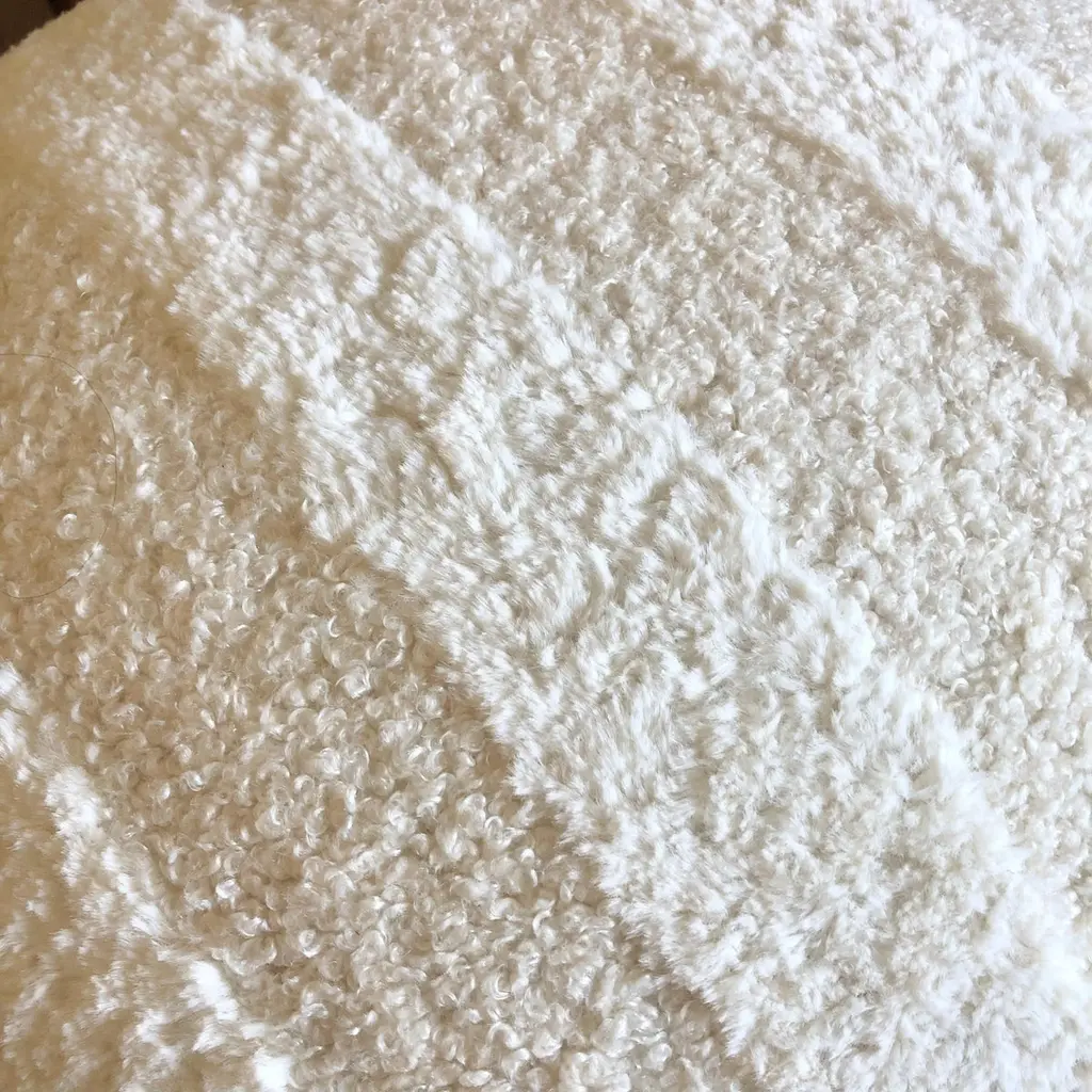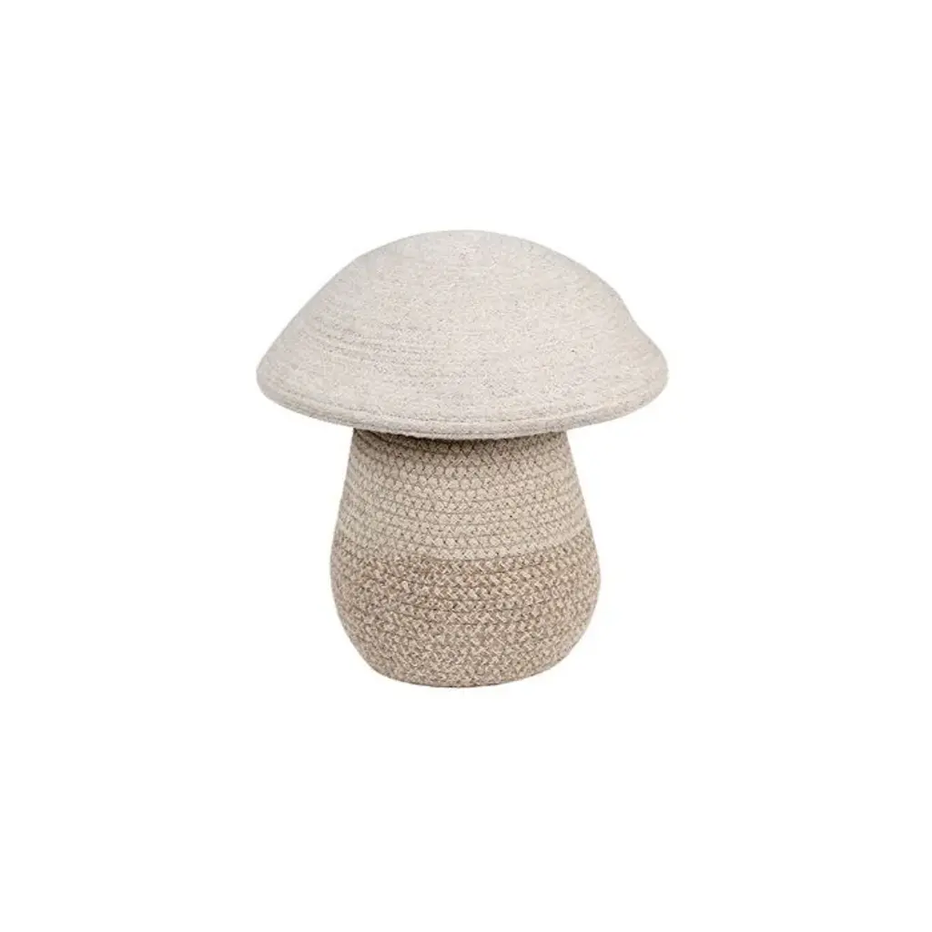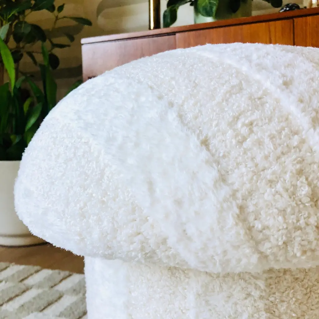 A handmade mushroom shaped ottoman, upholstered in a striped plush fabric. This plush fabric consists of alternating neutral bands of white plush and curly ivory boucle. Perfect for using as a footstool or extra occasional seating. A comfortable cushioned seat and sculptural accent piece. Tamed is a synthetic fabric.