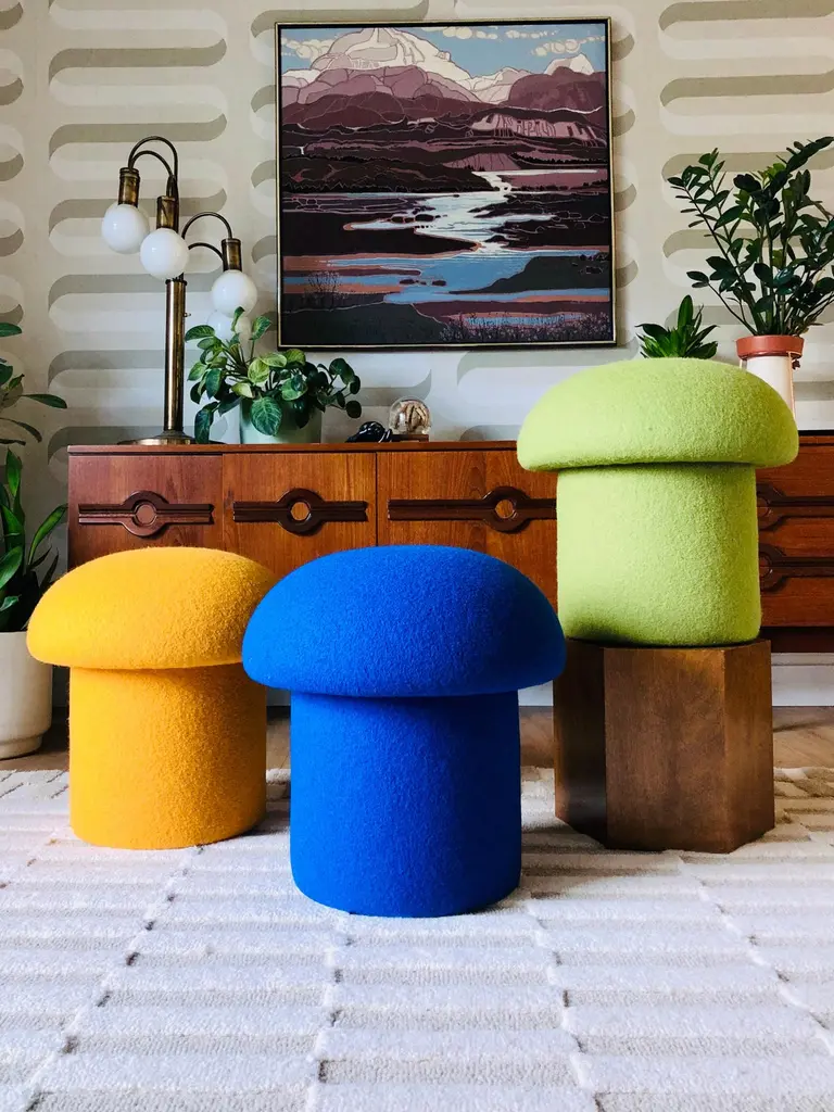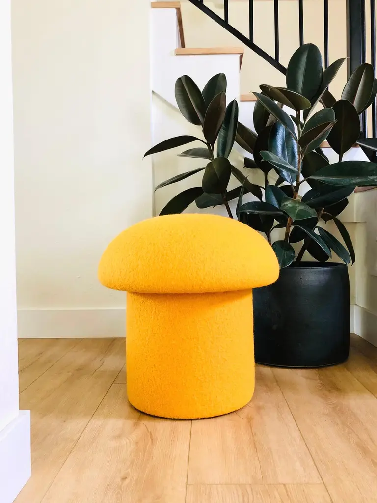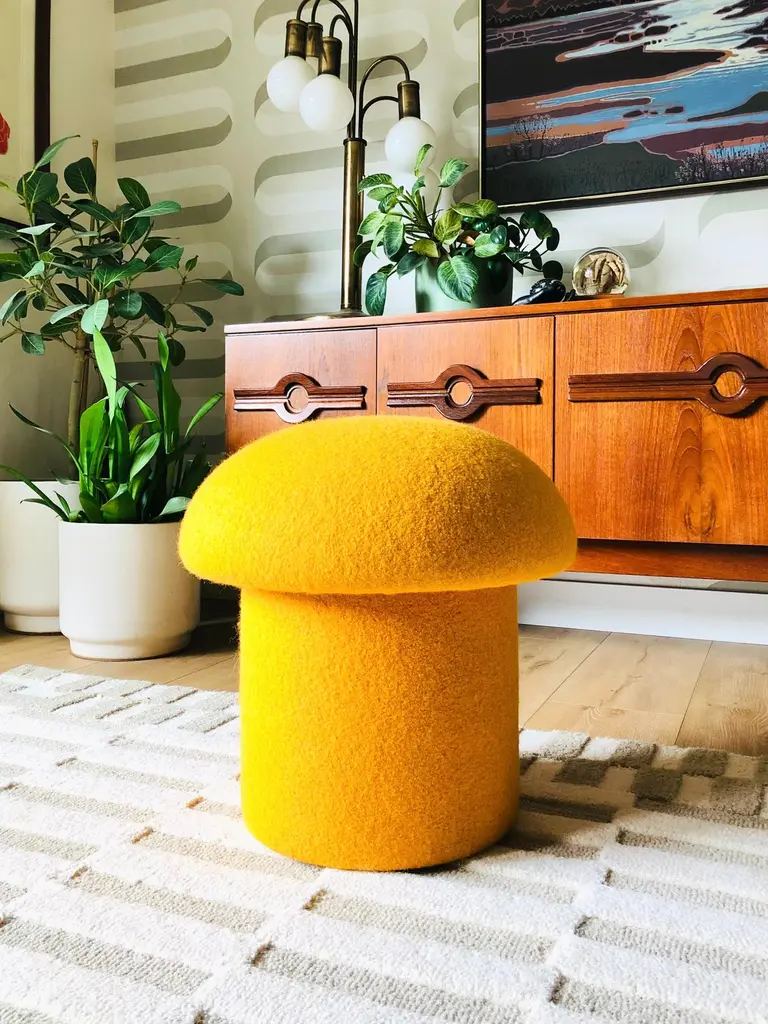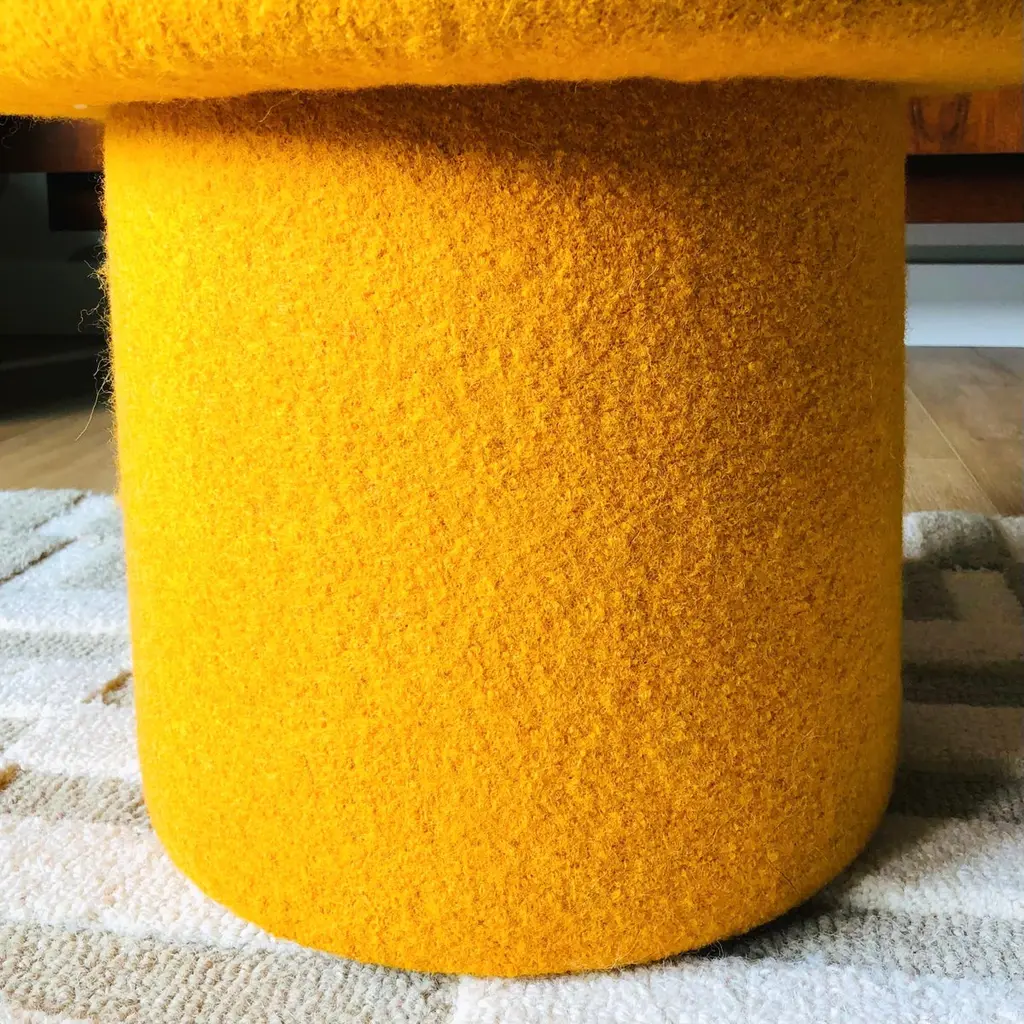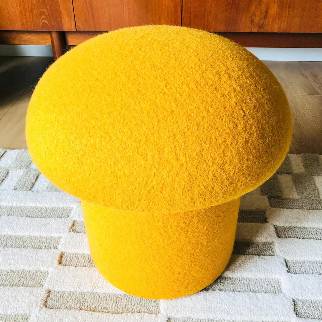 A handmade mushroom shaped ottoman, upholstered in "Saffron" yellow wool fabric. Perfect for using as a footstool or extra occasional seating. A comfortable cushioned seat and sculptural accent piece. Earth friendly OEKO-TEX 100% boiled wool fabric.PLEASE NOTE:Color variations may occur due to different monitor settings. Colors shown on screen may be a close match, but please do not rely on them to be an exact match. Please feel free to send a message with your address to request a fabric sample prior to purchasing if you need to verify the color.