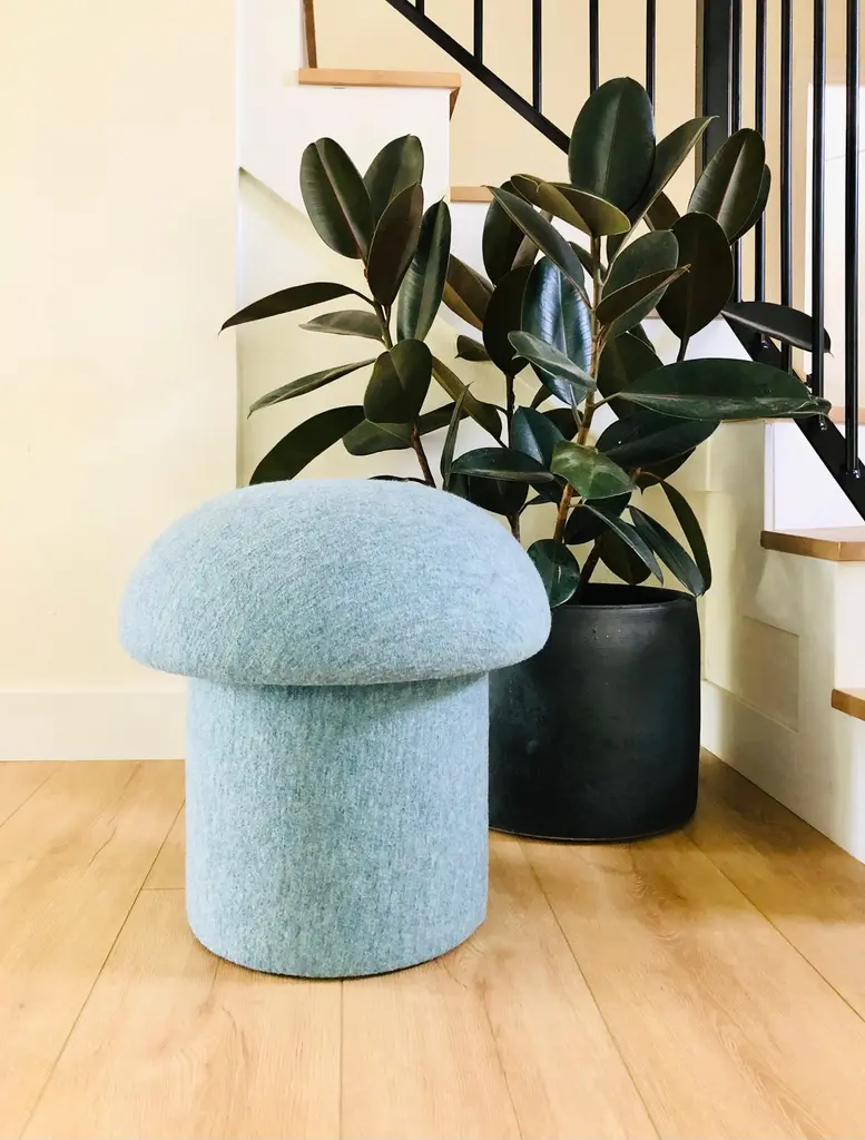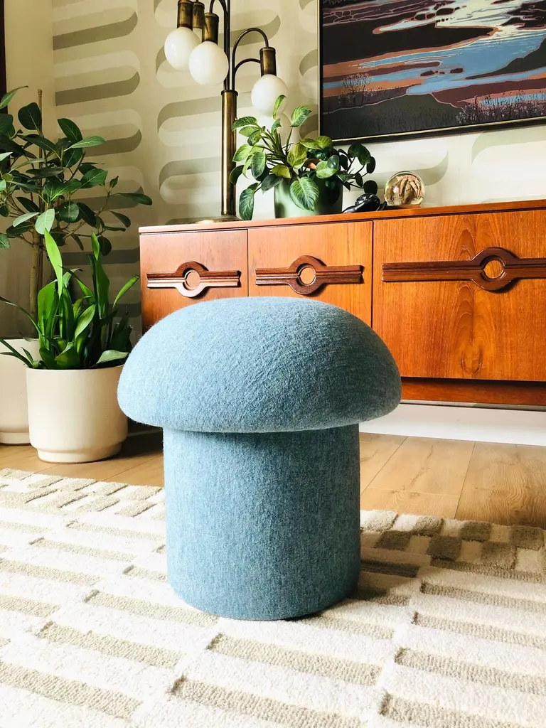 A handmade mushroom shaped ottoman, upholstered in "Sky Melange" light blue wool fabric. This melange fabric has beautiful variation within the fibers, please see close up pictures. Perfect for using as a footstool or extra occasional seating. A comfortable cushioned seat and sculptural accent piece. Earth friendly OEKO-TEX 100% boiled wool fabric.PLEASE NOTE:Color variations may occur due to different monitor settings. Colors shown on screen may be a close match, but please do not rely on them to be an exact match. Please feel free to send a message with your address to request a fabric sample prior to purchasing if you need to verify the color.