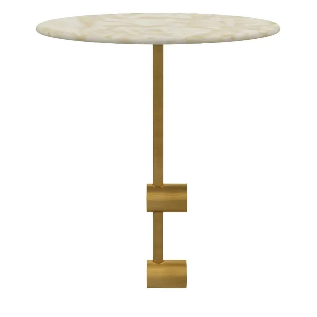 Pure shape and lines, an independent pouf with the possibility of being composed and decomposed according to the functional and aesthetic needs related to the new trends of living. It is equipped with a side table included in the price through a simple plug-in system. This table (40x40x45 cm) boasts a luxurious marble top with superb yellow traceries that harmonize with the brushed finish of the brass frame. Designer: La Récréation-P.Angelo Orecchioni Arch.