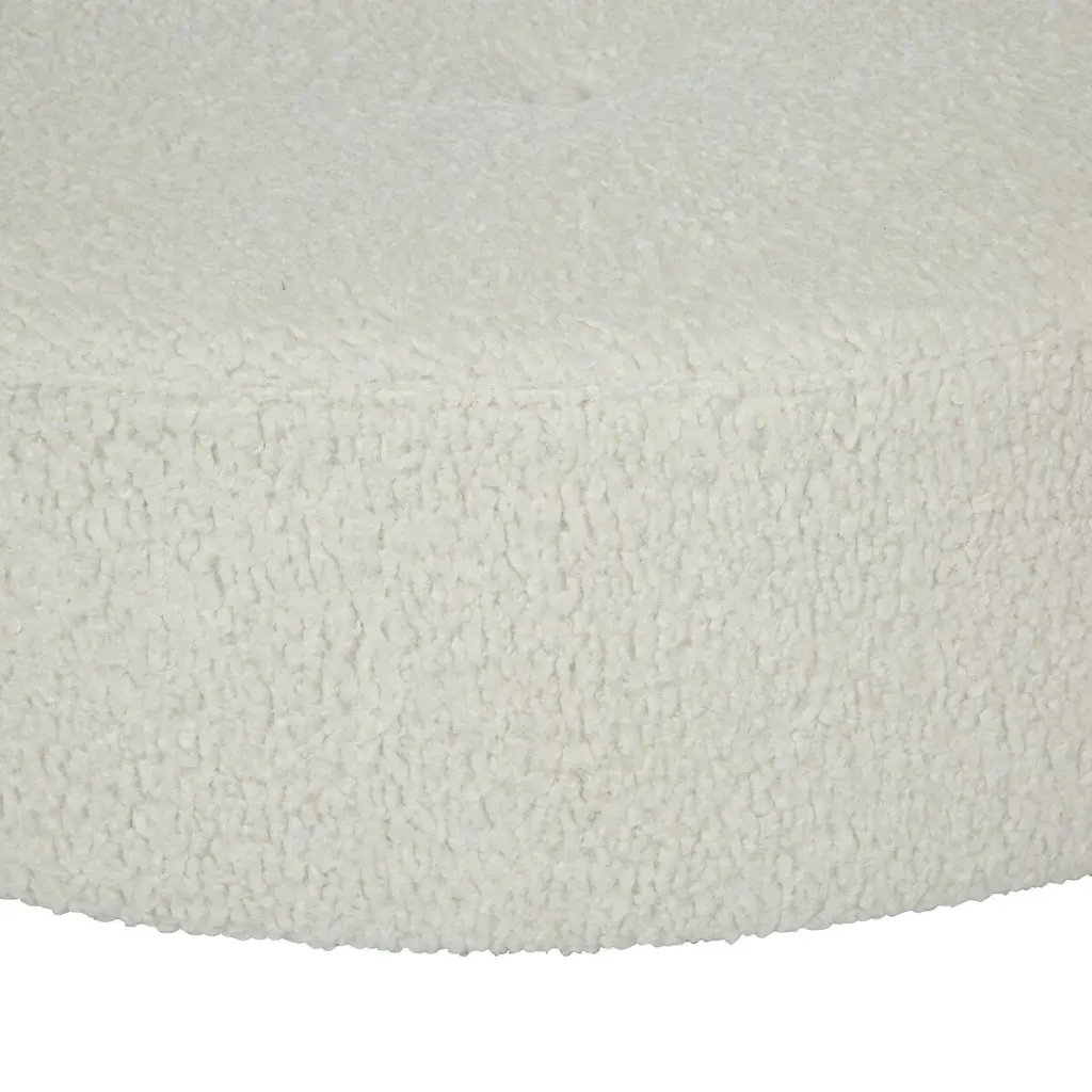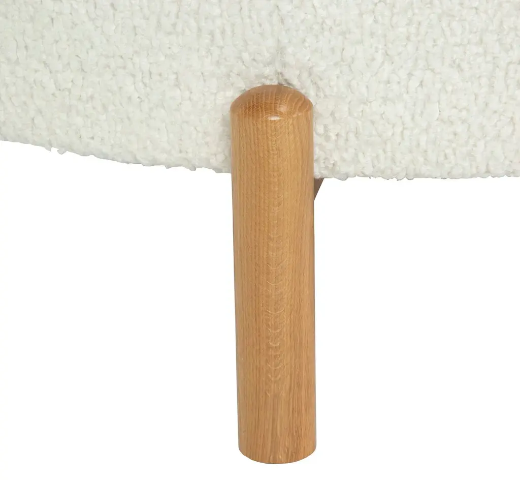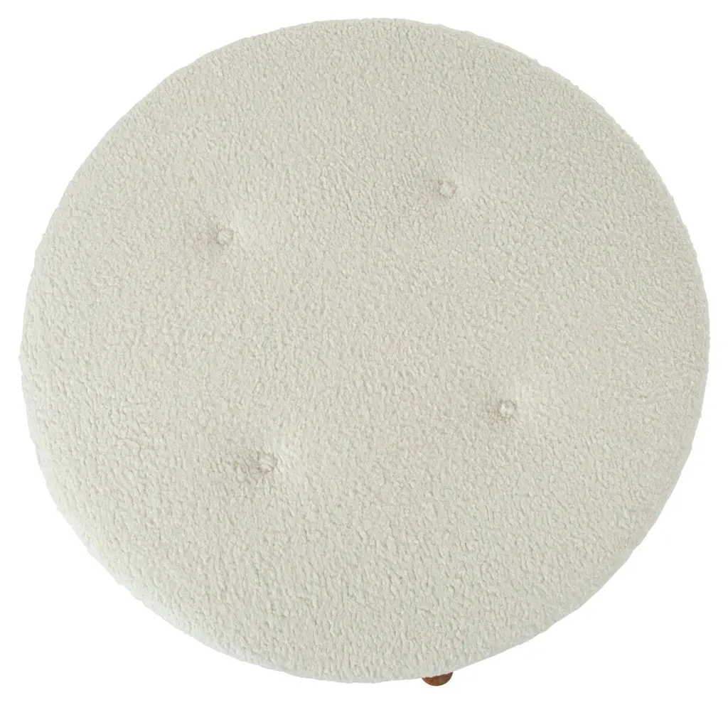 Simple and chic, this round ottoman pairs plush bouclé-like upholstery with pale wood legs. It can serve as a seat, a footrest, or when topped with a tray, a coffee table.