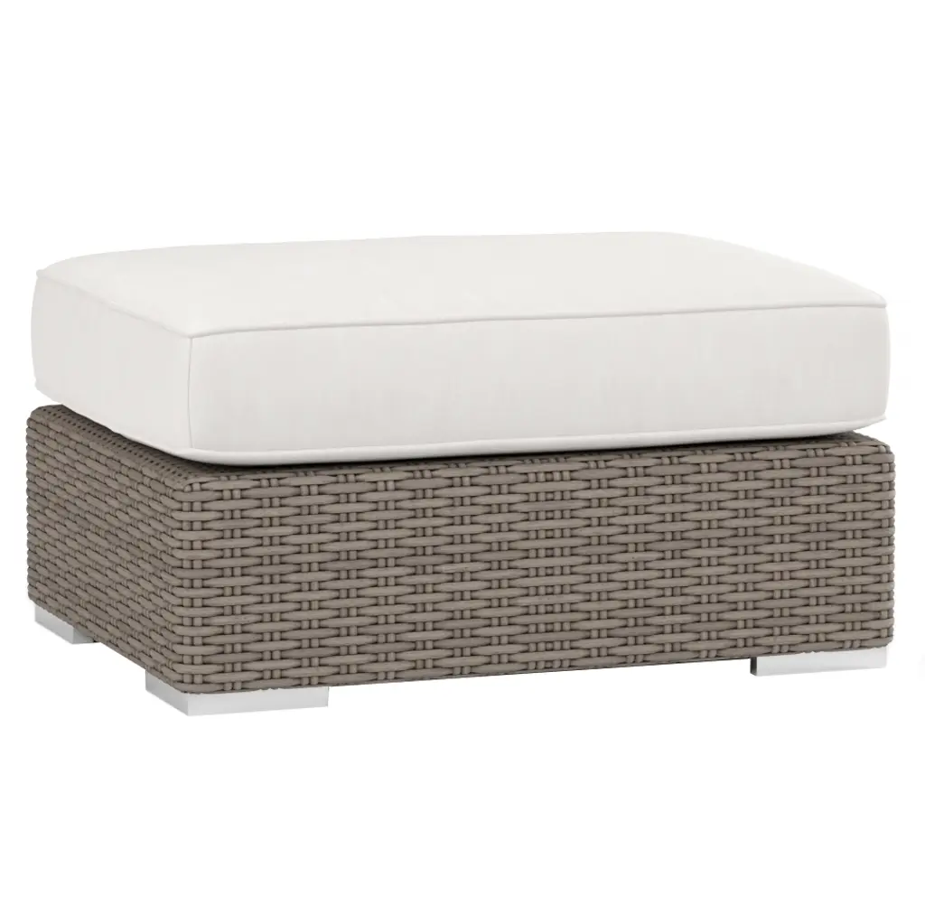 The Neptune Ottoman features transitional lines and outstanding comfort with plush, fast-drying cushions. It is constructed with a fully welded powder-coated aluminum frame and wrapped in beautiful resin wicker. The ottoman is stocked in premium fabric and includes weather-resistant, high-resiliency density cushions. It incorporates Progressive Springing System technology and is built with commercial quality construction.