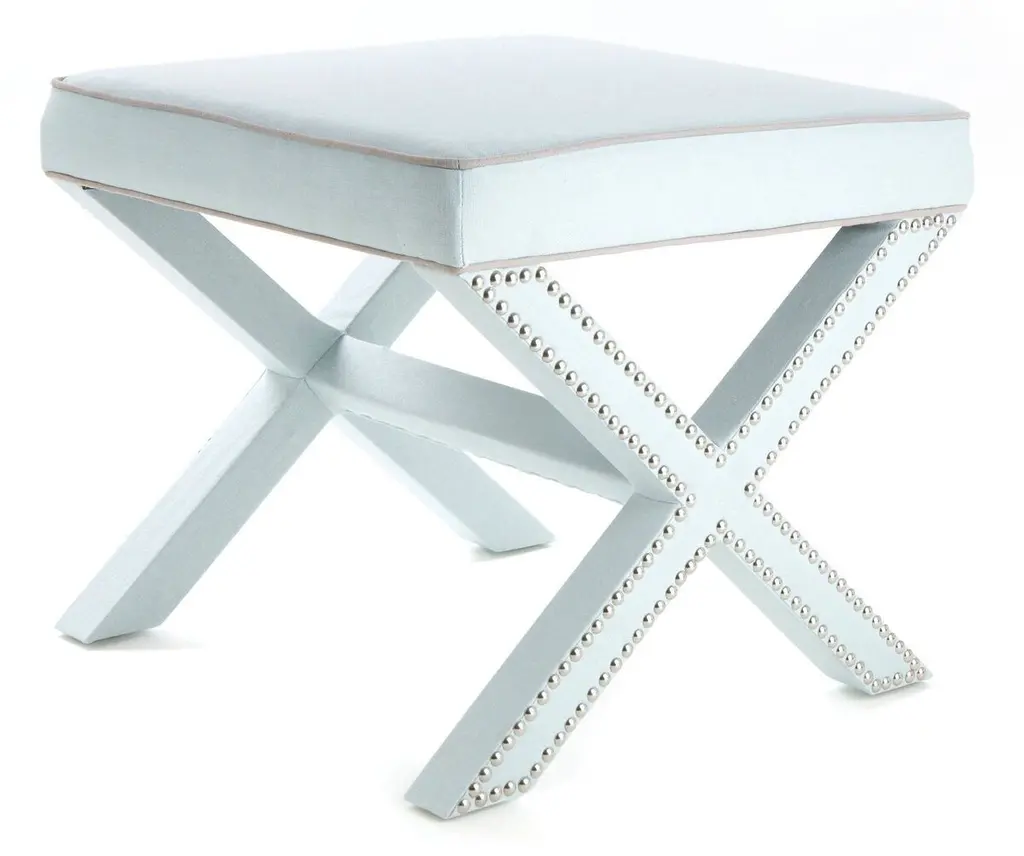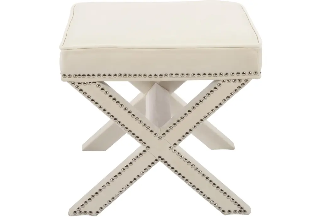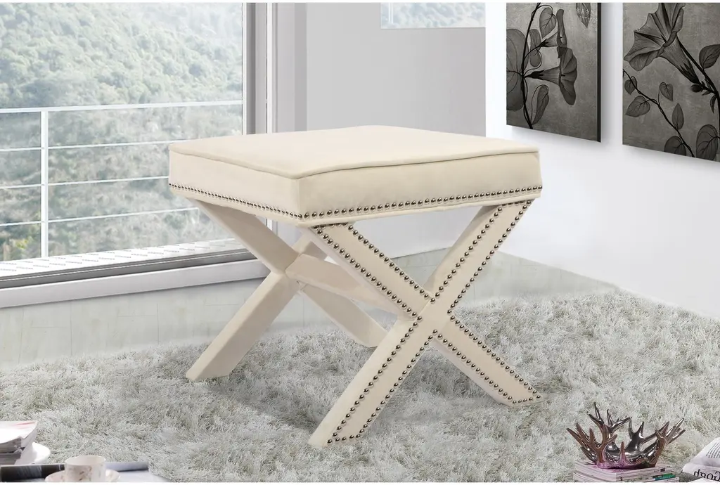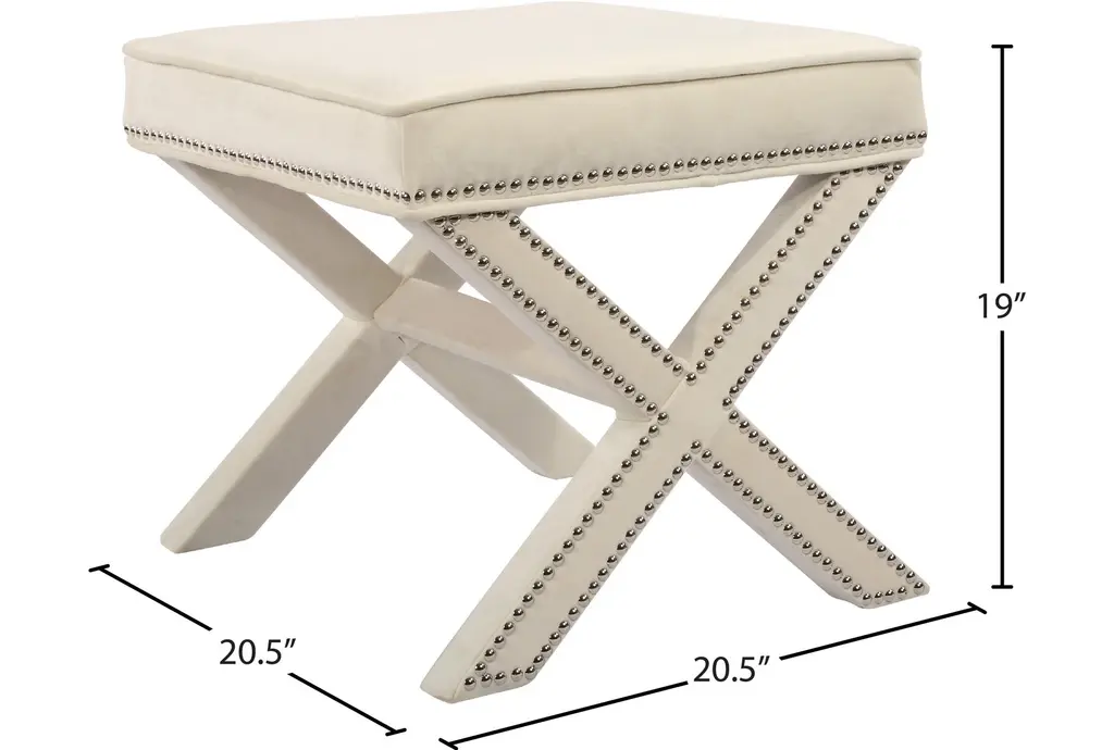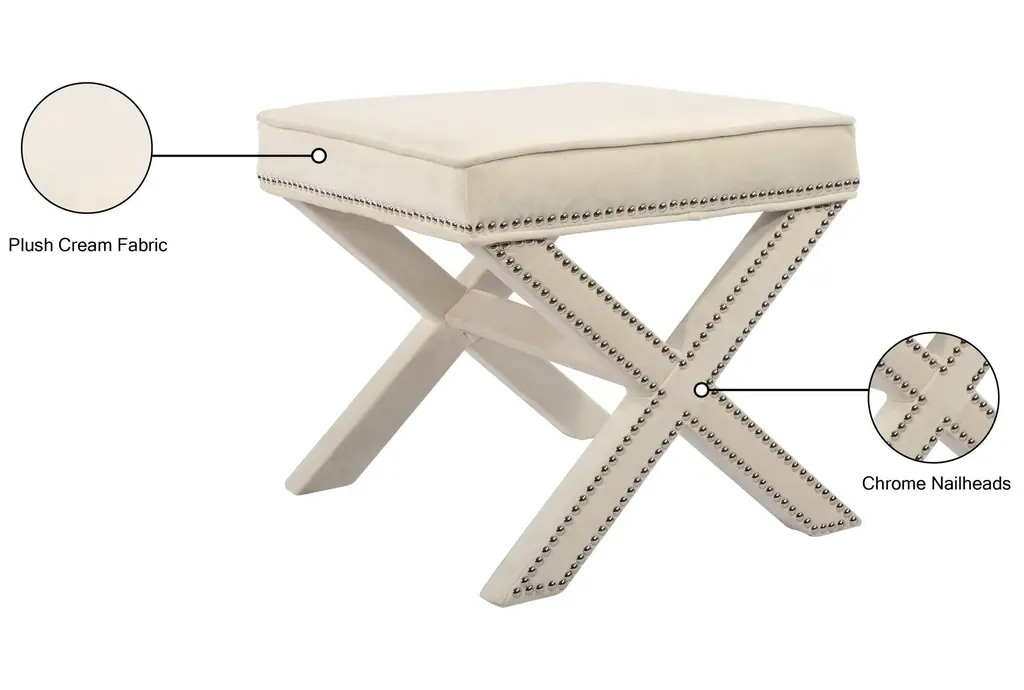 Nixon Cream Velvet Upholstered Ottoman/Bench adds luxurious versatility to modern spaces with its elegant cream upholstery and chrome nailhead accents, making it a standout furniture piece.