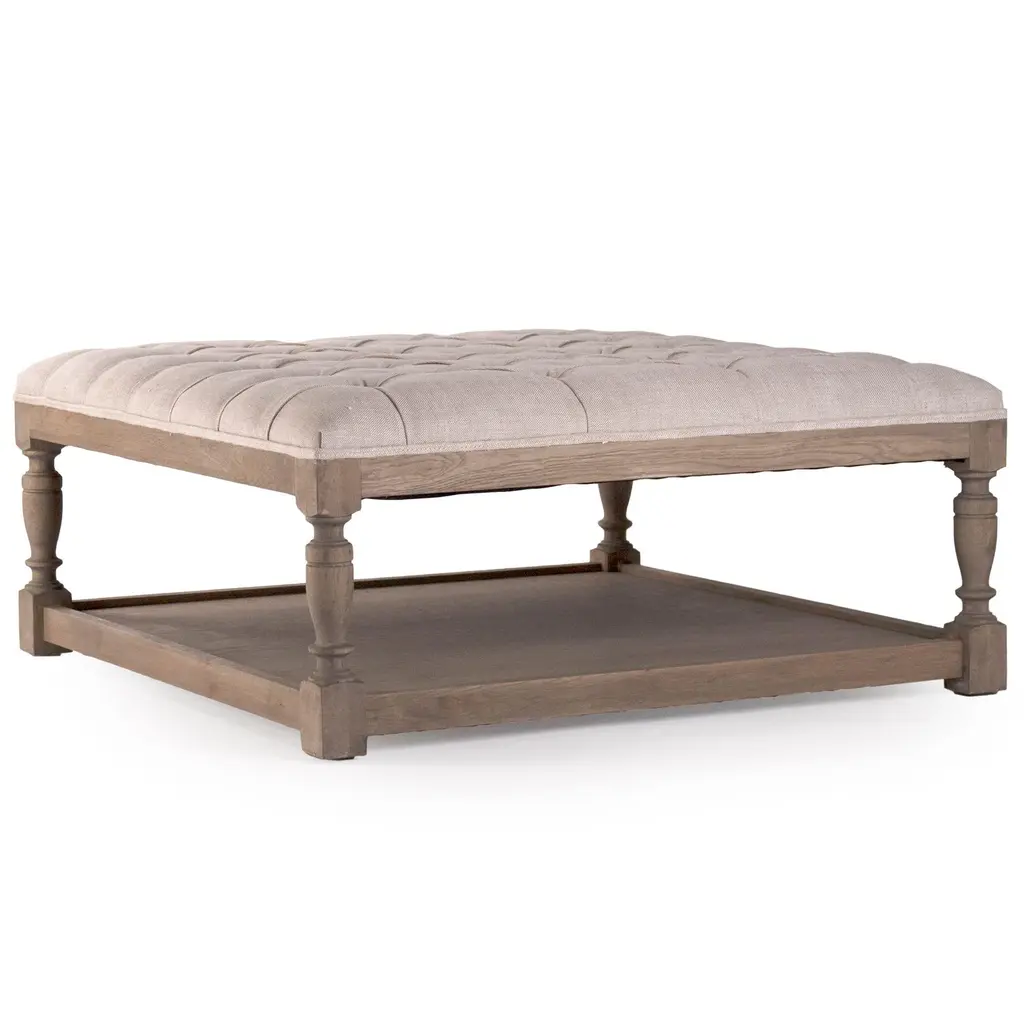 Square tufted ottoman with four crafted legs atop a shelf for additional storage space upholstered in cream natural linen on reclaimed oak frame.