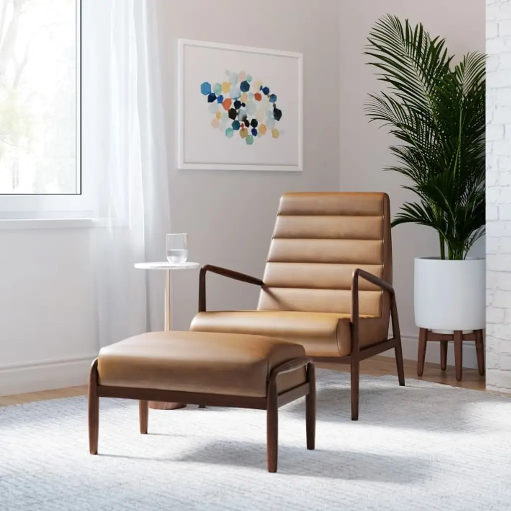 Covered in top-grain leather, our Wilder Ottoman creates an effortlessly cool spot to rest your feet. Pair it with its matching armchair (sold separately) for the ultimate lounge look. Open Box items may show light scratches on legs, fabric pulls and slight fabric wear, and furniture pieces may require tightening or leveling. Items do not come in their original packaging. Sold at a deep discount. All sales are final. Available in your choice of genuine top-grain leather or animal-friendly vegan leather. Solid pine and engineered wood frame. Oak legs in a Walnut finish. All wood is kiln-dried for added durability. Webbed seat support. Foam and fiber filled seat cushion. Fixed cushion. Coordinates with Wilder Leather Chair (sold separately). Made in Vietnam.